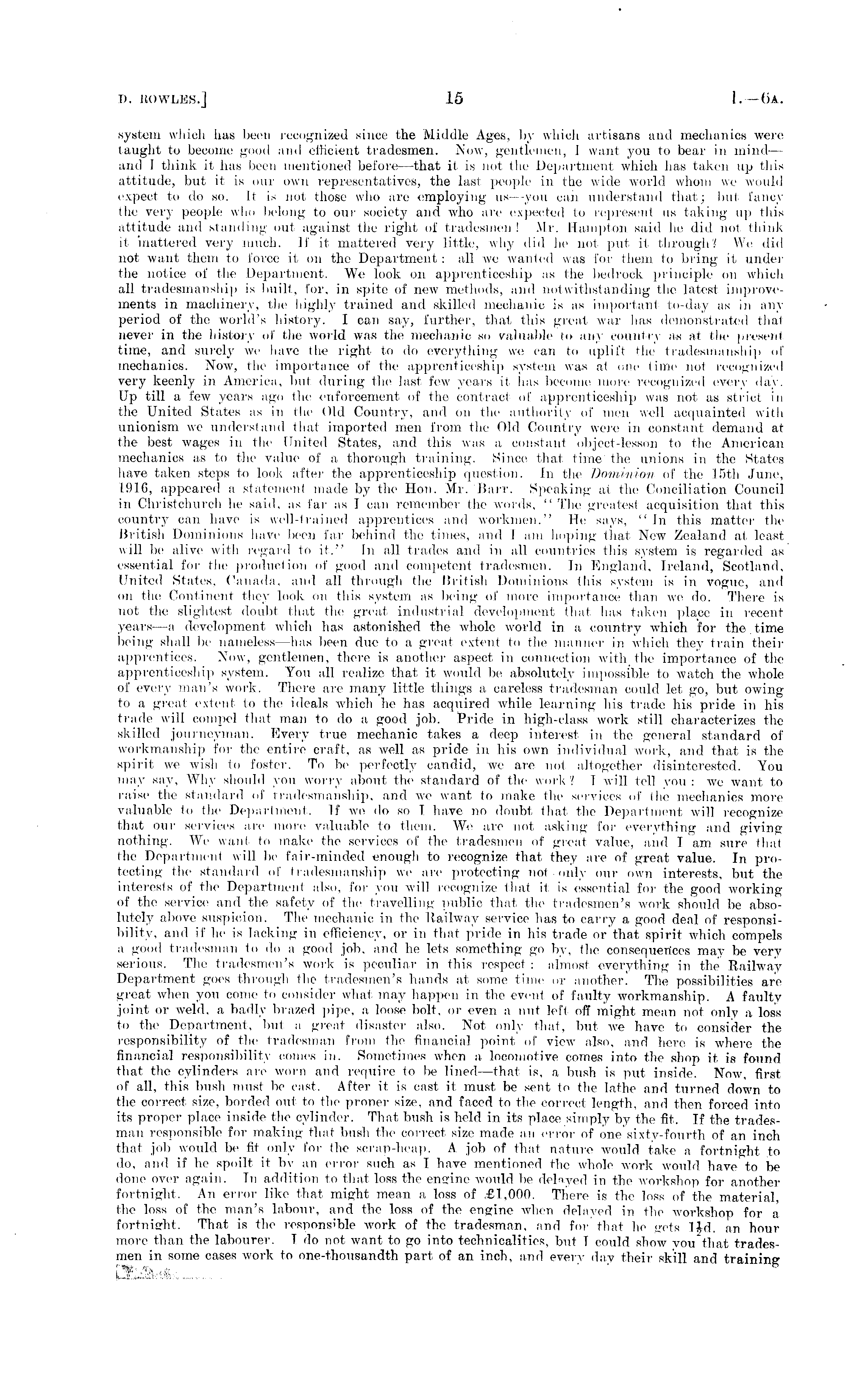 system which has been recognized since the Middle Ages, by which artisans and mechanics were taught to become good and efficient tradesmen. Now, gentlemen, 1 want you to bear in mind — and I think it has been mentioned before —that it is not the Department which has taken up this attitude, but it is our own representatives, the last people in the wide world whom we would expect to do so. It is not those who are employing us —you can understand that; but fancy the very people who belong to our society and who are expected to represent us taking up this attitude and standing out against the right of tradesmen! Mr. Hampton said he did not think it mattered very much. If it mattered very little, why did lie not put it through? We did not want them to force it on the Department : all we wanted was for them to bring it under the notice of the Department. We look on apprenticeship as the bedrock principle on which all tradesmanship is built, for, in spite of new methods, and notwithstanding the latest improvements in machinery, the highly trained and skilled mechanic is as important to-day as in any period of the world's history. I can say, further, that this great war has demonstrated that never in the history of the world was the mechanic so valuable to any country as at the present time, and surely we have the right to do everything we can to uplift the tradesmanship of mechanics. Now, the importance of the apprenticeship system was at one time not recognized very keenly in America, but during the last few years it has become move recognized every day. Up till a few years ago the enforcement of the contract of apprenticeship was not as strict in the United States as in the Old Country, and on the authority of men well acquainted with unionism we understand that imported men from the Old Country were in constant demand at the best wages in the United States, and this was a constant object-lesson to the American mechanics as to the value of a thorough training. Since that time the unions in the States have taken steps to look after the apprenticeship question. In the Dominion of the 15th June, 1916, appeared a statement made bj' the Hon. Mr. Barr. Speaking at the Conciliation Council in Christchurch he said, as far as I can remember the words, " The greatest acquisition that this country can have is well-trained apprentices and workmen." He says, "In this matter the British Dominions have been far behind the times, and I am hoping that New Zealand at least will be alive witli regard to it." In all trades and in all countries this system is regarded as essential for the production of good and competent tradesmen. In England, Ireland, Scotland, United States, Canada, and all through the British Dominions this system is in vogue, and on the Continent they look on this system as being of more importance than we do. There is not the slightest doubt that the great industrial development that has taken place in recent years—a development which has astonished the whole world in a country which for the time being shall be nameless —-has been due to a great extent to the manner in which they train their apprentices. Now, gentlemen, there is another aspect in connection with the importance of the apprenticeship system. You all realize that it would be absolutely impossible to watch the whole of every man's work. There are many little things a careless tradesman could let go, but owing to a great extent to the ideals which he has acquired while learning his trade his pride in his trade will compel that man to do a good job. Pride in high-class work still characterizes the skilled journeyman. Every true mechanic takes a deep interest in the general standard of workmanship for the entire craft, as well as pride in his own individual work, and that is the spirit we wish to foster. To be perfectly candid, we are not altogether disinterested. You may say, Why should you worry about the standard of the work? T will tell you: we want to raise the standard of tradesmanship, and we want to make the services of the mechanics more valuable to the Department. If wo do so I have no doubt that the Department will recognize that our services are more valuable to them. Wo are not asking for everything and giving nothing. We want to make the services of the tradesmen of great value, and I am sure that the Department will be fair-minded enough to recognize that they are of great value. In protecting the standard of tradesmanship we are protecting not only our own interests, but the interests of the Department also, for you will recognize that it is essential for the good working of the service and the safety of the travelling public that the tradesmen's work should be absolutely above suspicion. The mechanic in the Railway service has to carry a good deal of responsibility, and if he is lacking in efficiency, or in that pride in his trade or that spirit which compels a good tradesman to do a good job, and he lets something go by, the consequences may be very serious. The tradesmen's work is peculiar in this respect : almost everything in the Railway Department goes through the tradesmen's hands at some time or another. The possibilities are great when you come to consider what may happen in the event of faulty workmanship. A faulty joint or weld, a badly brazed pipe, a loose bolt, or even a nut left off might mean not only a loss to the Department, but a great disaster also. Not only that, but we have to consider the responsibility of the tradesman from the financial point of view also, and here is where the financial responsibility comes in. Sometimes when a locomotive comes into the shop it is found that the cylinders are worn and require to be lined—that is, a bush is put inside. Now, first of all, this bush must be cast. After it is cast it must be sent to the lathe and turned down to the correct size, borded out to the proper size, and faced to the correct length, and then forced into its proper place insi