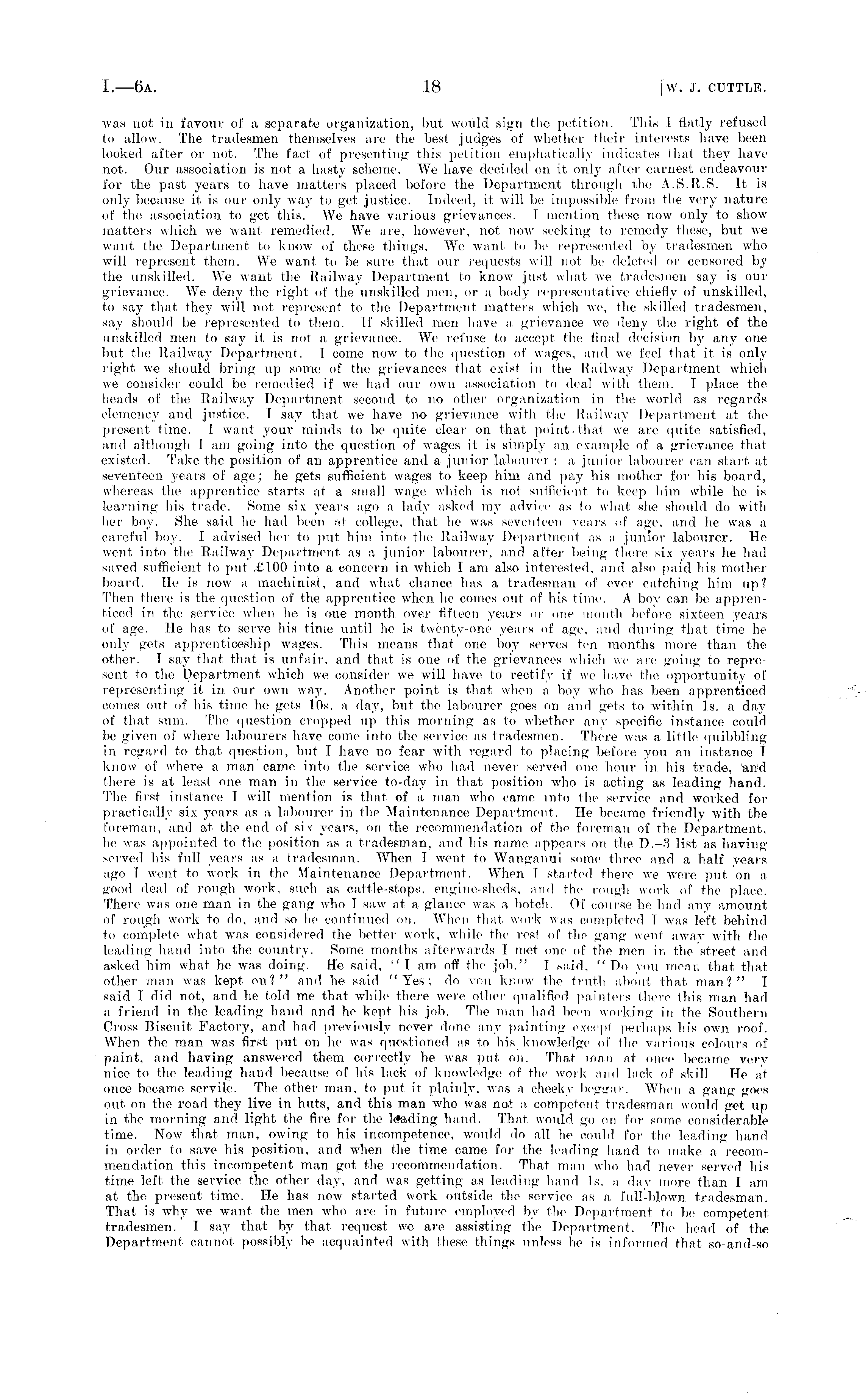was not in favour of a separate organization, but would sign the petition. This 1 flatly refused to allow. The tradesmen themselves are the best judges of whether their interests have been looked after or not. The fact of presenting this petition emphatically indicates that they have not. Our association is not a hasty scheme. We have decided on it only after earnest endeavour for the past years to have matters placed before the Department through the A.S.R.S. It is only because it is our only way to get justice. Indeed, it will be impossible from the very nature of the association to get this. We have various grievances. I mention these now only to show matters which we want remedied. We are, however, not now seeking to remedy these, but we want the Department to know of these things. We want to be represented by tradesmen who will represent them. We want to be sure that our requests will not be deleted of censored by the unskilled. We want the Railway Department to know just what we tradesmen say is our grievance. We deny the right of the unskilled men, or a body representative chiefly of unskilled, to say that they will not represent to the Department matters which we, the skilled tradesmen, say should be represented to them. If skilled men have a grievance we deny the right of the unskilled men to say it is not a grievance. We refuse to accept the final decision by any one but the Railway Department. I come now to the question of wages, and we feel that it is only right we should bring up some of the grievances that exist in the Railway Department which we consider could be remedied if we had our own association to deal with them. I place the heads of the Railway Department second to no other organization in the world as regards clemency and justice. I say that we have no grievance with the Railway Department at the present time. I want your minds to be quite clear on that point.that we are quite satisfied, and although I am going into the question of wages it is simply an example of a grievance that existed. Take the position of an apprentice and a junior labourer - a junior labourer can start at seventeen years of age; he gets sufficient wages to keep him and pay his mother for his board, whereas the apprentice starts at a small w T age which is not sufficient to keep him while he is learning his trade. Some six years ago a lady asked my advice as to what she should do with her boy. She said he had been at college, that he was seventeen years of age, and he was a careful boy. I advised her to put him into the Railway Department as a junior labourer. He went into the Railway Department as a junior labourer, and after being there six years he had saved sufficient to put £100 into a concern in which I am also interested, and also paid his mother board. He is now a machinist, and what chance has a tradesman of ever catching him up? Then there is the question of the apprentice when he comes out of his time. A boy can be apprenticed in the service when he is one month over fifteen years or one month before sixteen years of age. He lias to serve his time until he is twenty-one years of age, and during that time he only gets apprenticeship wages. This means that one boy serves ten months more than the other. I say that that is unfair, and that is one of the grievances which we are going to represent to the Department which we consider we will have to rectify if we have the opportunity of representing it in our own way. Another point is that when a boy who has been apprenticed comes out of his time he gets 10s. a day, but the labourer goes on and gets to -within Is. a day of that sum. The question cropped up this morning as to whether any specific instance could be given of where labourers have come into the service as tradesmen. There was a little quibbling in regard to that question, but I have no fear with regard to placing before you an instance I know of where a man came into the service who had never served one hour in his trade, 'arid there is at least one man in the service to-day in that position who is acting as leading hand. The first instance I will mention is that of a man who came into the service and worked for practically six years as a labourer in the Maintenance Department. He became friendly with the foreman, and at the end of six years, on the recommendation of the foreman of the Department, he was appointed to the position as a tradesman, and his name appears on the D.-3 list as having served his full years as a tradesman. When I went to Wanganui some three and a half years ago T went to work in the Maintenance Department. When T started there we were put on a good deal of rough work, such as cattle-stops, engine-sheds, and the rough work of the place. There was one man in the gang who I saw at a glance was a botch. Of course he had any amount of rough work to do, and so he continued on. When that work was completed T was left behind to complete what was considered the better work, while the rest of the gang went away with the leading hand into the country. Some months afterwards I met one of the men ir, the street and asked him what he was doing. He said, " T am off the job." I said, "Do you mean that that other man was kept on? " and he said "Yes; do you know the truth about that man?" I said I did not, and he told me that while there were other qualified painters there this man had a friend in the leading hand and he kept his job. The man had been working in the Southern Cross Biscuit Factory, and had previously never done any painting except perhaps his own roof. When the man was first put on he was questioned as to his knowledge of the various colours of paint, and having answered them correctly he was put on. That man at once became verv nice to the leading hand because of his lack of knowledge of the work and lack of skill He at once became servile. The other man, to put it plainly, was a cheeky beggar. When a gang goes out on the road they live in huts, and thi