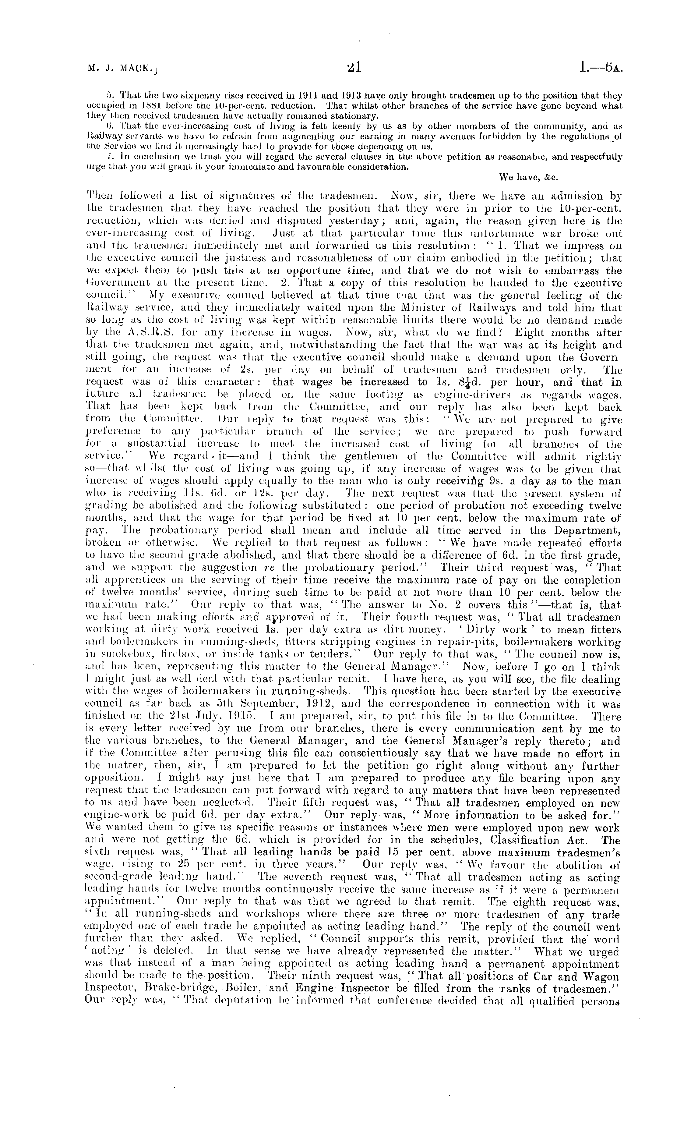5. That the two sixponny rises received in 1911 and 1913 have only brought tradesmen up to the position that they occupiod in 1881 before the iO-per-cent. reduction. That whilst other branches of the service have gone beyond what they then received tradesmen have actually remained stationary. 6. That the ever-increasing cost of living is felt keenly by us as by other members of the community, and as i.iailway servants we have to refrain from augmenting our earning in many avenues forbidden by the regulations of the Service we find it increasingly hard to provide for those depending on us. 7. In conclusion we trust you will regard the several clauses in the above petition as reasonable, and respectfully urge that you will grant it your immediate and favourable consideration. We have, &e. Then followed a list of signatures of the tradesmen. Now, sir, there we have an admission by the tradesmen that they have reached the position that they were in prior to the 10-per-cent. reduction, which was denied and disputed yesterday; and, again, the reason given here is the ever-increasing cost of living. Just at that particular time this unfortunate war broke out and the tradesmen immediately met and forwarded us this resolution : "1. That we impress on the executive council the justness and reasonableness of our claim embodied in the petition; that we expect them to push this at an opportune time, and that we do not wish to embarrass the Government at the present time. 2. That a copy of this resolution be handed to the executive council." My executive council believed at that time that that was the general feeling of the Railway service, and they immediately waited upon the Minister of Railways and told him that so long as the cost of living was kept within reasonable limits there would be no demand made by the A.S.Ii.S. for any increase in wages. Now, sir, what do we find? Eight months after that the tradesmen met again, and, notwithstanding the fact that the war was at its height and still going, the request was that the executive council should make a demand upon the Government for an increase of 2s. per day on behalf of tradesmen and tradesmen only. The request was of this character : that wages be increased to Is. B£d. per hour, and that in future all tradesmen be placed on the same footing as engine-drivers as regards wages. That has been kept back from the Committee, and our reply has also been kept back from the Committee. Our reply to that request was this: '"We are not prepared to give preference to any particular branch of the service; we are prepared to push forward for a substantial increase to meet the increased cost of living for all branches of the service." We regard.it—and 1 think the gentlemen of the Committee will admit rightly so—that whilst the cost of living was going up, if any increase of wages was to be given that increase of wages should apply equally to the man who is only receiving 9s. a day as to the man who is receiving lis. 6d. or 12s. per day. The next request was that the present system of grading be abolished and the following substituted : one period of probation not exceeding twelve months, and that the wage for that period be fixed at 10 per cent, below the maximum rate of pay. The probationary period shall mean and include all time served in the Department, broken or otherwise. We replied to that request as follows: "We have made repeated efforts to have the second grade abolished, and that there should be a difference of 6d. in the first grade, and we support the suggestion re the probationary period." Their third request was, " That all apprentices on the serving of their time receive the maximum rate of pay on the completion of twelve months' service, during such time to be paid at not more than 10 per cent, below the maximum rate." Our reply to that was, " The answer to No. 2 covers this " —that is, that we had been making efforts and approved of it. Their fourth request was, " That all tradesmen working at dirty work received Is. per day extra as dirt-money. ' Dirty work ' to mean fitters and boilermakers in running-sheds, fitters stripping engines in repair-pits, boilermakers working in smokebox, firebox, or inside tanks or tenders." Our reply to that was, " The council now is, and has been, representing this matter to the General Manager." Now, before Igo on I think I might just as well deal with that particular remit. I have here, as you will see, the file dealing with the wages of boilermakers in running-sheds. This question had been started by the executive council as far back as sth September, 1912, and the correspondence in connection with it was finished on the 21st July, 1915. lam prepared, sir, to put this file in to the Committee. There is every letter received by me from our branches, there is every communication sent by me to the various branches, to the General Manager, and the General Manager's reply thereto; and if the Committee after perusing this file can conscientiously say that we have made no effort in the matter, then, sir, 1 am prepared to let the petition go right along without any further opposition. I might say just here that I am prepared to produce any file bearing upon any request that the tradesmen can put forward with regard to any matters that have been represented to us and have been neglected. Their fifth request was, " That all tradesmen employed on new engine-work be paid 6d. per day extra." Our reply-was, " More information to be asked for." We wanted them to give us specific reasons or instances where men were employed upon new work and were not getting the 6d. which is provided for in the schedules, Classification Act. The sixth request was, " That all leading hands be paid 15 per cent, above maximum tradesmen's wage, rising to 25 per cent, in three years." Our reply was, "We favour the abolition of second-grade leading hand." The seventh request was, " That all tradesmen acting as acting leading hands for twe