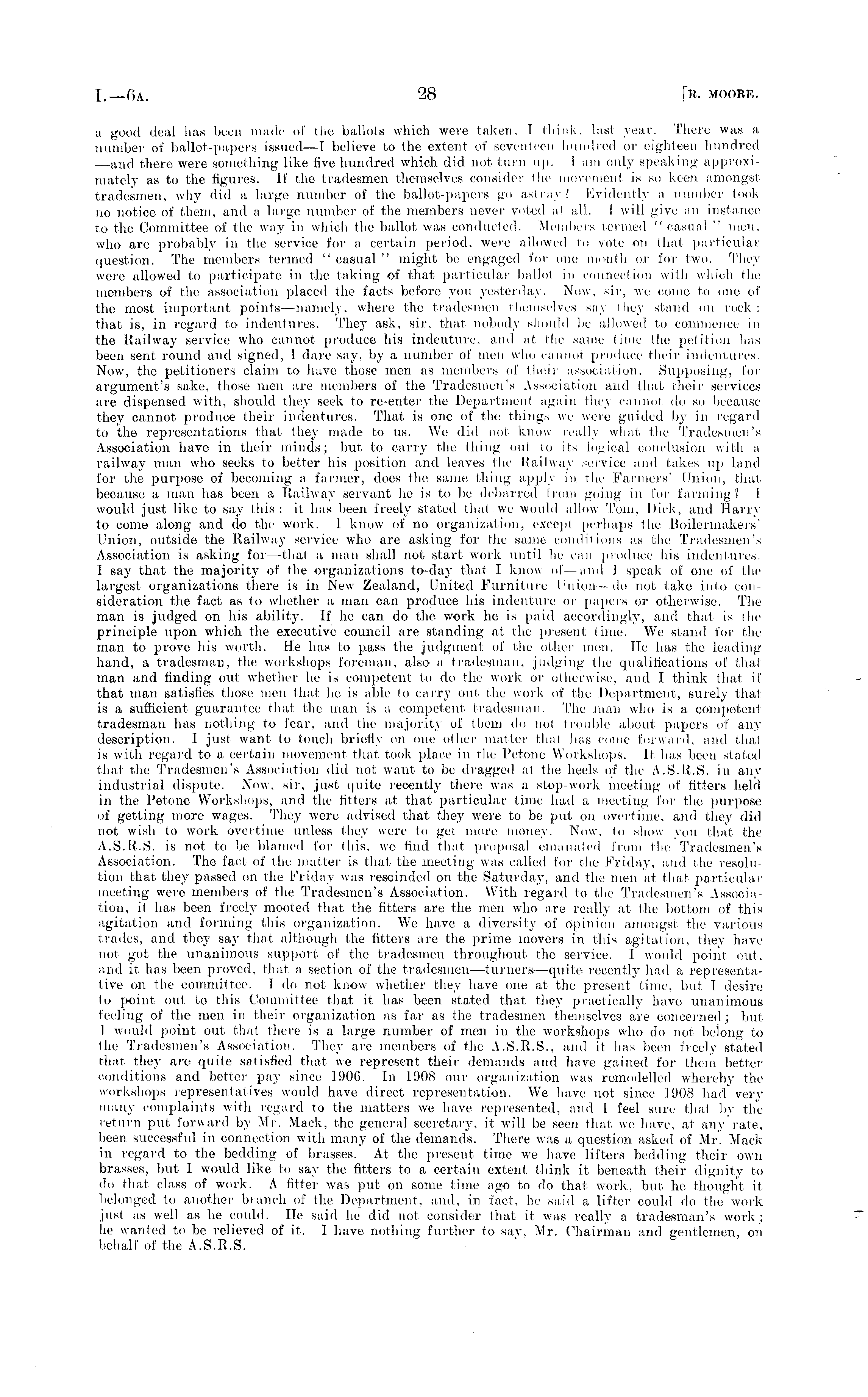 u good deal lias been made oi' the ballots which were taken, I think, last year. There was a number of ballot-papers issued—l believe to the extent of seventeen hundred or eighteen hundred —and there were something like five hundred which did not turn up. lam only speaking approximately as to the figures. If the tradesmen themselves consider the movement is so keen amongst tradesmen, why did a large number of the ballot-papers go astray I Evidently a number took no notice of them, and a large number of the members never voted at all. I will give an instance to the Committee of the way in which the ballot was conducted. Members termed " casual " men, who are probably in the service for a certain period, were allowed to vote on that particular question. The members termed " casual " might be engaged for one month or for two. They were allowed to participate in the taking of that particular ballot in connection with which the members of the association placed the facts before you yesterday. Now, sir, we come to one of the most important points —namely, where the tradesmen themselves say they stand 011 rock : that is, in regard to indentures. They ask, sir, that nobody should be allowed to commence in the Railway service who cannot produce his indenture, and at the same time the petition has been sent round and signed, 1 dare say, by a number of men who cannot produce their indentures. Now, the petitioners claim to have those men as members of their association. Supposing, for argument's sake, those men are members of the Tradesmen's Association and that their services are dispensed with, should they seek to re-enter the Department again they cannot do so because they cannot produce their indentures. That is one of the things we were guided by in regard to the representations that they made to us. We did not know really what the Tradesmen's Association have in their minds; but to carry the thing out to its logical conclusion with a railway man who seeks to better his position and leaves the Railway service and takes up land for the purpose of becoming a farmer, does the same thing apply in the Farmers' Union, that because a man has been a Railway servant he is to be debarred from going in for farming 1 I would just like to say this: it has been freely stated that, we would allow Tom, Dick, and Harry to come along and do the work. 1 know of 110 organization, except perhaps the Boilermakers' Union, outside the Railway service who are asking for the same conditions as the Tradesmen's Association is asking for—that a man shall not start work until lie can produce his indentures. 1 say that the majority of the organizations to-day that I know of—and 1 speak of one of the largest organizations there is in New Zealand, United Furniture I nion—do not take into consideration the fact as to whether a man can produce his indenture or papers or otherwise. The man is judged on his ability. If he can do the work he is paid accordingly, and that is the principle upon which the executive council are standing at the present time. We stand for the man to prove his worth. He has to pass the judgment of the other men. He has the leading hand, a tradesman, the workshops foreman, also a tradesman, judging the qualifications of that man and finding out whether he is competent to do the work or otherwise, and I think that if that man satisfies those men that he is able to carry out the work of the Department, surely that is a sufficient guarantee that the man is a competent tradesman. The man who is a competent tradesman has nothing to fear, and the majority of them do not trouble about papers of any description. I just want to touch briefly on one other matter that has come forward, and that is with regard to a certain movement that took place in the Petone Workshops. It, has been stated that the Tradesmen's Association did not want to be dragged at the heels of the A.S.R.S. in any industrial dispute. Now, sir, just quite recently there was a stop-work meeting of fitters held in the Petone Workshops, and the fitters at that particular time had a meeting for the purpose of getting more wages. They were advised that they were to be put on overtime, and they did not wish to work overtime unless they were to get more money. Now, to show you that the A.S.R.S. is not to be blamed lor this, we find that proposal emanated from the Tradesmen's Association. The fact of the matter is that the meeting was called for the Friday, and the resolution that they passed on the Friday was rescinded on the Saturday, and the men at that particular meeting were members of the Tradesmen's Association. With regard to the Tradesmen's Association, it has been freely mooted that the fitters are the men who are really at the bottom of this agitation and forming this organization. We have a diversity of opinion amongst the various trades, and they say that although the fitters are the prime movers in this agitation, they have not got the unanimous support of the tradesmen throughout the service. I would point out, and it has been proved, that a section of the tradesmen—turners—quite recently had a representative on the committee. I do not know whether they have one at the present time, but I desire to point out to this Committee that it has been stated that they practically have unanimous feeling of the men in their organization as far as the tradesmen themselves are concerned; but 1 would point out that there is a large number of men in the workshops who do not belong to the Tradesmen's Association. They are members of the A.S.R.S., and it has been freely stated that they are quite satisfied that we represent their demands and have gained for them better conditions and better pay since 1906. In 1908 our organization was remodelled whereby the workshops representatives would have direct representation. We have not since 1908 had very many complaints with regard to the matters we have represented, and 1 feel sure that by the ret