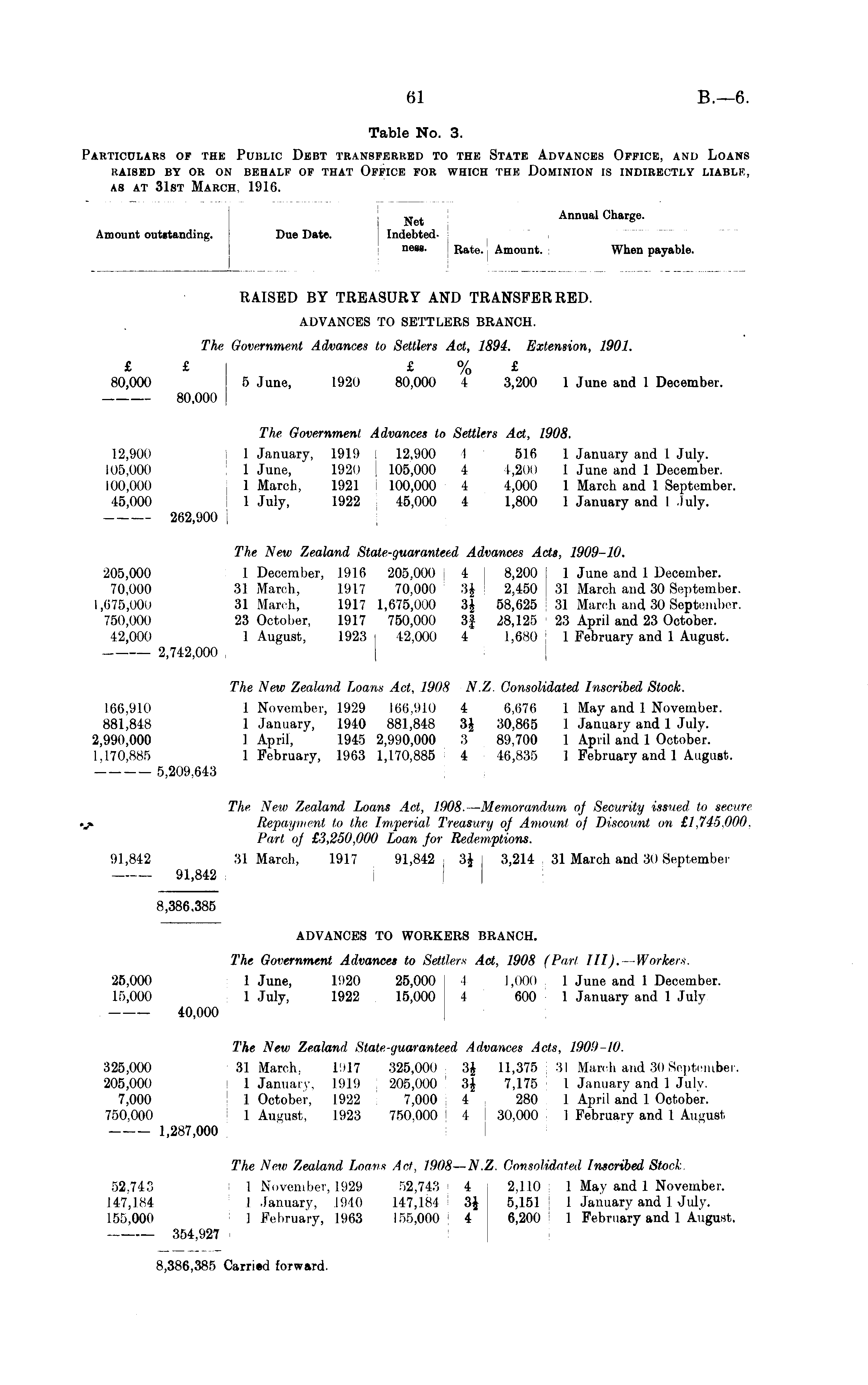 „ , Annual Charge. Amount outntanding. Due Date. Indebtedness. Rate. Amount. When payable. RAISED BY TREASURY AND TRANSFERRED. ADVANCES TO SETTLERS BRANCH. The Government Advances to Settlers Act, 1894. Extension, 1901. £ £ £ % £ 80,000 5 June, 1920 80,000 4 3,200 1 June and 1 December. 80,000 The, Government Advances to Settlers Act, 1908. 12,900 1 January, 1919 I 12.900 1 516 1 January and I July. 105,000 1 June, 1920 ! 105,000 4 1,200 1 June and 1 December. 100,000 1 March, 1921 100,000 4 4,000 1 March and 1 September. 45,000 1 July, 1922 45,000 4 1,800 1 January and I July. 262,900 The New Zealand State-guaranteed Advances Acts, 1909-10. 205,000 1 December, 1916 205,000 i 4 8,200 j 1 June and 1 December. 70,000 31 March, 1917 70,000 3£ ' 2,450 ! 31 March and 30 September. 1,675,000 31 March, 1917 1,675,000 3| 58,625 31 March and 30 September. 750,000 23 October, 1917 750,000 3| 28,125 23 April and 23 October. 42,000 1 August, 1923 42,000 4 1,680 1 February and 1 August. 2,742,000 The New Zealand Loans Act, 1908 N.Z. Consolidated Inscribed Stock. 166,910 1 November, 1929 166,910 4 6,676 1 May and 1 November. 881,848 1 January, 1940 881,848 3J 30,865 1 January and 1 July. 2,990,000 1 April, 1945 2,990,000 3 89,700 1 April and 1 October. 1,170,885 1 February, 1963 1,170,885 4 46,835 1 February and 1 August. 5,209,643 The, New Zealand Loans Act, 1908. — Memorandum of Security issued to secure » Repayment to the Imperial Treasury of Amount of Discount on £1,745.000. Part of £3,250,000 Loan for Redemptions. 91,842 31 March, 1917 91,842 j 3£ 3,214 31 March and 30 September 91,842 8,386,385 ADVANCES TO WORKERS BRANCH. The Government Advances to Settlers Act, 1908 (Par/ III). — Workers. 25,000 1 June, 1920 25,000 I 1,000 1 June and 1 December. 15,000 1 July, 1922 15,000 4 600 : 1 January and 1 July 40,000 The New Zealand State-guaranteed Advances Acts, 1909-10. 325,000 31 March. 1917 325,000 3J 11,376 I 31 March and 80 September. 205,000 1 January, 1919 ! 205,000 ' 3| 7,175 ; 1 January and 1 Julv. 7,000 1 October, 1922 7,000 ,4 280 1 April and 1 October. 750,000 1 August, 1923 750,000 j 4 30,000 I February and I August 1,287,000 The New Zealand Loans Act, 1908 — N.Z. Consolidated Inscribed Stock. 52,743 1 November, 1929 52,743 4 2,110 1 May and 1 November. 147,184 I January, 1940 147,184 3J 5,151; 1 January and 1 July. 155,000 ] February, 1963 155,000 4 6,200 I February and I August. 354,927 8,386,385 Carried forward.