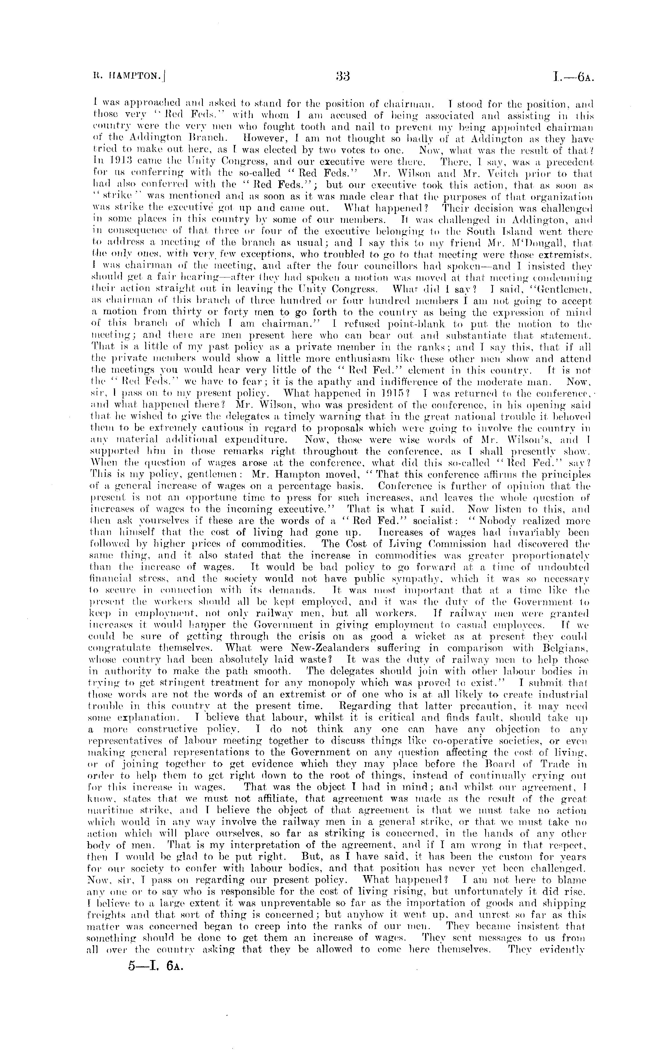I was approached and asked to stand for the position of chairman. I stood for the position, and those very " Red Feds." with whom I am accused of being associated and assisting in this country were the very men who fought tooth and nail to prevent my being appointed chairman of the Addington Branch. However, lam not thought so badly of at Addington as they have tried to make out here, as I was elected by two votes to one. Now, what was the result of that? In 1913 camc the Unity Congress, and our executive were there. There, I say, was a precedent for us conferring with the so-called "Red Feds." Mr. Wilson and Mr. Veitch prior to that had also conferred with the "Red Feds."; but our executive took this action, that as soon as " strike was mentioned and as soon as it was made clear that the purposes of that organization was strike the executive got up and came out. What happened ? Their decision was challenged in some places in this country by some of our members. It was challenged in Addington, and in consequence of that three or four of the executive belonging to the South Island went there to address a meeting of the branch as usual; and I say this to my friend Mr. M'Dougall, that the only ones, with very few exceptions, who troubled to go to that meeting were those extremists. I was chairman of the meeting, and after the four councillors had spoken—and I insisted they should get a fair hearing-—after they had spoken a motion was moved at that meeting condemning their action straight out in leaving the Unity Congress. What did I say? I said, "Gentlemen, as chairman of this branch of three hundred or four hundred members I am not going to accept a motion from thirty or forty men to go forth to the country as being the expression of mind of this branch of which I am chairman." I refused point-blank to put the motion to the meeting; and there are men present here who can bear out and substantiate that statement. That is a little of my past policy as a private member in the ranks; and I say this, that if all the private members would show a little more enthusiasm like these other men show and attend the meetings you would hear very little of the " Red Fed." element in this country. Ft is not the " Red Feds." we have to fear; it is the apathy and indifference of the moderate man. Now. sir, I pass on to my present policy. What happened in 1015? I was returned to the conference, • and what happened there? Mr. Wilson, who was president of the conference, in his opening said that he wished to give the delegates a timely warning that in the great national trouble it behoved them to be extremely cautious in regard to proposals which were going to involve the country in any material additional expenditure. Now, those were wise words of Mr. Wilson's, and I supported him in those remarks right throughout the conference, as I shall presently show. When the question of wages arose at the conference, what did this so-called " Red Fed." say? This is my policy, gentlemen: Mr. Hampton moved, "That this conference affirms the principles of a general increase of wages on a percentage basis. Conference is further of opinion that the present is not an opportune time to press for such increases', and leaves the whole question of increases of wages to the incoming executive." That is what I said. Now listen to this, and then ask yourselves if these are the words of a "Red Fed." socialist: "Nobody realized more than himself that the cost of living had gone up. Increases of wages had invariably been followed by higher prices of commodities. The Cost of Living Commission had discovered the same thing, and it also stated that the increase in commodities was greater proportionately than the increase of wages. Tt would be bad policy to go forward at a time of undoubted financial stress, and the society would not have public sympathy, which it was so necessary to secure in connection with its demands. It was most important that at a time like the present the workers should all be kept employed, and it was the duty of the Government to keep in employment, not only railway men, but all workers. If railway men were granted increases it would hamper the Government in giving employment to casual employees. Tf we could be sure of getting through the crisis on as good a wicket as at present they could congratulate themselves. What, were New-Zealanders suffering in comparison with Belgians, whose country had been absolutely laid waste? [t was the duty of railway men to help those in authority to make the path smooth. The delegates should join with other labour bodies in trying to get stringent treatment for any monopoly which was proved to exist." I submit that those words are not the words of an extremist or of one who is at all likely to create industrial trouble in this country at the present time. Regarding that latter precaution, it may need some explanation. 1 believe that labour, whilst it is critical and finds fault, should take up a more constructive policy. I do not think any one can have any objection to any representatives of labour meeting together to discuss tilings like co-operative societies, or even making general representations to the Government on any question affecting the cost of living, or of joining together to get evidence which they may place before the Board of Trade in order to help them to get right down to the root of things, instead of continually crying out for this increase in wages. That was the object I had in mind; and whilst our agreement, I know, states that we must not affiliate, that agreement was made as the result of the great maritime strike, and I believe the object of that agreement is that we must take no action which would in any way involve the railway men in a general strike, or that we must take no action which will place ourselves, so far as striking is concerned, in the hands of any other body of men. That is my interpretation of the agreement, and if I am wrong in that
