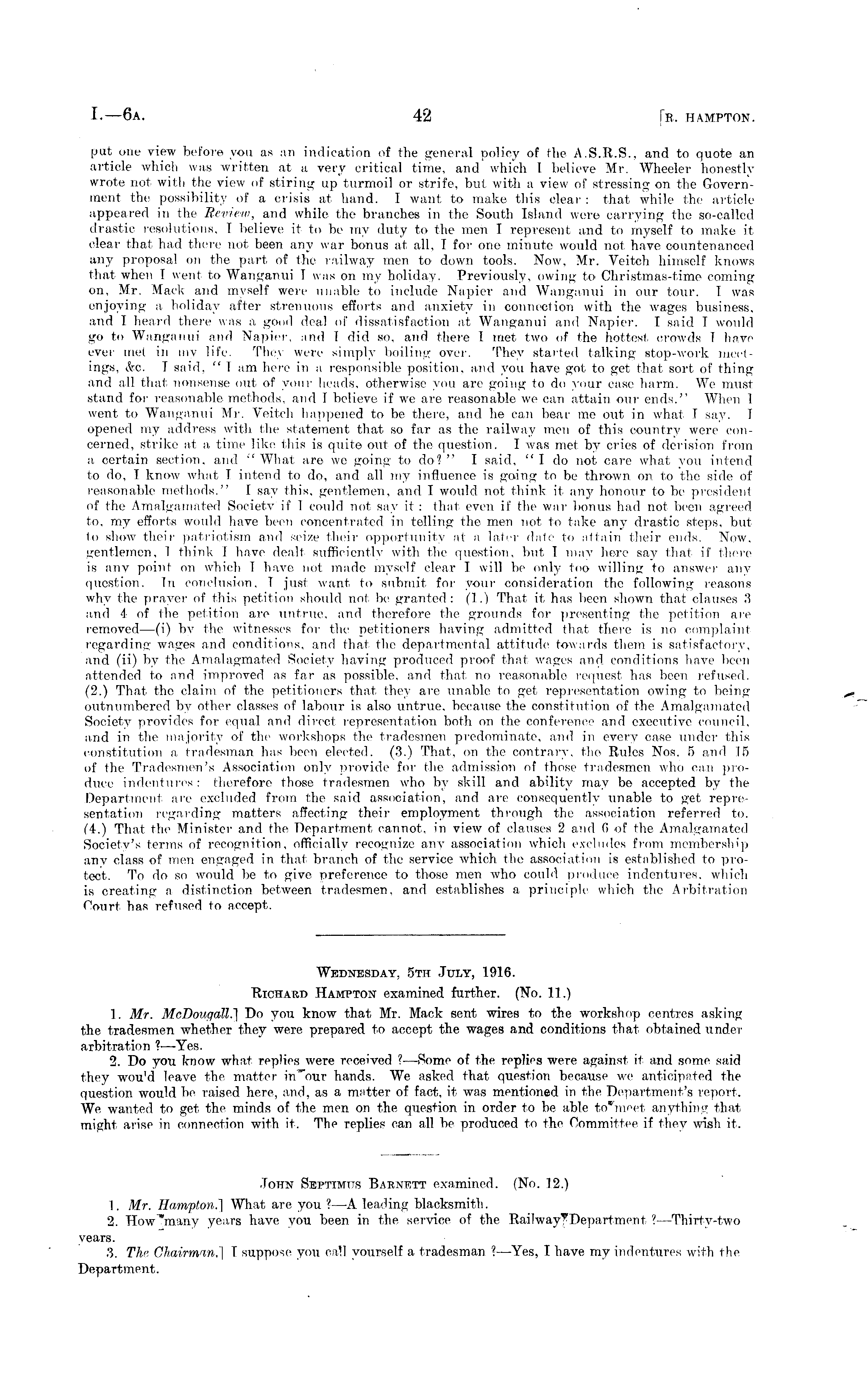Wednesday, stti July, 1916. Richard Hampton examined further. (No. 11.) 1. Mr. McDouqall.] Do you know that Mr. Mack sent wires to the workshop centres asking the tradesmen whether they were prepared to accept the wages and conditions that obtained under arbitration ?—Yes. 2. Do you know what replies were received ?—Some of the replies were against it and some said they wou*d leave the matter hands. We asked that question because we anticipated the question would be raised here, and, as a matter of fact, it was mentioned in the Department's report. We wanted to get the minds of the men on the question in order to be able to'meet anything that might arise in connection with it. The replies can all be produced to the Committee if they wish it.