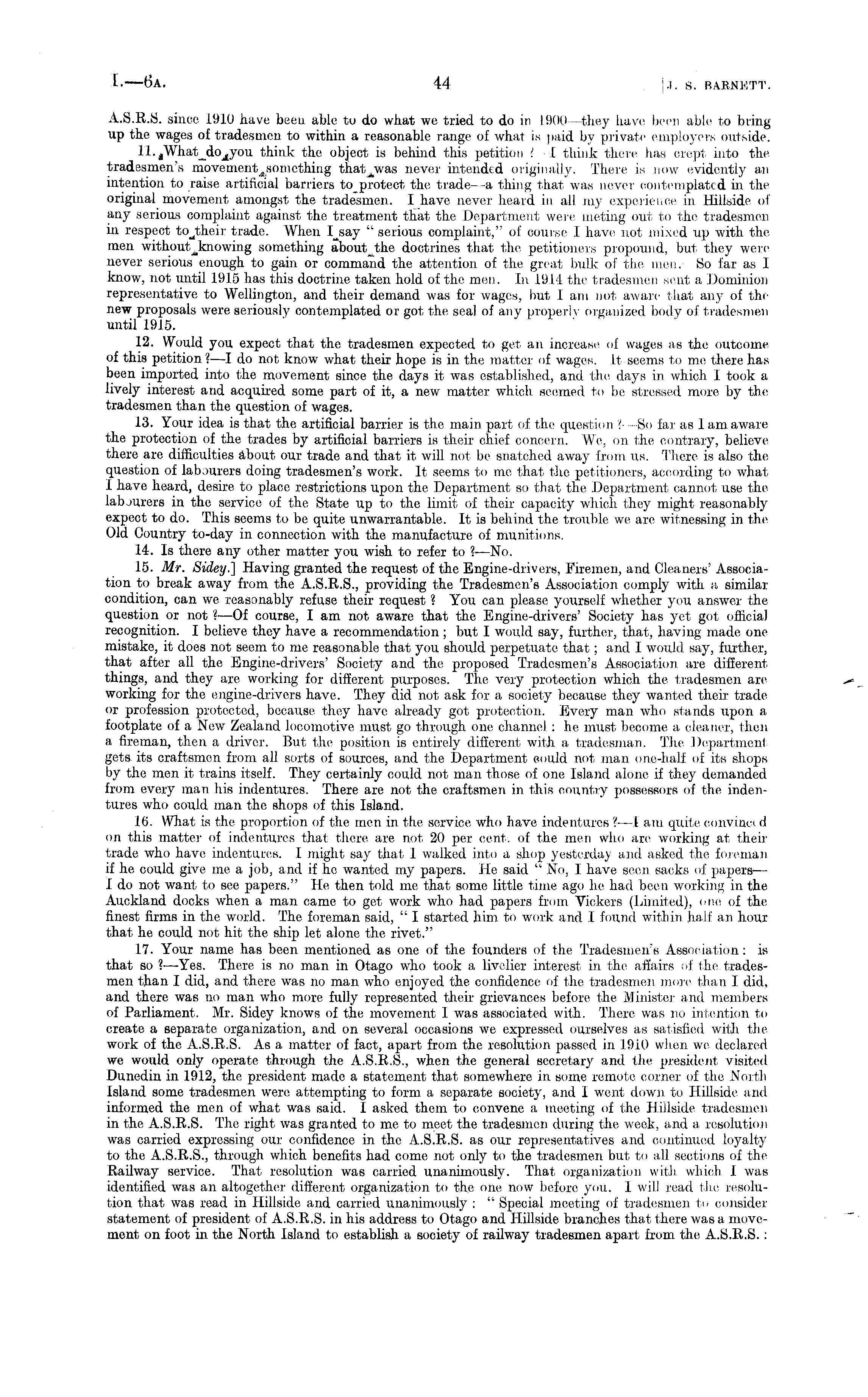 A.S.R.S. since 1910 have been able to do what we tried to do in 1900—they have been able to bving up the wages of tradesmen to within a reasonable range of what is paid by private employers outside. 11. think the object is behind this petition ■ 1 think there has crept into the tradesmen's never intended originally. There is now evidently an intention to raise artificial barriers to^protect the trade—a thing that was never contemplated in the original movement amongst the tradesmen. 1 have never heard in all my experience in Hillside of any serious complaint against the treatment that the Department were meting out to the tradesmen in respect trade. When " serious complaint," of course I have not mixed up with the men something doctrines that the petitioners propound, but they were never serious enough to gain or command the attention of the great bulk of the men. So far as I know, not until 1915 has this doctrine taken hold of the men. In 1914 the tradesmen sent a Dominion representative to Wellington, and their demand was for wages, but I am not aware that any of the new proposals were seriously contemplated or got the seal of any properly organized body of tradesmen until 1915. 12. Would you expect that the tradesmen expected to get an increase of wages as the outcome of this petition ? —I do not know what their hope is in the matter of wages. It seems to me there has been imported into the movement since the days it was established, and the days in which I took a lively interest and acquired some part of it, a new matter which seemed to be stressed more by the tradesmen than the question of wages. 13. Your idea is that the artificial barrier is the main part of the question ?—So far as I am aware the protection of the trades by artificial barriers is their chief concern. We, on the contrary, believe there are difficulties about our trade and that it will not be snatched away from us. There is also the question of labourers doing tradesmen's work. It seems to me that the petitioners, according to what 1 have heard, desire to place restrictions upon the Department so that the Department cannot use the labourers in the service of the State up to the limit of their capacity which they might reasonably expect to do. This seems to be quite unwarrantable. It is behind the trouble we are witnessing in the Old Country to-day in connection with the manufacture of munitions. 14. Is there any other matter you wish to refer to ?—No. 15. Mr. Sidey.] Having granted the request of the Engine-drivers, Firemen, and Cleaners' Association to break away from the A.S.R.S., providing the Tradesmen's Association comply with a similar condition, can we reasonably refuse their request ? You can please yourself whether you answer the question or not ? —Of course, I am not aware that the Engine-drivers' Society has yet got official recognition. I believe they have a recommendation; but I would say, further, that, having made one mistake, it does not seem to me reasonable that you should perpetuate that; and I would say, further, that after all the Engine-drivers' Society and the proposed Tradesmen's Association are different things, and they are working for different purposes. The very protection which the tradesmen are working for the engine-drivers have. They did not ask for a society because they wanted their trade or profession protected, because they have already got protection. Every man who stands upon a footplate of a New Zealand locomotive must go through one channel: he must become a cleaner, then a fireman, then a driver. But the position is entirely different with a tradesman. The Department gets its craftsmen from all sorts of sources, and the Department could not man one-half of its shops by the men it trains itself. They certainly could not man those of one Island alone if they demanded from every man his indentures. There are not the craftsmen in this country possessors of the indentures who could man the shops of this Island. 16. What is the proportion of the men in the service who have indentures ?—I am quite convinced on this matter of indentures that there are not 20 per cent, of the men whe> are working at their trade who have indentures. I might say that I walked into a shop yesterday and asked the foreman if he could give me a job, and if he wanted my papers. He said " No, I have seen sacks of papers — Ido not want to see papers." He then told me that some little time ago he had been working in the Auckland docks when a man came to get work who had papers from Vickers (Limited), one of the finest firms in the world. The foreman said, " I started him to work and I found within half an hour that he could not hit the ship let alone the rivet." 17. Your name has been mentioned as one of the founders of the Tradesmen's Association: is that so ?—Yes. There is no man in Otago who took a livelier interest in the affairs of the tradesmen than I did, and there was no man who enjoyed the confidence of the tradesmen more than I did, and there was no man who more fully represented their grievances before the Minister and members of Parliament. Mr. Sidey knows of the movement 1 was associated with. There was no intention to create a separate organization, and on several occasions we expressed ourselves as satisfied with the work of the A.S.R.S. As a matter of fact, apart from the resolution passed in 1910 when we declared we would only operate through the A.S.R.S., when the general secretary and the president visited Dunedin in 1912, the president made a statement that somewhere in some remote corner of the North Island some tradesmen were attempting to form a separate society, and I went down to Hillside and informed the men of what was said. I asked them to convene a meeting of the Hillside tradesmen in the A.S.R.S. The right was granted to me to meet the tradesmen during the week, and a resolution was carried expressing our confidence in the A.S.R.S. as our representatives and co