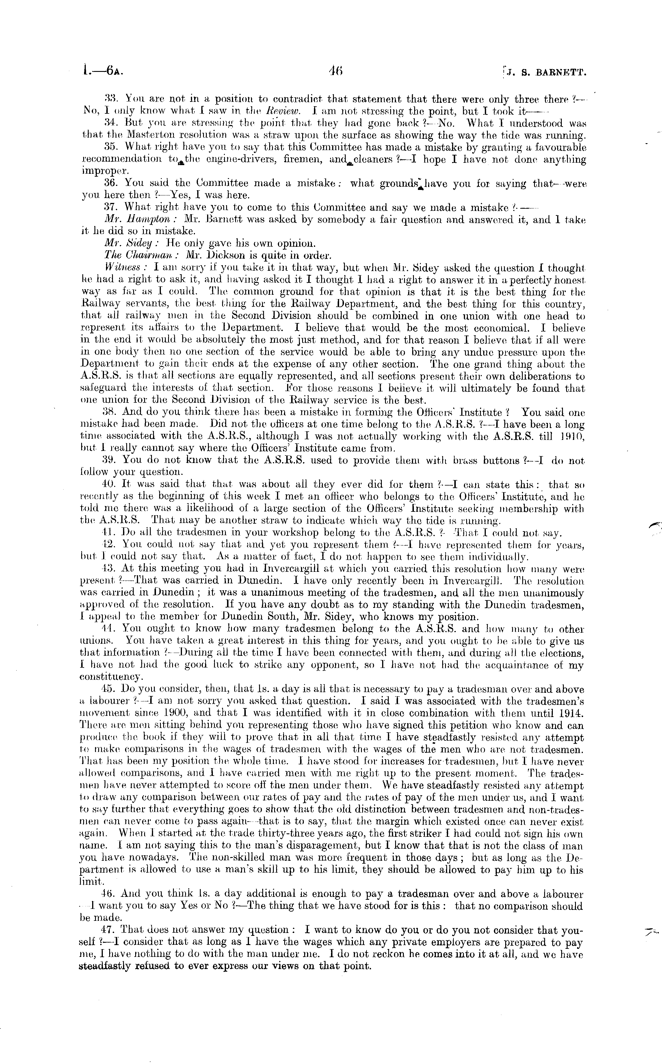 33. You are not in a position to contradict that statement that there were only three there ?— No, I only know what I saw in the Review. lam not stressing the point, but I took it- —•— 34. But you are stressing the point that they had gone back ?—No. What I understood was that the Masterton resolution was a straw upon the surface as showing the way the tide was running. 35. What right have you to say that this Committee has made a mistake by granting a favourable recommendation to A the engine-drivers, firemen, ?—I hope I have not done anything improper. 36. You said the Committee made a mistake: what groundsillave you for saying that —were you here then ?■ —Yes, I was here. 37. What right have you to come to this Committee and say we made a mistake ? Mr. Hampton: Mr. Barnett was asked by somebody a fair question and answered it, and 1 take it he did so in mistake. Mr. Sidey: He only gave his own opinion. The Chairman: Mr. Dickson is quite in order. Witness : I am sorry if you take it in that way, but when Mr. Sidey asked the question I thought he had a right to ask it, and having asked it I thought I had a right to answer it in a perfectly honest way as far as I could. The common ground for that opinion is that it is the best thing for the Railway servants, the best thing for the .Railway Department, and the best thing for this country, that all railway men in the Second Division should be combined in one union with one head to represent its affairs to the Department. I believe that woidd be the most economical. I believe in the end it would be absolutely the most just method, and for that reason I believe that if all were in one body then no one section of the service would be able to bring any undue pressure upon the Department to gain their ends at the expense of any other section. The one grand thing about the A.S.R.S. is that all sections are equally represented, and all sections present their own deliberations to safeguard the interests of that section. For those reasons I believe it will ultimately be found that one union for the Second Division of the Railway service is the best. 38. And do you think there has been a mistake in forming the Officers' Institute ? You said one mistake had been made. Did not the officers at one time belong to the A.S.R.S. ?• —I have been a long time associated with the A.S.R.S., although I was not actually working with the A.S.R.S. till 1910, but I really cannot say where the Officers' Institute came from. 39. You do not know that the A.S.R.S. used to provide them with brass buttons ?—I do not follow your question. 40. It was said that that was about all they ever did for them ?• —I can state this : that so recently as the beginning of this week I met an officer who belongs to the Officers' Institute, and he told me there was a likelihood of a large section of the Officers' Institute seeking membership with the A.S.R.S. That may be another straw to indicate which way the tide is running. 4.1. Do all the tradesmen in your workshop belong to the A.S.R.S. ?- -That I could not say. 42. You could not say that and yet you represent them ? —I have represented them for years, but I could not say that. As a matter of fact, Ido not happen to see them individually. 43. At this meeting you had in Invercargill at which you carried this resolution how many were present ?—That was carried in Dunedin. I have only recently been in Invercargill. The resolution was carried in Dunedin ; it was a unanimous meeting of the tradesmen, and all the men unanimously approved of the resolution. If you have any doubt as to my standing with the Dunedin tradesmen, I appeal to the member for Dunedin South, Mr. Sidey, who knows my position. 44. You ought to know how many tradesmen belong to the A.S.R.S. and how many to other unions. You have taken a great interest in this thing for years, and you ought to be able to give us that information ? —During all the time I have been connected with them, and during all the elections, I have not had the good luck to strike any opponent, so I have not had the acquaintance of my constituency. 45. Do you consider, then, that Is. a day is all that is necessary to pay a tradesman over and above a labourer ?• —I am. not sorry you asked that question. I said I was associated with the tradesmen's movement since 1900, and that I was identified with it in close combination with them until 191.4. There are men sitting behind you representing those who have signed this petition who know and can produce the book if they will to prove that in all that time I have steadfastly resisted any attempt to make comparisons in the wages of tradesmen with the wages of. the men who are not tradesmen. That has been my position the whole time. I have stood for increases for-tradesmen, but I have never allowed comparisons, and I have carried men with me right up to the present moment. The tradesmen have never attempted to score off the men under them. We have steadfastly resisted any attempt to draw any comparison between our rates of pay and the rates of pay of the men under us, and I want to say further that everything goes to show that the old distinction between tradesmen and non-trades-men can never come to pass again—that is to say, that the margin which existed once can never exist again. When I started at the trade thirty-three years ago, the first striker I had could not sign his own name. lam not saying this to the man's disparagement, but I know that that is not the class of man you have nowadays. The non-skilled, man was more frequent in those days; but as long as the Department is allowed to use a man's skill up to his limit, they should be allowed to pay him up to his limit. 46. And you think Is. a day additional is enough, to pa) 7 a tradesman over and above a labourer 1 want you to say Yes or No ?—The thing that we have stood for is this : that no comparison should be made. 47. That does not answer my question : 