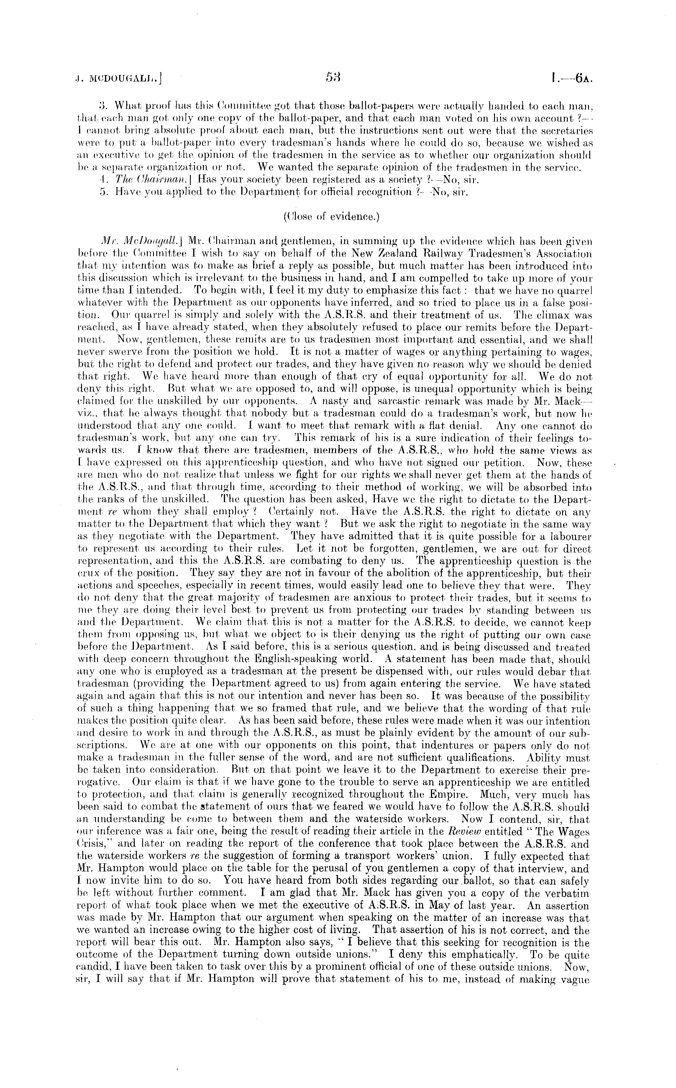 3. What proof has this Committee got that those ballot-papers were actually handed to each man, that each man got only one copy of the ballot-paper, and that each man voted on his own account ?•— J cannot bring absolute proof about each man, but the instructions sent out were that the secretaries were to put a ballot-paper into every tradesman's hands where he could do so, because we wished as an executive to get the opinion of the tradesmen in the service as to whether our organization should be a separate organization or not. We wanted the separate opinion of the tradesmen in the service. i. The Chairman. | Has your society been registered as a society ? —No, sir. 5. Have you applied to the Department for official recognition ?- -No, sir. (Close of evidence.) Mr. Mcl)ougall.\ Mr. Chairman and gentlemen, in summing up the evidence which has been given before the Committee I wish to say on behalf of the New Zealand Railway Tradesmen's Association that my intention was to make as brief a reply as possible, but much matter has been introduced into this discussion which is irrelevant to the business in hand, and I am compelled to take up more of your time than I intended. To begin with, I feel it my duty to emphasize this fact : that we have no quarrel whatever with the Department as our opponents have inferred, and so tried to place us in a false position. Our quarrel is simply and solely with the A.S.R.S. and their treatment of us. The climax was reached, as I have already stated, when they absolutely refused to place our remits before the Department. Now, gentlemen, these remits are to us tradesmen most important and essentia], and we shall never swerve from the position we hold. It is not a matter of wages or anything pertaining to wages, but the right to defend and protect our trades, and they have given no reason why we should be denied that right. We have heard more than enough of that cry of equal opportunity for all. We do not deny this right. But what we are opposed to, and will oppose, is unequal opportunity which is being claimed for the unskilled by our opponents. A nasty and sarcastic remark was made by Mr. Mack—viz., that he always thought that nobody but a tradesman could do a tradesman's work, but now he understood that any one could. I want to meet that remark with a flat denial. Any one cannot do tradesman's work, but any one can try. This remark of his is a sure indication of their feelings towards us. I know that there are tradesmen, members of the A.S.R.S., who hold the same views as I have expressed on this apprenticeship question, and who have not signed our petition. Now, these are men who do not realize that unless we fight for our rights we shall never get them at the hands of the A.S.R.S., and that through time, according to their method of working, we will be absorbed into the ranks of the unskilled. The question has been asked, Have we the right to dictate to the Department re whom they shall employ 1 Certainly not. Have the A.S.R.S. the right to dictate on any matter to the Department that which they want 1 But we ask the right to negotiate in the same way as they negotiate with the Department. They have admitted that it is quite possible for a labourer to represent us according to their rules. Let it not be forgotten, gentlemen, we are out for direct representation, and this the A.S.R.S. are combating to deny us. The apprenticeship question is the crux of the position. They say they are not in favour of the abolition of, the apprenticeship, but their actions and speeches, especially in recent times, would easily lead one to believe they that were. They do not deny that the great majority of tradesmen are anxious to protect their trades, but it seems to me they are doing their level best to prevent us from protecting our trades by standing between us and the Department. We claim that this is not a matter for the A.S.R.S. to decide, we cannot keep them from opposing us, but what we object to is their denying us the right of putting our own case before the Department. As I said before, this is a serious question, and is being discussed and treated with deep concern throughout the English-speaking world. A statement has been made that, should any one who is employed as a tradesman at the present be dispensed with, our rules would debar that tradesman (providing the Department agreed to us) from again entering the service. We have stated again and again that this is not our intention and never has been so. It was because of the possibility of such a thing happening that we so framed that rule, and we believe that the wording of that rule makes the position quite clear. As has been said before, these rules were made when it was our intention and desire to work in and through the A.S.R.S., as must be plainly evident by the amount of our subscriptions. We are at one with our opponents on this point, that indentures or papers only do not make a tradesman in the fuller sense of the word, and are not sufficient qualifications. Ability must be taken into consideration. But on that point we leave it to the Department to exercise their prerogative. Our claim is that if we have gone to the trouble to serve an apprenticeship we are entitled to protection, and that claim is generally recognized throughout the Empire. Much, very much has been said to combat the statement of ours that we feared we would have to follow the A.S.R.S. should an understanding be come to between them and the waterside workers. Now I contend, sir, that our inference was a fair one, being the result of reading their article in the Review entitled " The Wages Crisis," and later on reading the report of the conference that took place between the A.S.R.S. and the waterside workers re the suggestion of forming a transport workers' union. I fully expected that Mr. Hampton would place on the table for the perusal of you gentlemen a copy of that interview, and I now invite him to do so. You have heard