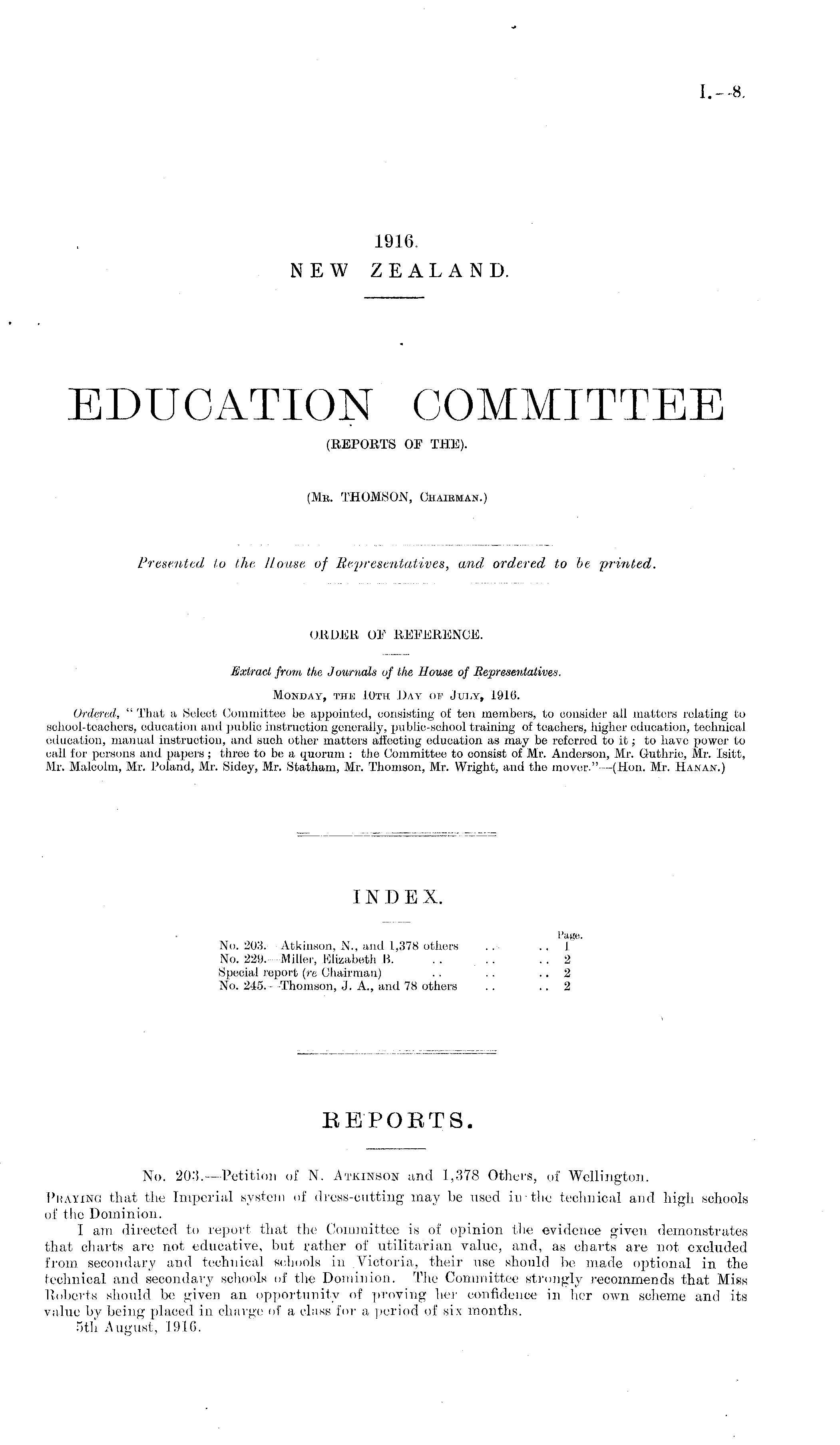 EBPOETB. No. 203.--Petition of N. Atkinson unci 1,378 Others, of Wellington. PRATING that the Imperial system of d ress-cutting may be used in the technical and high schools of the Dominion. I am directed to report that the Committee is of opinion the evidence given demonstrates that charts are not educative, but rather of utilitarian value, and, as charts are not excluded from secondary and technical schools in Victoria, their use should be made optional in the technical and secondary schools of the Dominion. The Committee strongly recommends that Miss Roberts should be given an opportunity of proving her confidence in her own scheme and its value b)' being placed in charge of a class for a period of six months. sth August, 1916..