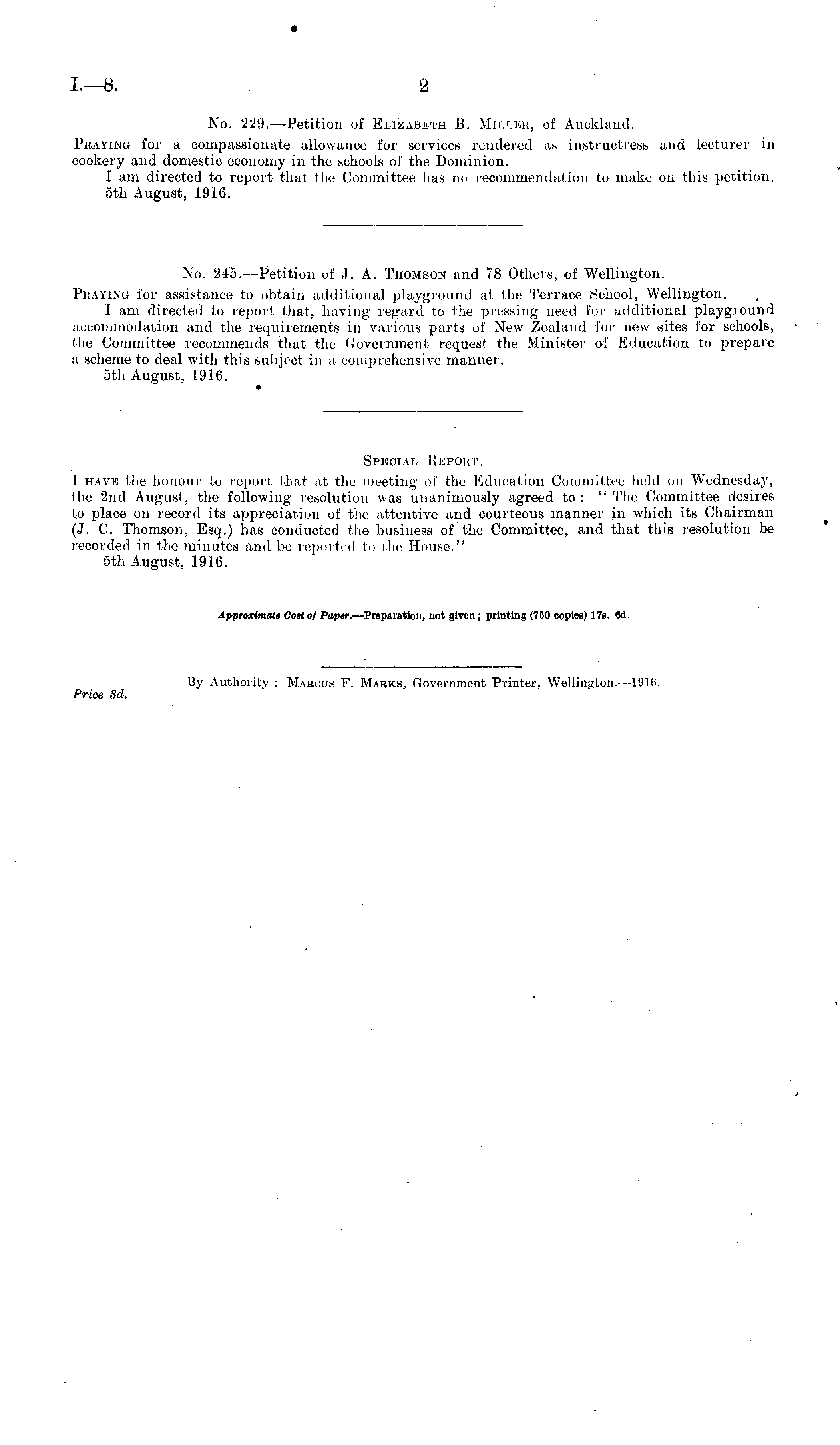 No. 229.—Petition of Elizabeth B. Miller, of Auckland. PRATING for a compassionate allowance for services rendered as instructress and lecturer in cookery and domestic economy in the schools of the Dominion. I am directed to report that the Committee lias no recommendation to make on this petition. sth August, 1916.