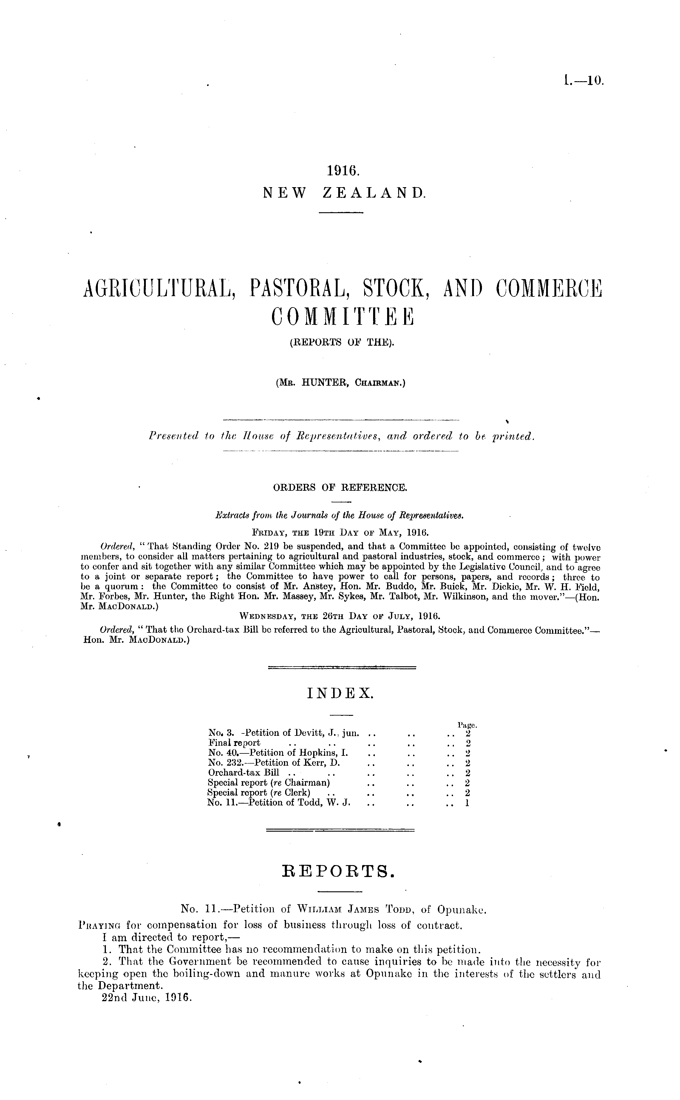 ORDERS OF REFERENCE. Extracts from the Journals of (lie House of Itepreseiiialives. Friday, the 19th Day or May, 1916. Ordered, " That Standing Order No. 219 be suspended, and that a Committee be appointed, consisting of twelve members, to consider all matters pertaining to agricultural and pastoral industries, stock, and commerce; with power to confer and sit together with any similar Committee which may be appointed by the Legislative Council, and to agree to a joint or separate report; the Committee to have power to oali for persons, papers, and records ; three to be a quorum : the Committee to consist of Mr. Anstey, Hon. Mr. Buddo, Mr. Buiok, Mr. Dickie, Mr. W. H. Field, Mr. Forbes, Mr. Hunter, the Right Hon. Mr. Masscy, Mr. Sykes, Mr. Talbot, Mr. Wilkinson, and the mover." —(Hon. Mr. Mac Donald.) Wednesday, the 26th Day op July, 1916. Ordered, " That tho Orchard-tax Bill be referred to the Agricultural, Pastoral, Stock, and Commerce Committee."— Hon. Mr. Mao Donald.)