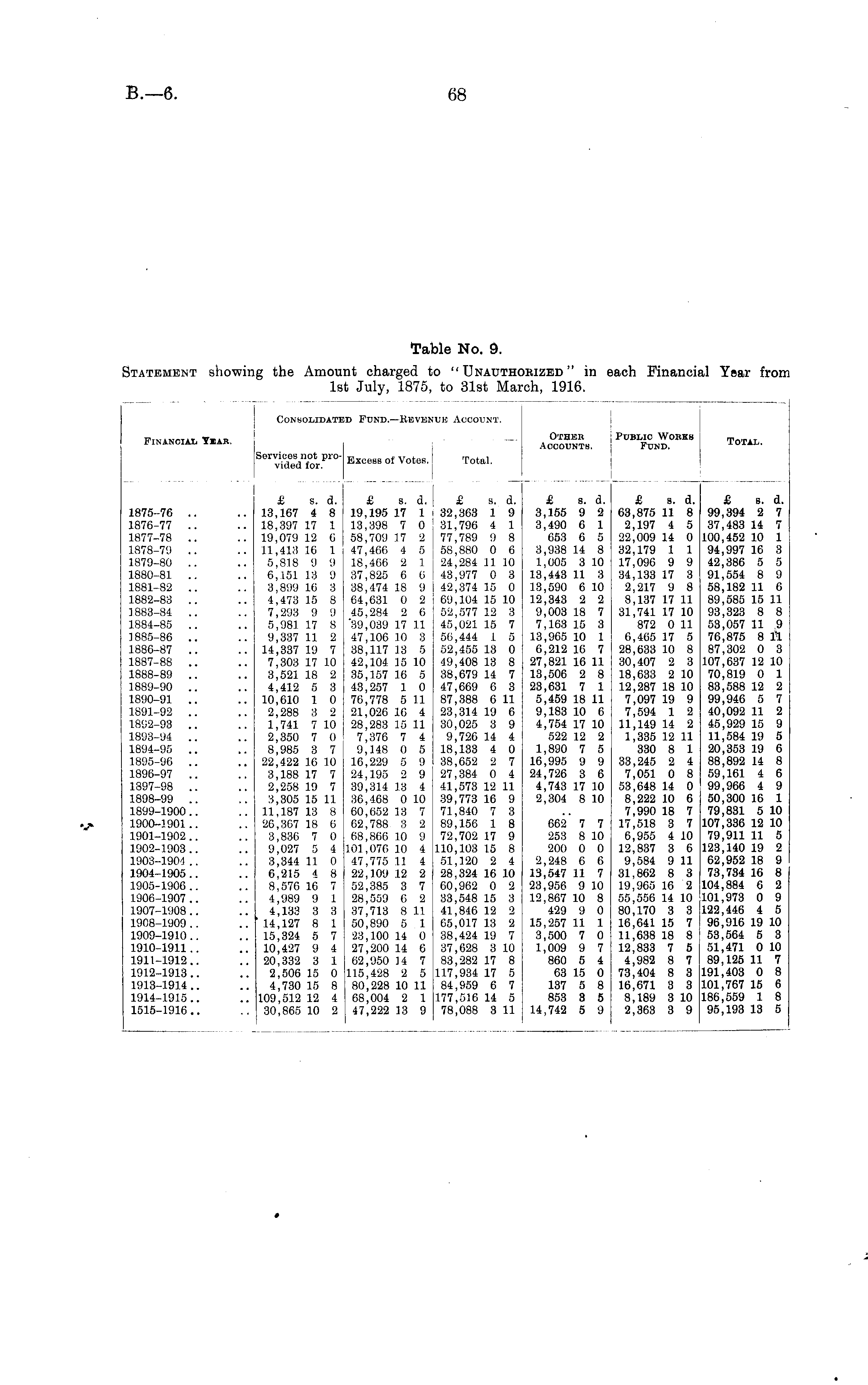 Table No. 9. Statement showing the Amount charged to "Unauthorized" in each Financial Year from 1st July, 1875, to 31st March, 1916.