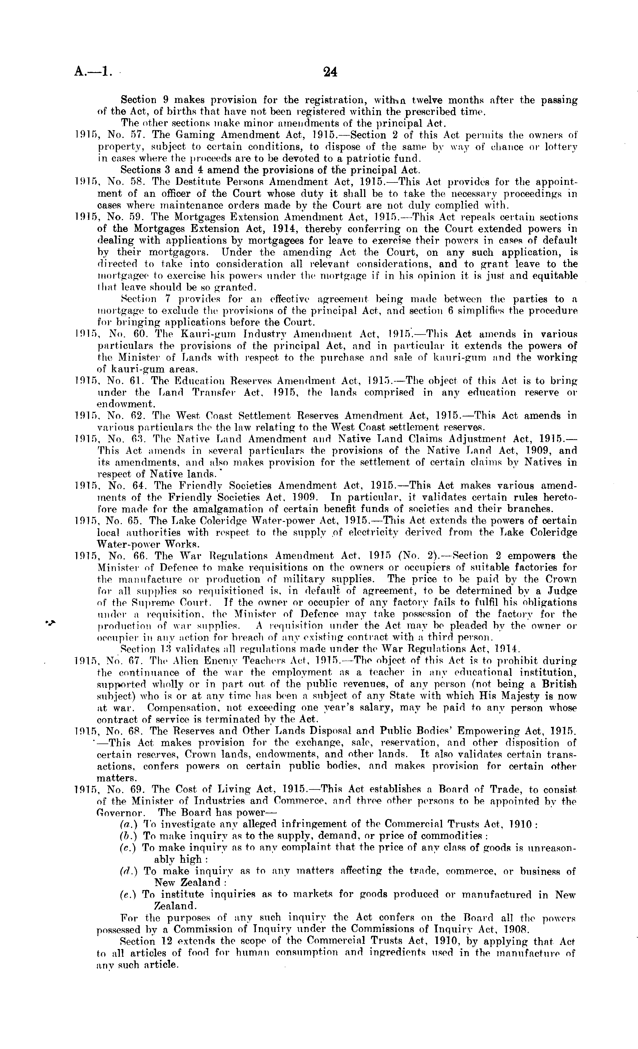Section 9 makes provision for the registration, within twelve months after the passing of the Act, of births that have not been registered within the prescribed time. The other sections make minor amendments of the principal Act. 1915, No. 57. The Gaming Amendment Act, 1915. —Section 2 of this Act permits the owners of property, subject to certain conditions, to dispose of the same by way of chance or lottery in cases where the proceeds are to be devoted to a patriotic fund. Sections 3 and 4 amend the provisions of the principal Act. 1915, No. 58. The Destitute Persons Amendment Act, 1915.—This Act provides for the appointment of an officer of the Court whose duty it shall be to take the necessary proceedings in cases where maintenance orders made by the Court are not duly complied with. 1915, No. 59. The Mortgages Extension Amendment Act, 1915. —This Act repeals certain sections of the Mortgages Extension Act, 1914, thereby conferring on the Court extended powers in dealing with applications by mortgagees for leave to exercise their powers in cases of default by their mortgagors. Under the amending Act the Court, on any such application, is directed to take into consideration all relevant considerations, and to grant leave to the mortgagee to exercise his powers under the mortgage if in his opinion it is just and equitable that leave should be so granted. Section 7 provides for an effective agreement being made between the parties to a mortgage to exclude the provisions of the principal Act, and section 6 simplifies the procedure for bringing applications before the Court. 1915, No. 60. The Kauri-gum Industry Amendment Act, 1915.—This Act amends in various particulars the provisions of the principal Act, and in particular it extends the powers of the Minister of Lands with respect to the purchase and sale of kauri-gum and the working of kauri-gum areas. 1915, No. 61. The Eduoation Reserves Amendment Act, 1915.—The object of this Act is to bringunder the Land Transfer Act. 1915, the lands comprised in any education reserve or endowment. 1915. No. 62. The West Coast Settlement Reserves Amendment Act, 1915. —This Act amends in various particulars the the law relating to the West Coast settlement reserves. 1915, No. 63. The Native Land Amendment and Native Land Claims Adjustment Act, 1915.— This Act amends in several particulars the provisions of the Native Land Act, 1909, and its amendments, and also makes provision for the settlement of certain claims by Natives in respect of Native lands." 1915, No. 64. The Friendly Societies Amendment Act, 1915. —This Act makes various amendments of the Friendly Societies Act. 1909. In particular, it validates certain rules heretofore made for the amalgamation of certain benefit funds of societies and their branches. 1915, No. 65. The Lake Coleridge Water-power Act, 1915. —This Act extends the powers of certain local authorities with respect to the supply of electricity derived from the Lake Coleridge Water-power Works. 1915, No. 66. The War Regulations Amendment Act. 1915 (No. 2). —Section 2 empowers the Minister of Defence to make requisitions on the owners or occupiers of suitable factories for the manufacture or production of military supplies. The price to be paid by the Crown for all supplies so requisitioned is, in default of agreement, to be determined by a Judge of the Supreme Court. If the owner or occupier of any factory fails to fulfil his obligations under a requisition, the Minister of Defence may take possession of the factory for the '•* production of war supplies. A requisition under the Act may be pleaded by the owner or occupier in any action for breach of any existing contract with a third person. Section 13 validates all regulations made under the War Regulations Act, 1914. 1915, No. 67. The Alien Enemy Teachers Act, 1915.—The object of this Act is to prohibit during the continuance of the war the employment as a teacher in any educational institution, supi»orted wholly or in part out of the public revenues, of any person (not being a British subject) who is or at any time has been a subject of any State with which His Majesty is now at war. Compensation, not exceeding one year's salary, may be paid to any person whoso contract of service is terminated by the Act. 1915, No. 68. The Reserves and Other Lands Disposal and Public Bodies' Empowering Act, 1915. ' —This Act makes provision for the exchange, sale, reservation, and other disposition of certain reserves, Crown lands, endowments, and other lands. It also validates certain transactions, confers powers on certain public bodies, and makes provision for certain other matters. 1915, No. 69. The Cost of Living Act, 1915.—This Act establishes a Board of Trade, to consist of the Minister of Industries and Commerce, and three other persons to be appointed by the Governor. The Board has power — (a.) To investigate any alleged infringement of the Commercial Trusts Act. 1910 : (6.) To make inquiry as to the supply, demand, or price of commodities ; (c.) To make inquiry as to any complaint that the price of any class of goods is unreasonably high : (d.) To make inquiry as to any matters affecting the trade, commerce, or business of New Zealand : (c.) To institute inquiries as to markets for goods produced or manufactured in NewZealand. For the purposes of any such inquiry the Act confers on the Board all the powers possessed by a Commission of Inquiry under the Commissions of Inquiry Act, 1908. Section 12 extends the scope of the Commercial Trusts Act, 1910, by applying that Act to all articles of food for human consumption and ingredients used in the manufacture of any such article.