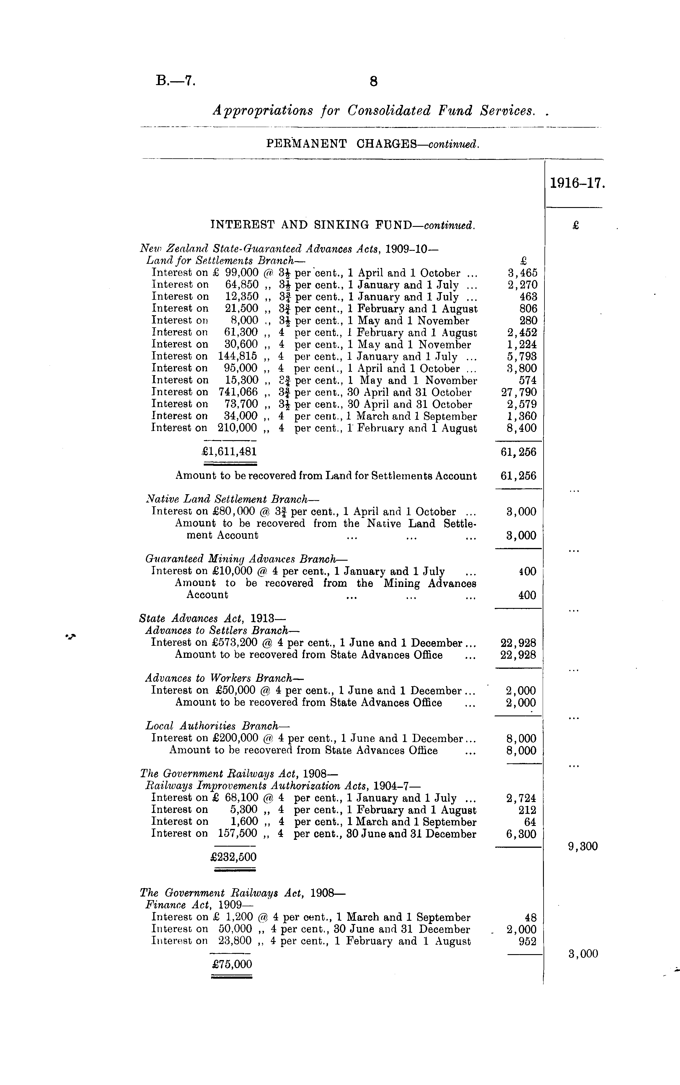 1916-17 INTEREST AND SINKING FUST)—continued. New Zealand State-Guaranteed Advances Acts, 1909-10— Land for Settlements Branch — Interest on £ 99,000 @ 3i\ per cent., 1 April and 1 October ... Interest on 64,850 ,, 3£ per cent., 1 January and 1 July ... Interest on 12,350 ,, 3f per cent., 1 January and 1 July ... Interest on 21,500 ,, 3£ per cent., 1 February and 1 August Interest on 8,000 ., 3h per cent., 1 May and 1 November Interest on 61,300 ,, 4 per cent., 1 February and 1 August Interest on 30,600 ,, 4 per cent., 1 May and 1 November Interest on 144,815 ,, 4 per cent., 1 January and 1 July ... Interest on 95,000 ,, 4 percent., 1 April and 1 October ... Interest on 15,300 ,, 2| per cent., 1 May and 1 November Interest on 741,066 ,. 3f per cent., 30 April and 31 October Interest on 73,700 ,, 3£ per cent., 30 April and 31 October Interest on 34,000 ,, 4 per cent., I March and 1 September Interest on 210,000 ,, 4 per cent., 1 February and 1 August £ 3,465 2,270 463 806 280 2,452 1,224 5,793 3,800 574 27,790 2,579 1,360 8,400 £ £1,611,481 61, 256 Amount to be recovered from Land for Settlements Account 61,256 Native Land Settlement Branch — Interest on £80,000 @ 3J per cent., 1 April and 1 October ... Amount to be recovered from the Native Land Settlement Account 3,000 3,000 Guaranteed Mining Advances Branch — Interest on £10,000 (a> 4 per cent., 1 January and 1 July Amount to be recovered from the Mining Advances Account 400 400 State Advances Act, 1913— Advances to Settlers Branch — Interest on £573,200 @ 4 per cent., 1 June and 1 December... Amount to be recovered from State Advances Office 22,928 22,928 Advances to Workers Branch — Interest on £50,000 @ 4 per cent., 1 June and 1 December ... Amount to be recovered from State Advances Office 2,000 2,000 Local Authorities Branch — Interest on £200,000 @ 4 per cent., 1 June and I December... Amount to be recovered from State Advances Office 8,000 8,000 The Government Railways Act, 1908— Railways Improvements Authorization Acts, 1904-7 — Interest on £ 68,100 @ 4 per cent., 1 January and 1 July ... Interest on 5,300 ,, 4 per cent., 1 February and 1 August Interest on 1,600 ,, 4 per cent., 1 March and 1 September Interest on 157,500,, 4 per cent., 30 June and 31 December 2,724 212 64 6,300 9,300 £232,500 The Government Railways Act, 1908— Finance Act, 1909— Interest on £ 1,200 @ 4 per cent., 1 March and 1 September Interest on 50,000 ,, 4 per cent., 30 June and 31 December Interest on 23,800 ,, 4 per cent., 1 February and 1 August 48 2,000 952 3,000 £75,000
