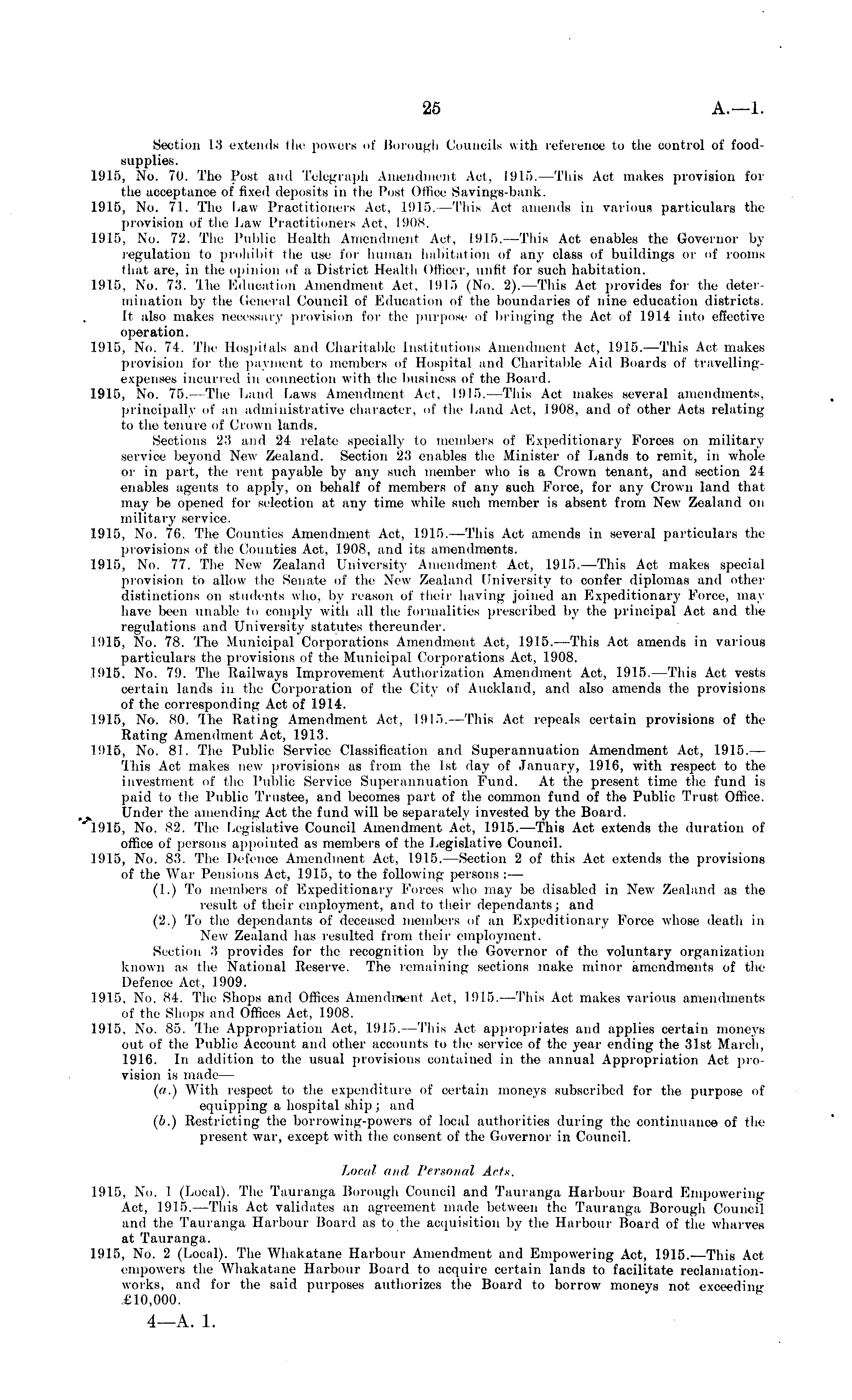Section 13 extends the powers of Borough Councils with reference to the control of foodsupplies. 1915, No. 70. The Post and Telegraph Amendment Act. 1915. —This Act makes provision for the acceptance of fixed deposits in the Post Office Savings-bank. 1915, No. 71. The Law Practitioners Act, 1915. —This Act amends in various particulars the provision of the Law Practitioners Act, 1908. 1915, No. 72. The Public Health Amendment Ad, 1915. —This Act enables the Governor Deregulation to prohibit the use for human habitation of any class of buildings or of rooms that are, in the opinion of a District Health Officer, unfit for such habitation. 1915, No. 73. Ihe Eduoation Amendment Act, 1915 (No. 2). —This Act provides for the determination by the General Council of Education of the boundaries of nine education districts. It also makes necessary provision for the purpose of bringing the Act of 1914 into effective operation. 1915, No. 74. The Hospitals and Charitable Institutions Amendment Act, 1915.—This Act makes provision for the payment to members of Hospital and Charitable Aid Boards of travellingexpenses incurred in connection wdth the business of the Board. 1915, No. 75.—The Land Laws Amendment Act, 1915. —This Act makes several amendments, principally of an administrative character, of the Land Act, 1908, and of other Acts relating to the tenure of Crown lands. Sections 23 and 24 relate specially to members of Expeditionary Forces on military service beyond New Zealand. Section 23 enables the Minister of Lands to remit, in whole or in part, the rent payable by any such member who is a Crown tenant, and section 24 enables agents to apply, on behalf of members of any such Force, for any Crown land that may be opened for selection at any time while such member is absent from New Zealand on military service. 1915, No. 76. The Counties Amendment Act, 1915.—This Act amends in several particulars the provisions of the Counties Act, 1908, and its amendments. 1915, No. 77. The New Zealand University Amendment Act, I.9ls.—This Act makes special provision to allow the Senate of the New Zealand University to confer diplomas and other distinctions on students who, by reason of their having joined an Expeditionary Force, may have been unable to comply with all the formalities prescribed by the principal Act and the regulations and University statutes thereunder. 1915, No. 78. The Municipal Corporations Amendment Act, 1915. —This Act amends in various particulars the provisions of the Municipal Corporations Act, 1908. .1915, No. 79. The Railways Improvement Authorization Amendment Act, 1915.—This Act vests certain lands in the Corporation of the City of Auckland, and also amends the provisions of the corresponding Act of 1914. 1915, No. 80. The Rating Amendment Act, 1915. —This Act repeals certain provisions of the Rating Amendment Act, 1913. 1915, No. 81. The Public Service Classification and Superannuation Amendment Act, 1915.— This Act makes new provisions as from the Ist day of January, 1916, with respect to the investment of the Public Service Superannuation Fund. At the present time the fund is paid to the Public Trustee, and becomes part of the common fund of the Public Trust Office. Under the amending Act the fund wdll be separately invested by the Board. 1915, No. 82. The Legislative Council Amendment Act, 1915.—This Act extends the duration of office of persons appointed as members of the Legislative Council. 1915, No. 83. The Defence Amendment Act, 1915. —Section 2 of this Act extends the provisions of the War Pensions Act, 1915, to the following persons : — (1.) To members of Expeditionary Forces who may be disabled in New Zealand as the result of their employment, and to their dependants; and (2.) To the dependants of deceased members of an Expeditionary Force whose death in New Zealand has resulted from their employment. Section 3 provides for the recognition by the Governor of the voluntary organization known as the National Reserve. The remaining sections make minor amendments of tinDefence Act, 1909. 1915, No. 84. The Shops and Offices Amendment Act, 1915.—This Act makes various amendments of the Shops and Offices Act, 1908. 1915, No. 85. The Appropriation Act, 1915. —This Act appropriates and applies certain moneys out of the Public Account and other accounts to the service of the year ending the 31st March, 1916. In addition to the usual provisions contained in the annual Appropriation Act provision is made — (a.) With respect to the expenditure of certain moneys subscribed for the purpose of equipping a hospital ship; and (b.) Restricting the borrowing-powers of local authorities during the continuance of the present war, except with the consent of the Governor in Council. Loral and Personal Acts. 1915, No. 1 (Local). The Tauranga Borough Council and Tauranga Harbour Board Empowering Act, 1915. —This Act validates an agreement made between the Tauranga Borough Council and the Tauranga Harbour Board as to the acquisition by the Harbour Board of the wharves at Tauranga. 1915, No. 2 (Local). The Whakatane Harbour Amendment and Empowering Act, 1915.—This Act empowers the Whakatane Harbour Board to acquire certain lands to facilitate reclamationworks, and for the said purposes authorizes the Board to borrow moneys not exceeding £10,000.