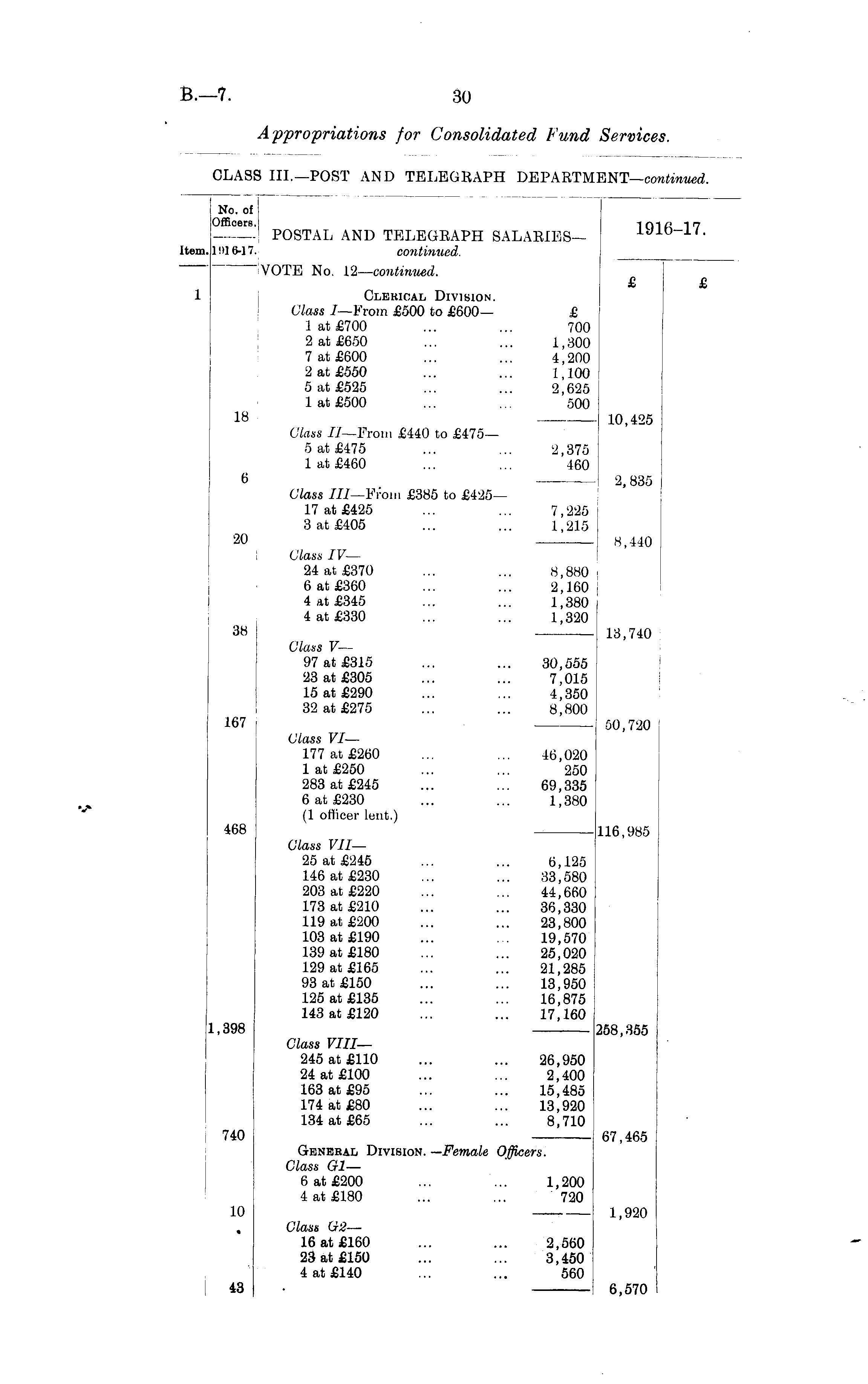 No. of Officers. POSTAL AND TELEGRAPH SALARIES— 1IH6-17. continued. "VOTE No. 12—continued. 1916-17. Item. 1 Clerical Division. Class /—From £500 to £600— £ lat £700 ... ... 700 2 at £650 ... ... 1,300 7 at £600 ... ... 4,200 2 at £550 ... ... 1,100 5 at £525 ... ... 2,625 1 at £500 ... 500 18 10,425 Class II— From £440 to £475— 5 at £475 ... ... 2,375 1 at £460 ... ... 460 2,835 6 Class III—From £385 to £425— 17 at £425 ... ... 7,225 3 at £405 ... ... 1,215 20 H,440 i Class IV — 24 at £370 ... ... 8,880 6 at £360 ... ... 2,160 4 at £345 ... ... 1,380 4 at £330 ... ... 1,320 QU 38 , 38 13,740 Class V — 97 at £315 ... ... 30,555 23 at £305 ... ... 7,015 15 at £290 ... ... 4,350 32 at £275 ... ... 8,800 IC7 167 167 50,720 Class VI — 177 at £260 ... ... 46,020 1 at £250 ... ... 250 283 at £245 ... ... 69,335 6 at £230 ... ... 1,380 (1 officer lent.) 468 _. ; 468 116,985 Class VII— 25 at £245 ... ... 6,125 146 at £230 ... ... 33,580 203 at £220 ... ... 44,660 173 at £210 ... ... 36,330 119 at £200 ... ... 23,800 103 at £190 ... ... 19,570 139 at £180 ... ... 25,020 129 at £165 ... ... 21,285 93 at £150 ... ... 13,950 125 at £135 ... ... 16,875 143 at £120 ... ... 17,160 I ana 1,398 1,398 ; 258,355 Class VIII— 245 at £110 ... ... 26,950 24 at £100 ... ... 2,400 163 at £95 ... ... 15,485 174 at £80 ... ... 13,920 134 at £65 ... ... 8,710 17 Af\ 740 740 67,465 General Division. —Female Officers. Class Gl— 6 at £200 ... ... 1,200 4 at £180 ... ... 720 10 10 1,920 , Class G2 — 16 at £160 ... ... 2,560 23 at £150 ... ... 3,450 4 at £140 ... ... 560 * 43 • 43 6,570