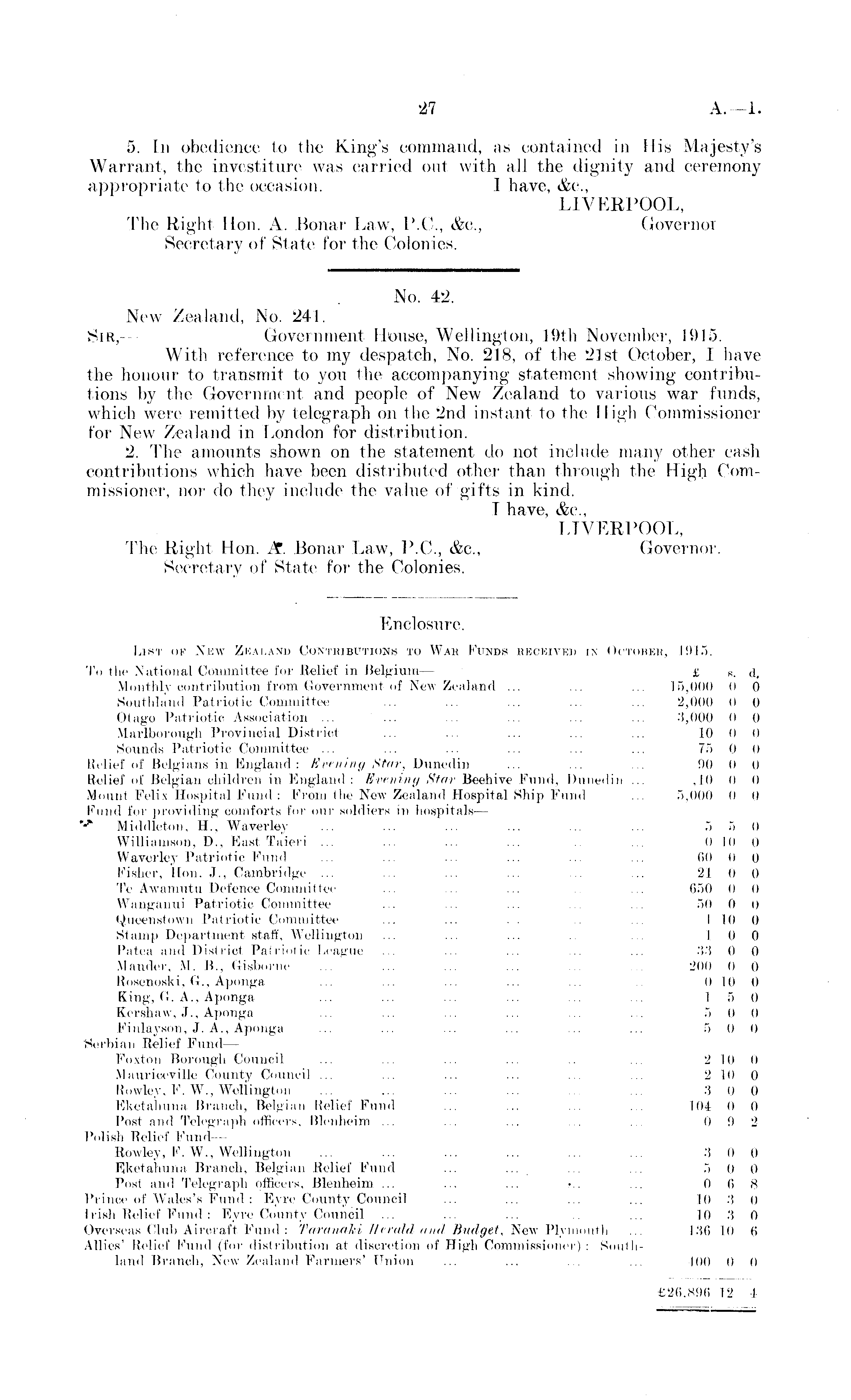 No. 42. New Zealand, No. 241. Sir,--- Government House, Wellington, 19th November, 1915. With reference to my despatch, No. 218, of the 21st October, I have the honour to transmit to you the accompanying statement showing contributions by the Government and people of New Zealand to various war funds, which were remitted by telegraph on the 2nd instant to the High Commissioner for New Zealand in London for distribution. 2. The amounts shown on the statement do not include many other cash contributions which have been distributed other than through the High Commissioner, nor do they include the value of gifts in kind. T have, &c, LIVERPOOL, The Right Hon. if. Bonar Law, P.C., &c, Governor. Secretary of State for the Colonies.