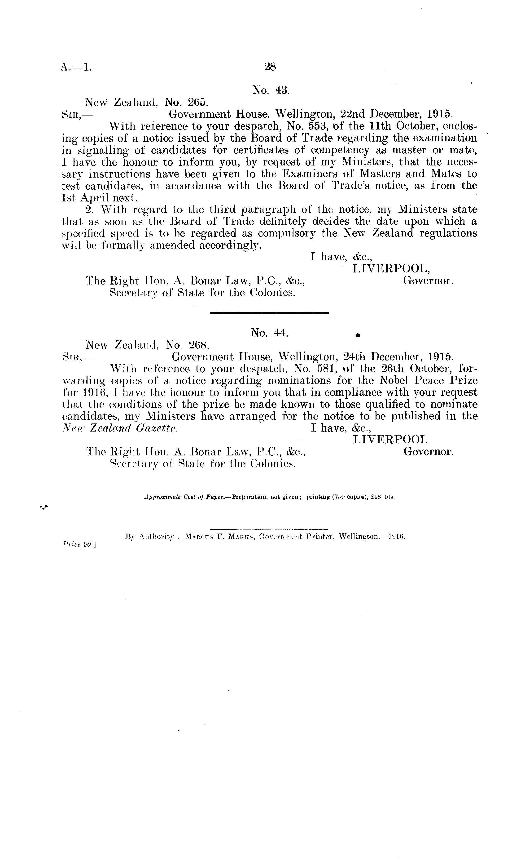 No. 43. New Zealand, No. 265. Sir,— Government House, Wellington, 22nd December, 1915. With reference to your despatch, No. 553, of the 11th October, enclosing copies of a notice issued by the Board of Trade regarding the examination in signalling of candidates for certificates of competency as master or mate, I have the honour to inform you, by request of my Ministers, that the necessary instructions have been given to the Examiners of Masters and Mates to test candidates, in accordance with the Board of Trade's notice, as from the Ist April next. 2. With regard to the third paragraph of the notice, my Ministers state that as soon as the Board of Trade definitely decides the date upon which a specified speed is to be regarded as compulsory the New Zealand regulations will be formally amended accordingly. I have, &c, LIVERPOOL, The Right Hon. A. Bonar Law, P.C., &c, Governor. Secretary of State for the Colonies.