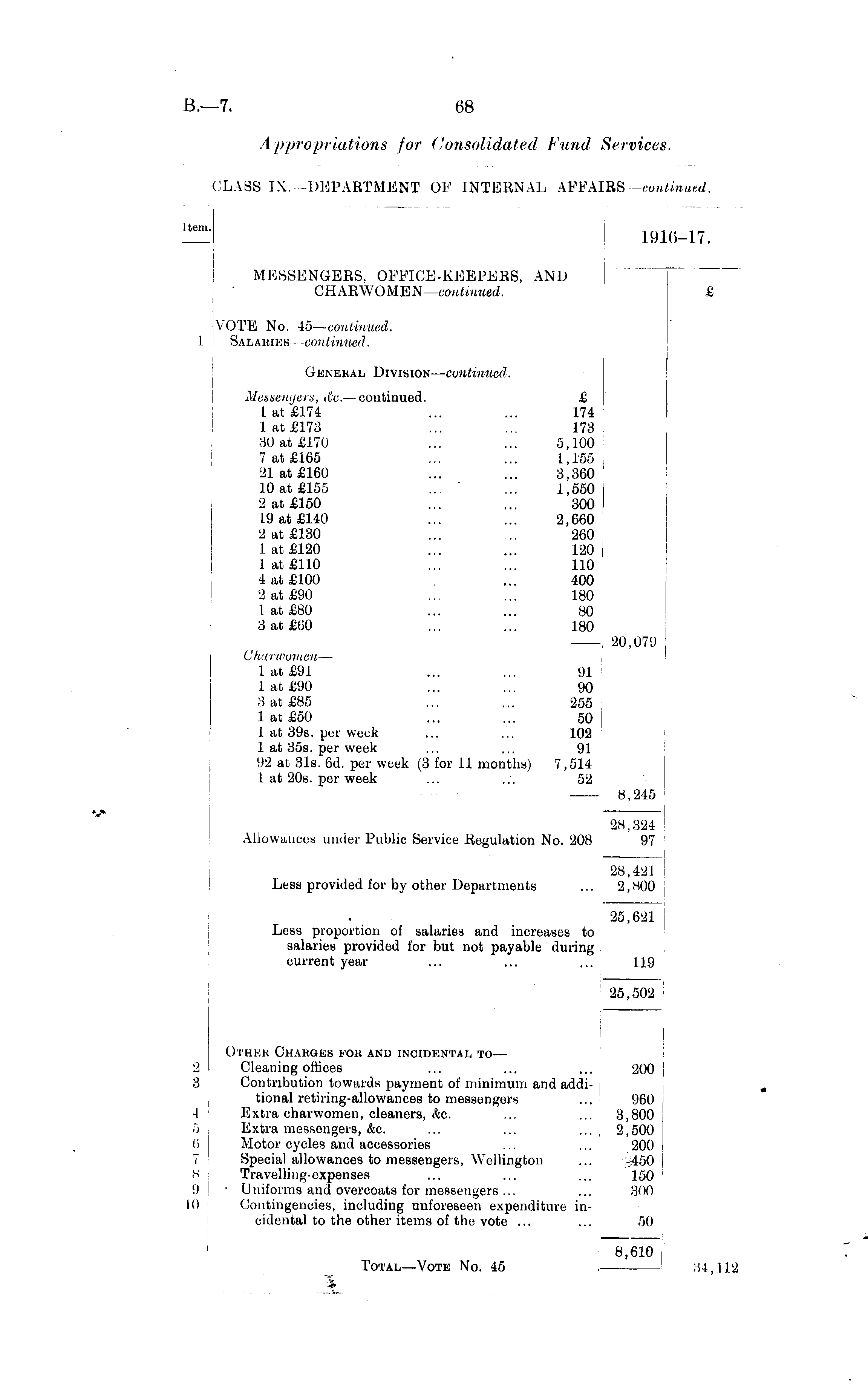 I tern. 1916-17. MESSENGERS, OFFICE-KEEPERS, AND CHARWOMEN— continued. £ VOTE No. Io—continued. Salaries— continued. General Division— continued. Messengers, do. — continued. £ 1 at £174 ... ... 174 lat £173 ... ... 173 30 at £170 ... ... 5,100 7 at £165 ... ... 1,155 , 21 at £160 ... ... 3,360 10 at £155 ... ... 1,550 2 at £150 ... ... 300 I 19 at £140 ... ... 2,660 2 at £130 ... ... 260 1 at £120 ... ... 120 | 1 at £110 ... ... 110 4 at £100 ... 400 2 at £90 ... ... 180 1 at £80 ... ... 80 3 at £60 ... ... 180 20,079 Charwomen — 1 at £91 ... ... 91 1 at £90 ... ... 90 3 at £85 ... ... 255 1 at £50 ... ... 50 1 at 398. per week ... ... 102 1 at 35s. per week ... ... 91 92 at 31s. 6d. per week (3 for 11 months) 7,514 1 at 20s. per week ... ... 52 8,245 28,324 Allowances under Public Service Regulation No. 208 97 28,421 Less provided for by other Departments ... 2,800 j 25,621 Less proportion of salaries and increases to salaries provided for but not payable during current year ... ... ... 119 25,502 2 3 I 6 6 7 8 9 10 Other Charges for and incidental to — Cleaning offices ... ... ... 200 Contribution towards payment of minimum and additional retiring-allowances to messengers ... 960 Extra charwomen, cleaners, <fec. ... ... 3,800 Extra messengers, &c. ... ... ... 2,500 Motor cycles and accessories ... ... 200 Special allowances to messengers, Wellington ... 150 Travelling-expenses ... ... ... 150 • Uniforms and overcoats for messengers ... ... 300 Contingencies, including unforeseen expenditure incidental to the other items of the vote ... ... 50 J 8,610 Total—Vote No. 45 ! 84, US