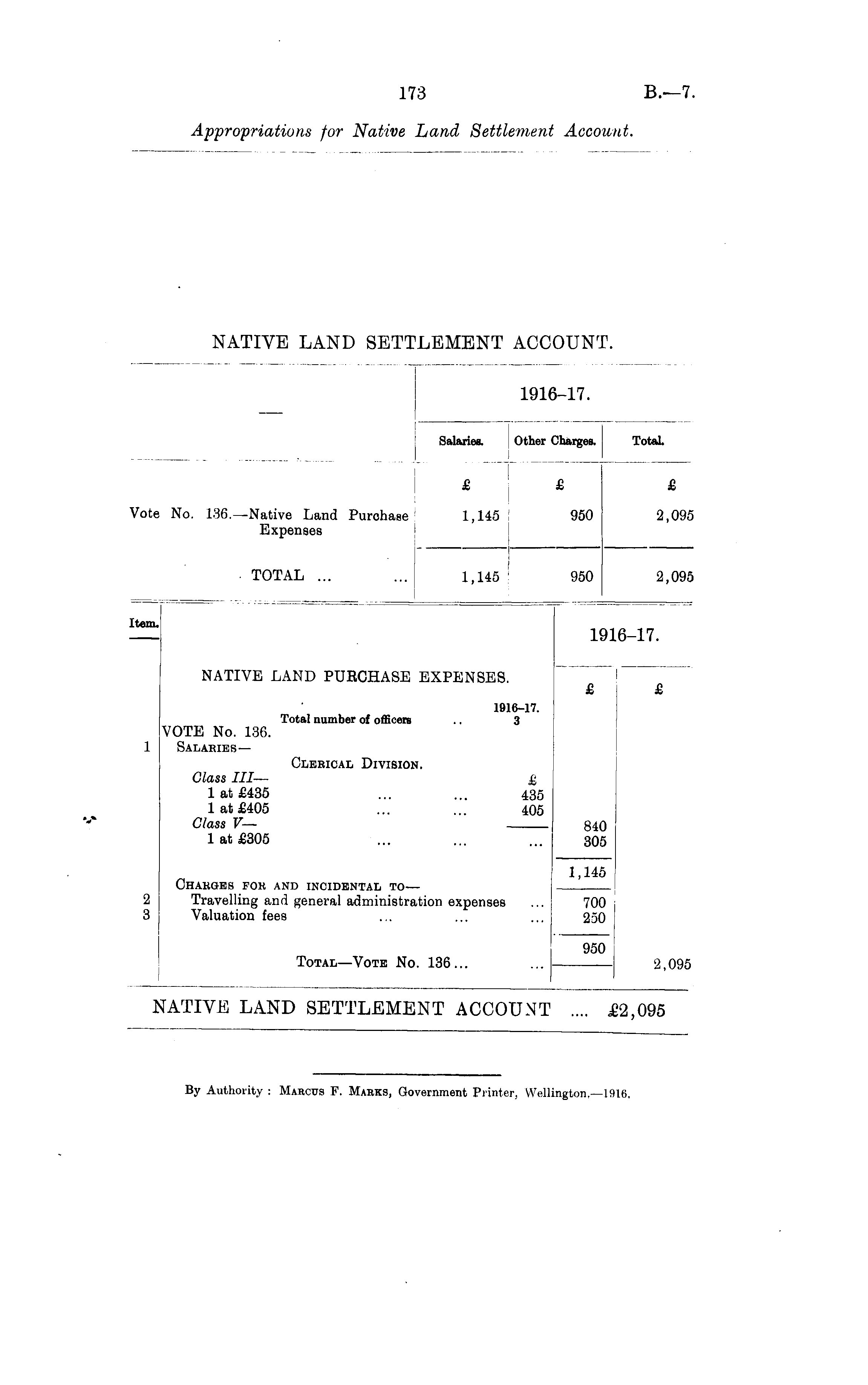 1916-17. Salaries. Other Charges. Total. I I £ £ Vote No. 136.—Native Land Purchase Expenses £ 1,145 ! 950 2,095 • TOTAL ... 1,145 950 2,095 Item. 1916-17. NATIVE LAND PURCHASE EXPENSES. £ I £ 1916-17. Total number of officers .. 3 VOTE No. 136. Salaries— Clerical Division. Class III — £ 1 at £435 ... . . 435 lat £405 ... .. 405 Class V— lat £305 840 305 2 3 Charges for and incidental to — Travelling and general administration expenses Valuation fees 1,145 700 250 Total—Vote No. 136... 950 2,095 ATIVE LAND SETTLEMENT ACCOUNT 12,095