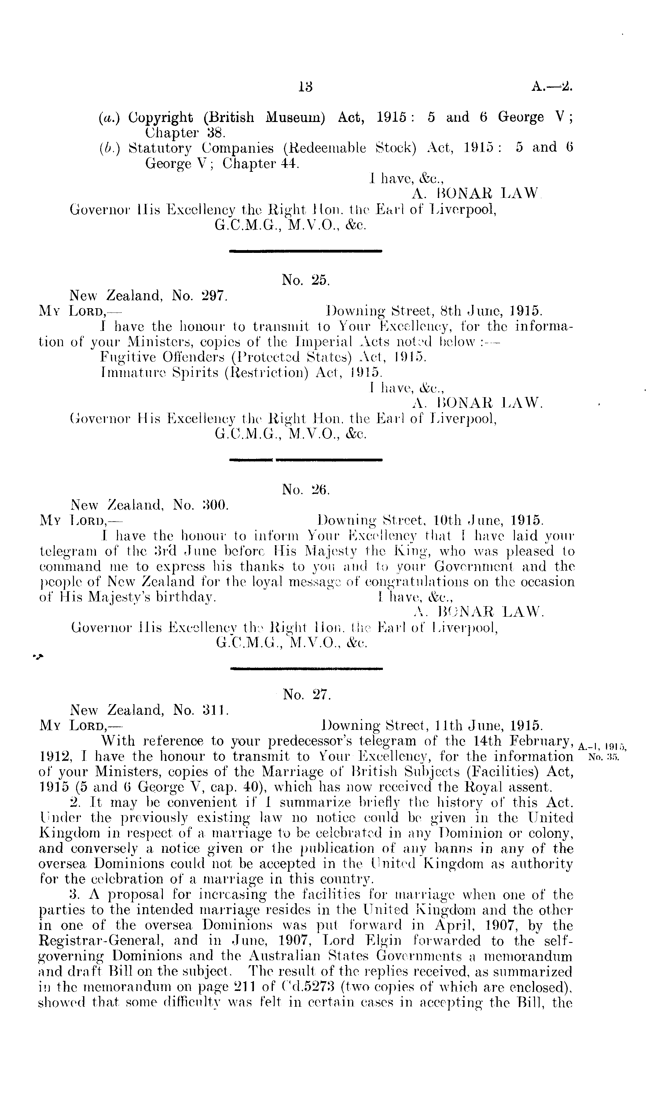 (a.) Copyright (British Museum) Act, 1915 : 5 and 6 George V ; Chapter 38. (b.) Statutory Companies (Redeemable Stock) Act, 1915 : 5 and 6 George V; Chapter 44. I have, &c, A. BONAR LAW Governor His Excellency the Right Hon. the Earl of Liverpool, G.C.M.G., M.V.0., &c.