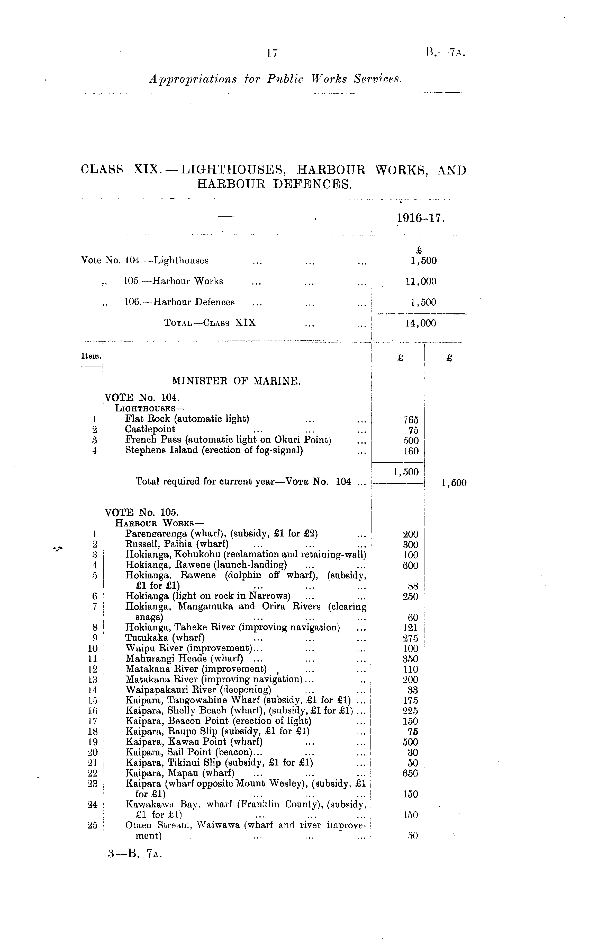 . [''.'* 1016-17. 1 OI ft /ote No. 104.--Lighthouses £ 1,500 £ 1,5 ,, L05.—Harbour Works 11,000 11,0 ,, 106. —Harbour Defences 1,500 1,5 Total-Class XIX 14,0 14, 100 I tern. £ £ £ MINISTER OF MARINE. VOTE No. 104. Lighthouses— 1 ! Flat Rock (automatic light) 2 ! Castlepoint 3 ! French Pass (automatic light on Okuri Point) 4 I Stephens Island (erection of fog-signal) 765 75 500 L60 Total required for current year—Vote No. 104 ... 1,500 1,500 VOTE No. 105. Harbour Works— 1 Parensarenga (wharf), (subsidy, £1 for £2) 2 Russell, Paihia (wharf) 8 Hokianga, Kohukohu (reclamation and retaining-wall) 4 Hokianga, Rawene (launch-landing) 5 Hokianga, Rawene (dolphin off wharf), (subsidy, £lfor£l) 6 : Hokianga (light on rock in Narrows) ... ... 7 j Hokianga, Mangamuka and Orira Rivers (clearing snags) 8! Hokianga, Taheke River (improving navigation) 9 Tutukaka (wharf) 10 Waipu River (improvement)... 11 Mahurangi Heads (wharf) ... 12 Matakana River (improvement) ( ... ... 13 Matakana River (improving navigation)... ... 14 Waipapakauri River (deepening) ... ... 15 Kaipara, Tangowahine Wharf (subsidy, £1 for £1) ... 16 Kaipara, Shelly Beach (wharf), (subsidy, £1 for £1) ... 17 .1 Kaipara, Beacon Point (erection of light) ... | 18 ! Kaipara, Raupo Slip (subsidy, £1 for £i) 19 [ Kaipara, Kawau Point (wharf) 20 i Kaipara, Sail Point (beacon)... 21 | Kaipara, Tikinui Slip (subsidy, £1 for £1) ... 22 : Kaipara, Mapau (wharf) ... ... ... 23 ; Kaipara (wharf opposite Mount Wesley), (subsidy, £1 , for£l) 24 : Kawakawa Bay, wharf (Franklin County), (subsidy, £1 for £1) 25 i Otaeo Stream, Waiwawa (wharf and river improve200 300 100 600 88 250 I 60 121 275 100 350 110 200 33 175 225 150 75 500 30 50 650 150 150 ment) 50