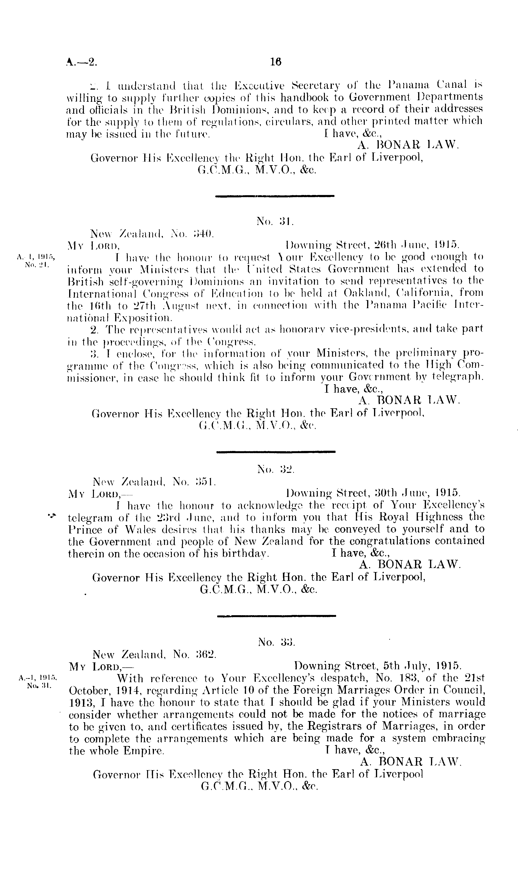 No. 31. New Zealand, No. 340. My Lord, — Downing Street, 26th June, 1915. I have the honour to request Your Lxcellcncy to be good enough to inform your Ministers that the United States Government litis extended to British self-governing Dominions an invitation to send representatives to the International Congress of Education to be held at Oakland, California, from the 16th to 27th August next, in connection with the Panama Pacific International Exposition. 2. The representatives would act as honorary vice-presidents, and take part in the proceedings, of the Congress. 3. I enclose, for the information of your Ministers, the preliminary programme of the Congress, which is also being communicated to the High Commissioner, in case he should think fit to inform your Government by telegraph. I have, &c, A BONAR LAW. Governor His Excellency the Right Hon. the Earl of Liverpool, G.C.M.G., M.V.0., &c.