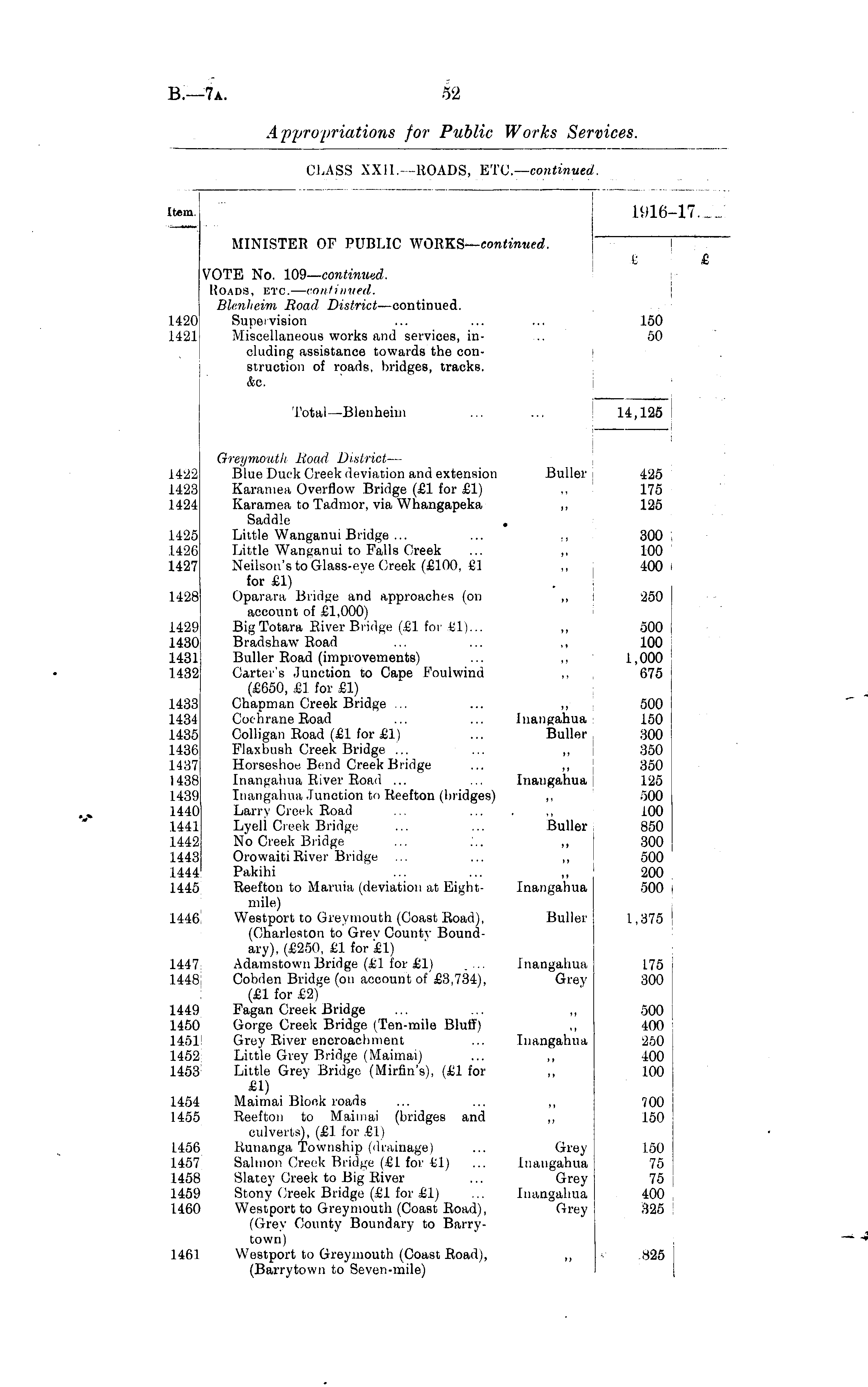 Item. Item. 1916-17. MINISTER OF PUBLIC WORKS— continued. £ £ i 1420 1421 1420 1421 VOTE No. 109— continued,. Roads, etc — continued. Blenheim Road District —continued. Supervision ... ... ... 150 Miscellaneous works and services, in- ... 50 eluding assistance towards the construction of roads, bridges, tracks. &c. Total—Blenheim ... ... 14,125 ■ .*» 1422 1423 1424 1425 1426 1427 1428 1429 1430 1431 1432 1433 1434 1435 1436 1437 1438 1439 1440 1441 1442 1443 1444 1445 1446] 1447 1448 1449 1450 1451 1452 1453 1454 1455 L456 1457 1458 1459 1460 1461 Greymouth Road District — Blue Duck Creek deviation and extension Buller j 425 Karamea Overflow Bridge (£1 for £1) ,, 175 Karamea to Tadmor, via Whangapeka ,, 125 Saddle Little Wanganui Bridge ... ... ,, 300 Little Wanganui to Falls Creek ... ,, 100 Neilson's to Glass-eve Creek (£100, £1 ,, 400 > for £1) Oparara Bridge and approaches (on „ 250 account of £1,000) Big Totara River Bridge (£1 for £1)... ,, 500 Bradshaw Road ... ... ,, 100 Buller Road (improvements) ... ,. L, 000 Carter's Junction to Cape Poulwind ,, 675 (£650, £] for £1) Chapman Creek Bridge ... ... ,, 500 Cochrane Road ... ... Inangahua 150 Colligan Road (£1 for £1) ... Buller 300 Flaxbush Creek Bridge ... ... ,, 350 Horseshoe Bend Creek Bridge ... ,, 350 Inangahua River Road ... ... Inangahua 125 Inangahua Junction to Reefton (bridges) ,. 500 Larrv Creek Road ... ... . ,, LOO Lyell Creek Bridge ... ... Buller 850 No Creek Bridge ... ... ,, 300 Orowaiti River Bridge ... ... ,, 500 Pakihi ... ... ,, 200 Reefton to Maruia (deviation at Eight- Inangahua 500 i mile) Westport to Greymouth (Coast Road), Buller L,375 (Charleston to Grev Countv Boundary), (£250, £1 for £1) Adamstown Bridge (£1 for £1) .... inangahua 175 Cobden Bridge (on account of £3,734), Grey 300 (£1 for £2) Fagan Creek Bridge ... ... ,, 500 Gorge Creek Bridge (Ten-mile Bluff) ,, 400 Grey River encroachment ... Inangahua 260 Little Grey Bridge (Maimai) ... ,, 400 Little Grey Bridge (Mirfin's), (£1 for ,, 100 £1) Maimai Block roads ... ... ,, 700 Reefton to Maimai (bridges and ,, 150 culverts), (£1 for £1) Runanga Township (drainage) ... Grey 150 Salmon Creek Bridge (£1 for £1) ... Inangahua 75 i Slatey Creek to Big River ... Grey 75 * Stony Creek Bridge (£1 for £1) ... Inangahua 400 i Westport to Greymouth (Coast Road), Grey 325 (Grey County Boundary to Barrytown) Westport to Greymouth (Coast Road), ,, 825 (Barrytown to Seven-mile)