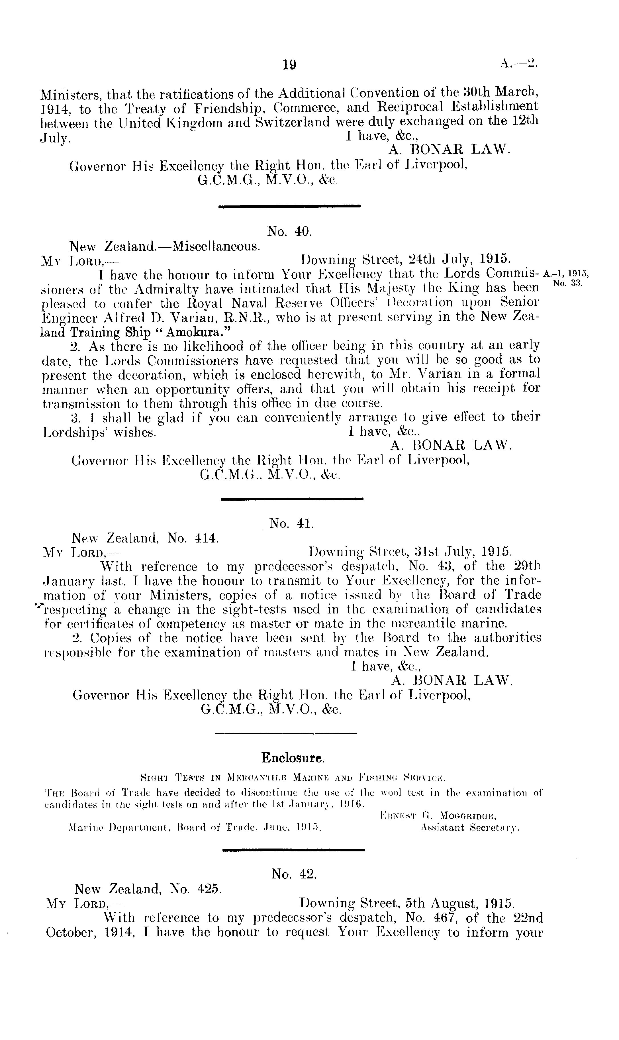No. 42. New Zealand, No. 425. My Lord, — Downing Street, sth August, 1915. With reference to my predecessor's despatch, No. 467, of the 22nd October, 1914, I have the honour to request Your Excellency to inform your