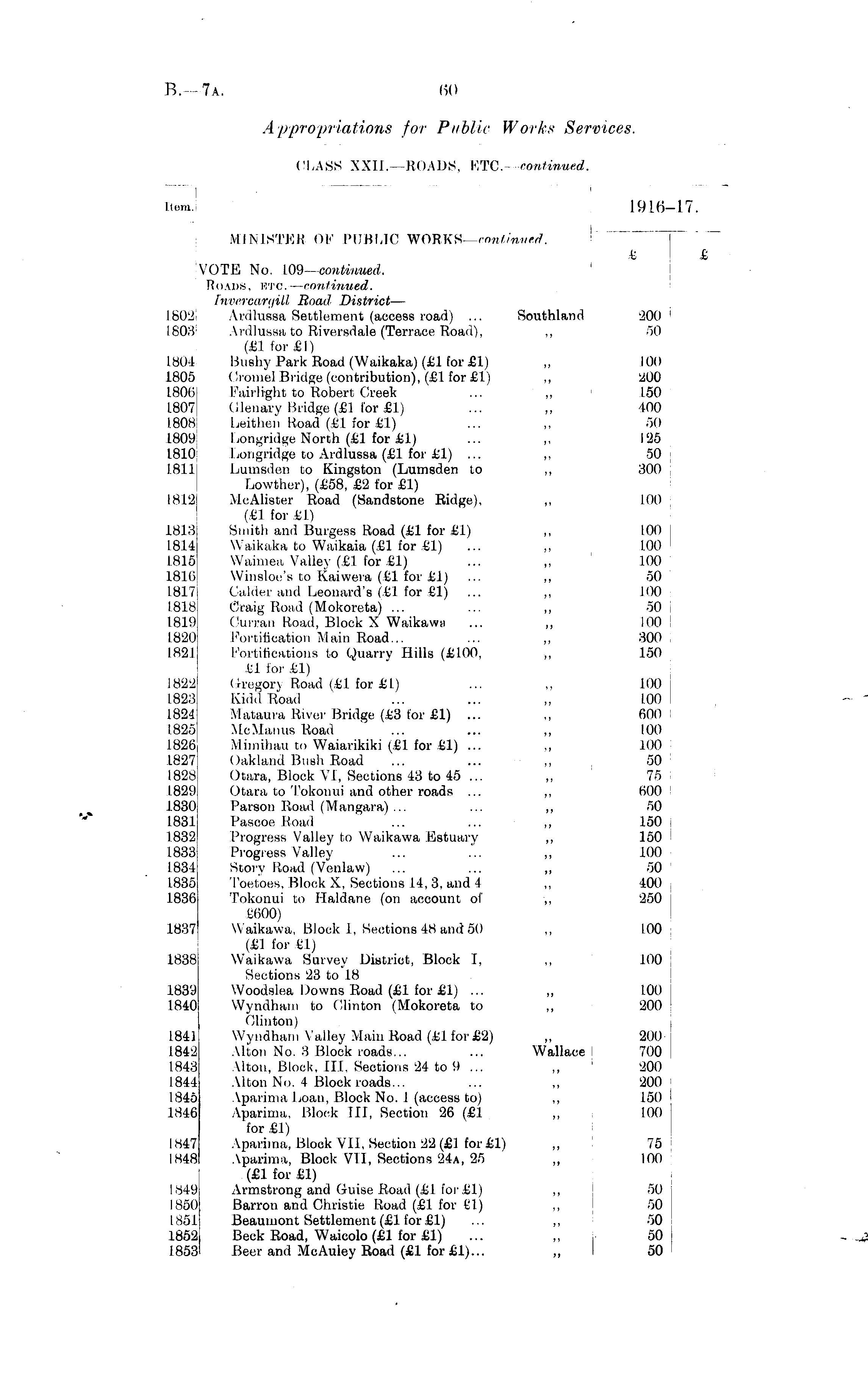 Item. 1916-17. MINISTER OF PUBLIC WOEKS^- continued. VOTE No. 109— continued. Roads, etc. — continued. Invercargill Road District — 1802! Ardlussa Settlement (access road) ... Southland I803 : Ardlussa to Riversdale (Terrace Road), ,, (£1 for£l) 1804 Bushy Park Road (Waikaka) (£1 for £1) 1805 Cromel Bridge (contribution), (£1 for £1) 1806 Fairlight to Robert Creek ... ,, L807 Glenary Bridge (£1 for £1) 1808 Leithen Road' (£1 for £1) 1809 Longridge North (£1 for £1) 1810; Longridge to Ardlussa (£1 for £1) ... ,, 1.8111 Lumsden to Kingston (Lumsden to ,, Lowther), (£58, £2 for £1) 1812 McAlister Road (Sandstone Ridge), ,, (£1 for £1) 1813 Smith ami Burgess Road (£1 for £1) ,, L814 Waikaka to Waikaia (£1 for £1) 1.815 Waimea Valley (£1 for £1) 1816 Winsloe's to Kaiwera (£1 for £1) ... ,, L817 Calder and Leonard's (£1 for £1) ... ,, 1818 Craig Road (Mokoreta) ... 1819 Ourran Road, Block X Waikawa 1820 Fortification Main Road... ... ,, 1821 Fortifications to Quarry Hills (£100. 61 for £1) 1822 Gregory Road (£1 for £ I) 1823 Kidd Road 1824 Mataura Eiver Bridge (£3 for £1) ... 1825 McManus Road ... ... „ 1826 Mimihau to Waiarikiki (£1 for £1) ... ,, 1827 Oakland Bush Road 1828 Otara, Block VI, Sections 43 to 45 ... 1829 Otara to Tokonui and other roads ... ,, 1830 Parson Road (Mangara) ... ... ,, 1831 PasooeEoad 1832 Progress Valley to Waikawa Estuary ,, L833 Progress Valley ... ... „ 1834 Story Road (Venlaw) ... ... ,, L835 Toetoes, Block X, Sections L4, 3, and 4 ,, 1836 Tokonui to Haldane (on account of -,, £600) 1837 Waikawa. Block I. Sections 48 and 50 (£1 for £1) 1838 Waikawa Survey District, Block I, ,, Sections 23 to 18 1839 Woodslea Downs Road (£1 for £1) ... 1840 Wyndham to Clinton (Mokoreta to ,, Clinton) L841 Wyndham Valley Main Road (£1 for£2) 1842 Alton No. 8 Block roads... ... Wallace 1843 Alton, Block, III, Sections 24 to 9 ... 1844 Alton No. 4 Block roads... 1845 Aparima Loan. Block No. 1 (access to) ,, 1846 Aparima, Block III, Section 26 (£1 for £1) 1847 Aparima, Block VII, Section 22 (£1 for£l) 1848 Aparima, Block VII, Sections 24a, 25 (£1 for £1) 1849 Armstrong and Guise Road (£1 for£l) ,, 1850 Barron and Christie Road (£1 for 61) 1851 Beaumont Settlement (£1 for £1) ... ,, 1852 Beck Road, Waicolo (£1 for £1) L853 Beer and McAuley Road (£1 for £1)... £ 200 i 50 100 200 150 400 50 125 50 300 100 100 LOO 100 50 LOO 50 100 300 150 100 LOO 600 100 100 50 ; 75 600 50 150 150 100 50 400 250 100 LOO 100 200 200 700 200 200 150 i 100 75 100 50 50 50 50 50 £