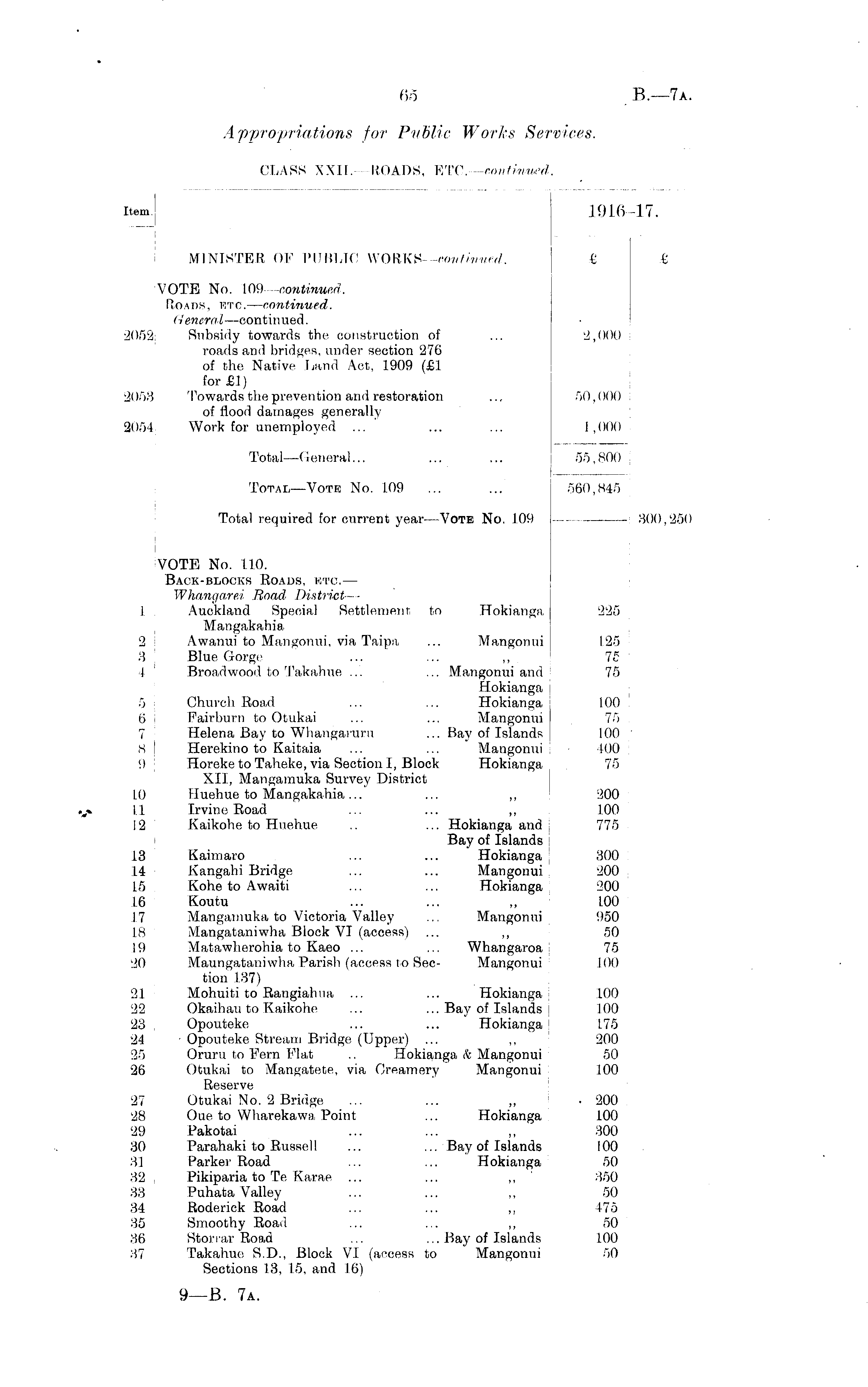 Item 191647. MINISTER OF PUBLIC WORKS -continued. VOTE No. 109 continued. Roads, btc. — continued. General —continued. 2052 Subsidy towards the construction of roads and bridges, under section 276 of the Native Land Act, 1909 (£1 for £1) 2053 Towards the prevention and restoration of flood damages generally 2054 Work for unemployed ... £ £ 2,000 50,000 1 ,000 Total—General... 55,800 Total—Vote No. 109 560,845 Total required for current year—Vote No. 109 , 300,250 .*» VOTE No. 110. Back-blocks Roads, bto. — Whangarei Road District — 1 Auckland Special Settlement to Hokianga Mangakahia, 2 Awanui to Mangonui, via Taipa ... Mangonui 3 Blue Gorge ... ... ,, 4 Broadwood to Takahue ... ... Mangonui and Hokianga 5 Church Road ... ... Hokianga 6 Fairburn to Otukai ... ... Mangonui 7 Helena Bay to Whangarurti ... Bay of Islands 8 Herekino to Kaitaia ... ... Mangonui 9 Horeke to Taheke, via Section I, Block Hokianga XII, Mangamuka Survey District L0 Huehue to Mangakahia... ... ,, 11 Irvine Road ... ... ,, 12 Kaikohe to Huehue .. ... Hokianga and Bay of Islands 13 ... ... Hokianga 14 Kangahi Bridge ... ... Mangonui 15 Kohe to Awaiti ... ... Hokianga 16 Koutu 17 Mangamuka to Victoria Valley ... Mangonui 18 Mangataniwha Block VI (access) ... ,, 19 Matawherohia to Kaeo ... ... Whangaroa 20 Maungataniwha Parish (access to Sec- Mangonui tion 137) 21 Mohuiti to Rangiahtia ... ... Hokianga 22 Okaihau to Kaikohe ... ... Bay of Islands 23 , Opouteke ... ... Hokianga 24 • Opouteke Stream Bridge (Upper) ... ,, 25 Oruru to Fern Flat .. Hokianga k Mangonui 26 Otukai to Mangatete, via Creamery Mangonui Reserve 27 Otukai No. 2 Bridge 28 Oue to Wharekawa Point ... Hokianga 29 Pakotai 30 , Parahaki to Russell ... ... Bay of Islands 31 Parker Road ... ... Hokianga 32 , Pikiparia to Te Karae ... ... ,, 88 Puhata Valley ... ... ,, 34 Roderick Road ... ... ,, 35 Smoothy Road ... ... ,, 36 Storrar Road ... ... Bay of Islands 37 Takahue S.D., Block VI (access to Mangonui Sections 13, 15, and 16) 225 125 75 75 100 75 100 - 400 75 200 100 775 300 200 200 LOO 950 50 75 100 100 100 1.75 200 50 100 • 200 100 300 100 50 350 50 175 50 100 50