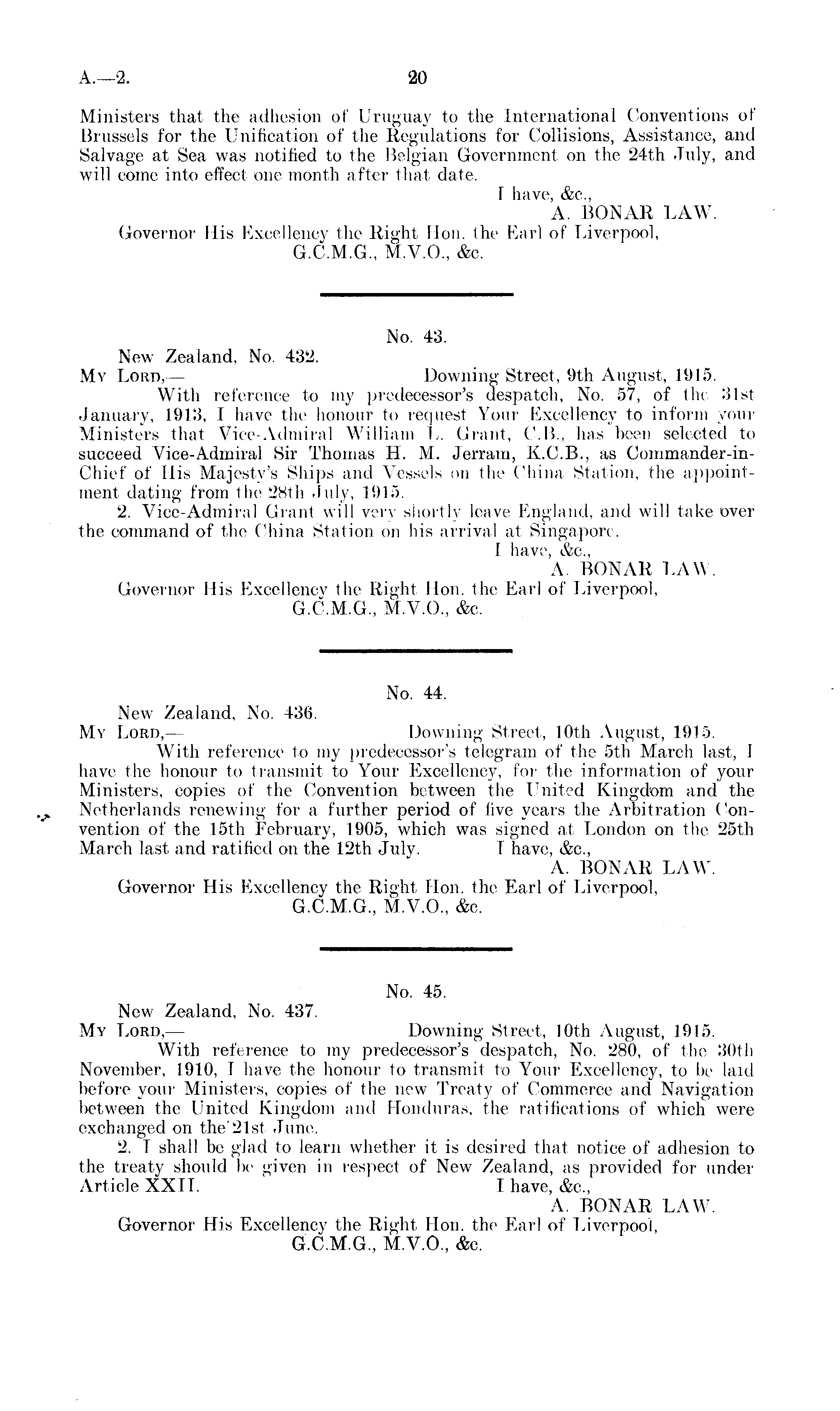 No. 45. New Zealand, No. 437. My Lord, — Downing Street, 10th August, 1915. With reference to my predecessor's despatch, No. 280, of the 30th November, 1910, I have the honour to transmit to Your Excellency, to be laid before your Ministers, copies of the new Treaty of Commerce and Navigation between the United Kingdom and Honduras, the ratifications of which were exchanged on the'2lst June. 2. T shall be glad to learn whether it is desired that notice of adhesion to the treaty should be given in respect of New Zealand, as provided for under Article XXII. I have, &c, A. BONAR LAW. Governor His Excellency the Right Hon. the Earl of Liverpool, G.C.M.G., M.V.0., &c.