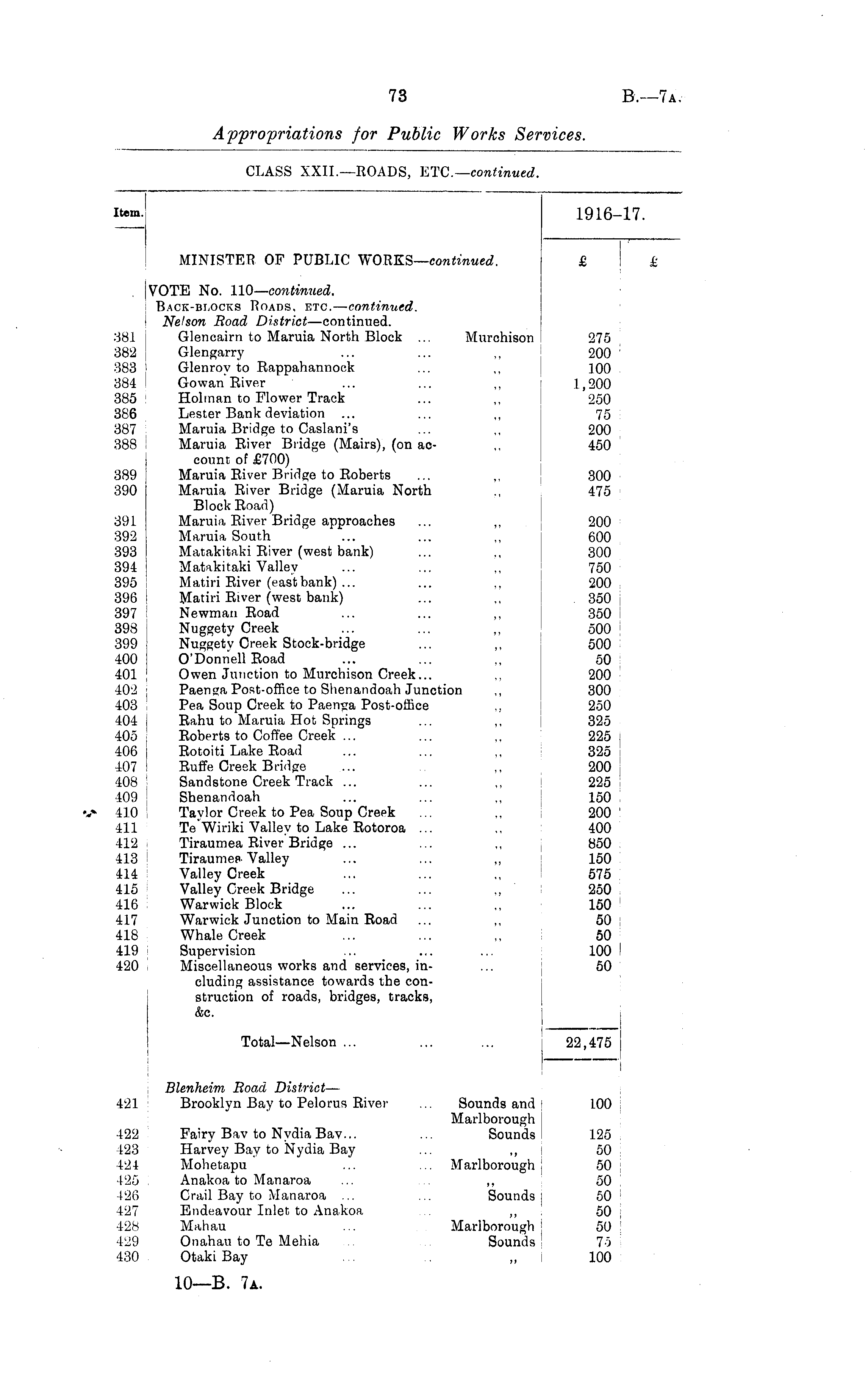 Item. 1916-17. MINISTER OF PUBLIC WORKS— continued. £ £ ■I** 38.1 382 383 384 385 386 387 388 389 390 391 392 393 394 395 396 397 398 399 400 401 402 403 404 405 406 407 408 409 410 411 412 413 414 415 416 417 418 419 420 i 381 382 383 384 385 386 387 388 389 390 391 392 393 394 395 396 397 398 399 400 401 402 403 404 405 406 407 408 409 410 411 412 413 414 415 416 417 418 419 420 VOTE No. 110— continued. Back-blocks Roabs, etc. — continued. Nelson Road District —continued. Glencairn to Maruia North Block ... Murchison Glengarry Glenroy to Rappahannock Gowan River ... ... ,, Holman to Flower Track ... ,, Lester Bank deviation Maruia Bridge to Caslani's Maruia River Bridge (Mairs), (on account of £700) Maruia River Bridge to Roberts Maruia River Bridge (Maruia North Block Road) Maruia River Bridge approaches ... ,, Maruia South Matakitaki River (west bank) Matakitaki Valley Matiri River (eastbank) ... ... ,, Matiri River (west bank) ... ,, Newman Road ... ... ,, Nuggety Creek ... ... ,, Nuggety Creek Stock-bridge ... ,, O'Donnell Road ... ... ,, Owen Junction to Murchison Creek... Paenga Post-office to Shenandoah Junction ,, Pea Soup Creek to Paenga Post-office ,, Rahu to Maruia Hot Springs ... ,, Roberts to Coffee Creek ... Rotoiti Lake Road ... ... ,, Ruffe Creek Bridge Sandstone Creek Track ... Shenandoah Taylor Creek to Pea Soup Crepk ... ,, Te Wiriki Valley to Lake Rotoroa ... Tiraumea River Bridge ... Tiraumea Valley ... ... ,, Valley Creek ... ... ,, Valley Creek Bridge ... ... ,, Warwick Block Warwick Junction to Main Road ... ,, Whale Creek ... ... ,, Supervision Miscellaneous works and services, including assistance towards the construction of roads, bridges, tracks, &c. 275 200 100 1,200 250 75 200 450 300 475 200 600 300 750 200 350 350 500 500 50 200 300 250 325 225 325 200 225 150 200 400 850 150 575 250 150 50 50 100 ! 50 Total—Nelson ... 22,475 421 422 423 424 425 426 427 428 429 430 Blenheim Road District — Brooklyn Bay to Pelorus River ... Sounds and Marlborough Fairy Bav to Nydia Bav... ... Sounds Harvey Bay to Nydia Bay ... ,, Mohetapu ... ... Marlborough Anakoa to Manaroa ... ... ,, Crail Bay to Manaroa ... ... Sounds Endeavour Inlet to Anakoa ... ,, Mahau ... Marlborough Onahau to Te Mehia ... Sounds Otaki Bay ... ,. ,, LOO 125 50 50 50 50 50 50 75 100