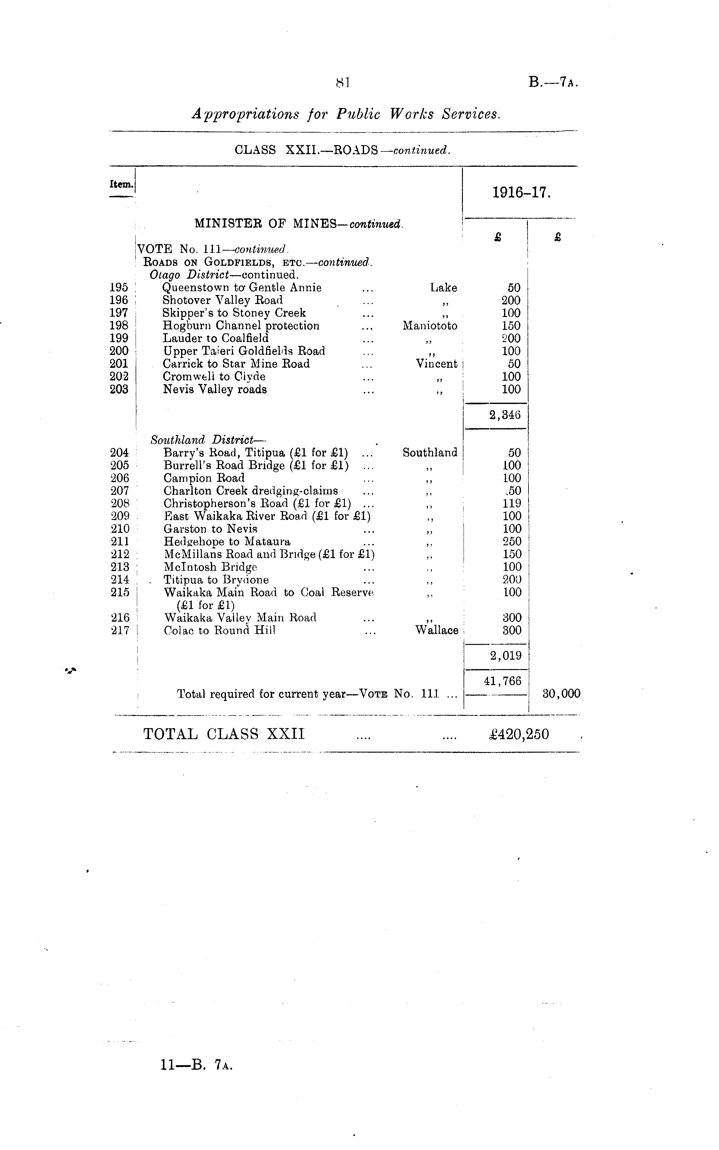 Item. MINISTER OF MINES— continued. 1916-17. VOTE No. Ill—continued. Roads on Goldfields, etc. — continued. Otago District —continued. 195 , Queenstown to Gentle Annie ... Lake 196 Shotover Valley Road ... ,, 197 Skipper's to Stoney Creek ... ,, 198 i Hogburn Channel protection ... Maniototo 199 ! Lauder to Coalfield 200; Upper Taieri Goldfields Road 201 Carrick to Star Mine Road ... Vincent 202 Cromwell to Clyde 203 Nevis Valley roads ... ,, | | £ 50 200 100 150 200 100 50 100 100 2,346 Southland, District — 204 Barry's Road, Titipua (£1 for £1) ... Southland 205 Burrell's Road Bridge (£1 for £1) ... 206 Campion Road ... ,, 207 Charlton Creek dredging-claims ... ,, 208 Christopherson's Road (£1 for £1) ... ,, 209 East Waikaka River Road (£1 for £1) 210 Garston to Nevis ... ,, 211 Hedgehope to Mataura ... ,, 212 McMillans Road and Bridge (£1 for £1) 213 Mcintosh Bridge 214 ! . Titipua to Brydone 215 Waikaka Main Road to Coal Reserve (£1 for £1) 216 Waikaka Valley Main Road ... ,, 21.7 Colac to Round Hill ... Wallace 50 100 100 .50 119 100 100 250 150 100 200 100 300 300 2,019 ,** 41,766 Total required for current year—Vote No. Ill ... j 3( 30,001 TOTAL CLASS XXII £420,250 £420, !50