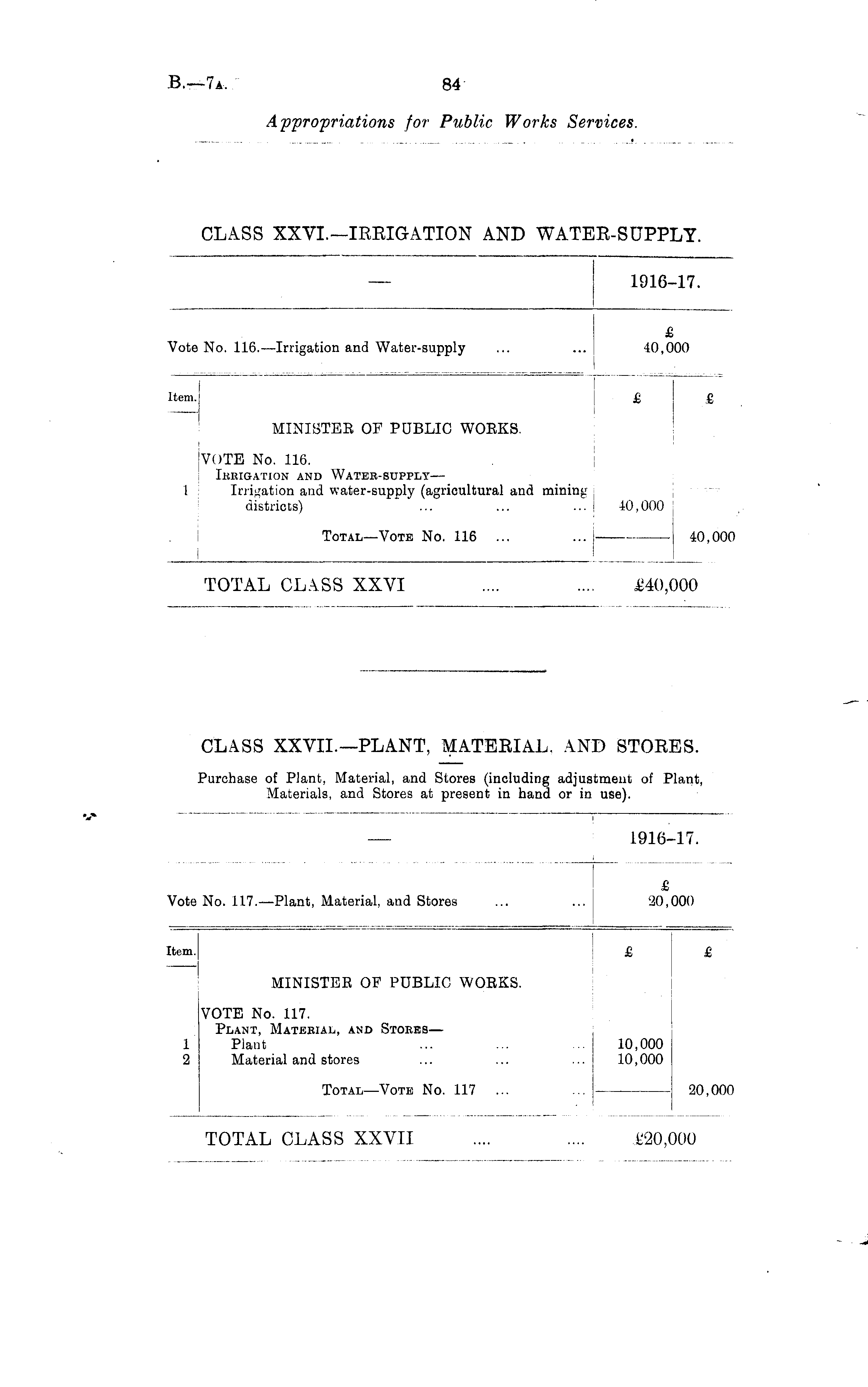 1916-17. Vote No. 116. —Irrigation and Water-supply £ 40,000 Item. £ MINISTER OF PUBLIC WORKS. £ VOTE No. 116. Irrigation and Water-supply— 1 Irrigation and water-supply (agricultural and mining districts) ... ... ...' 40,000 Total—Vote No. 116 ... ... 40,000 TOTAL CLASS XXVI £40,000