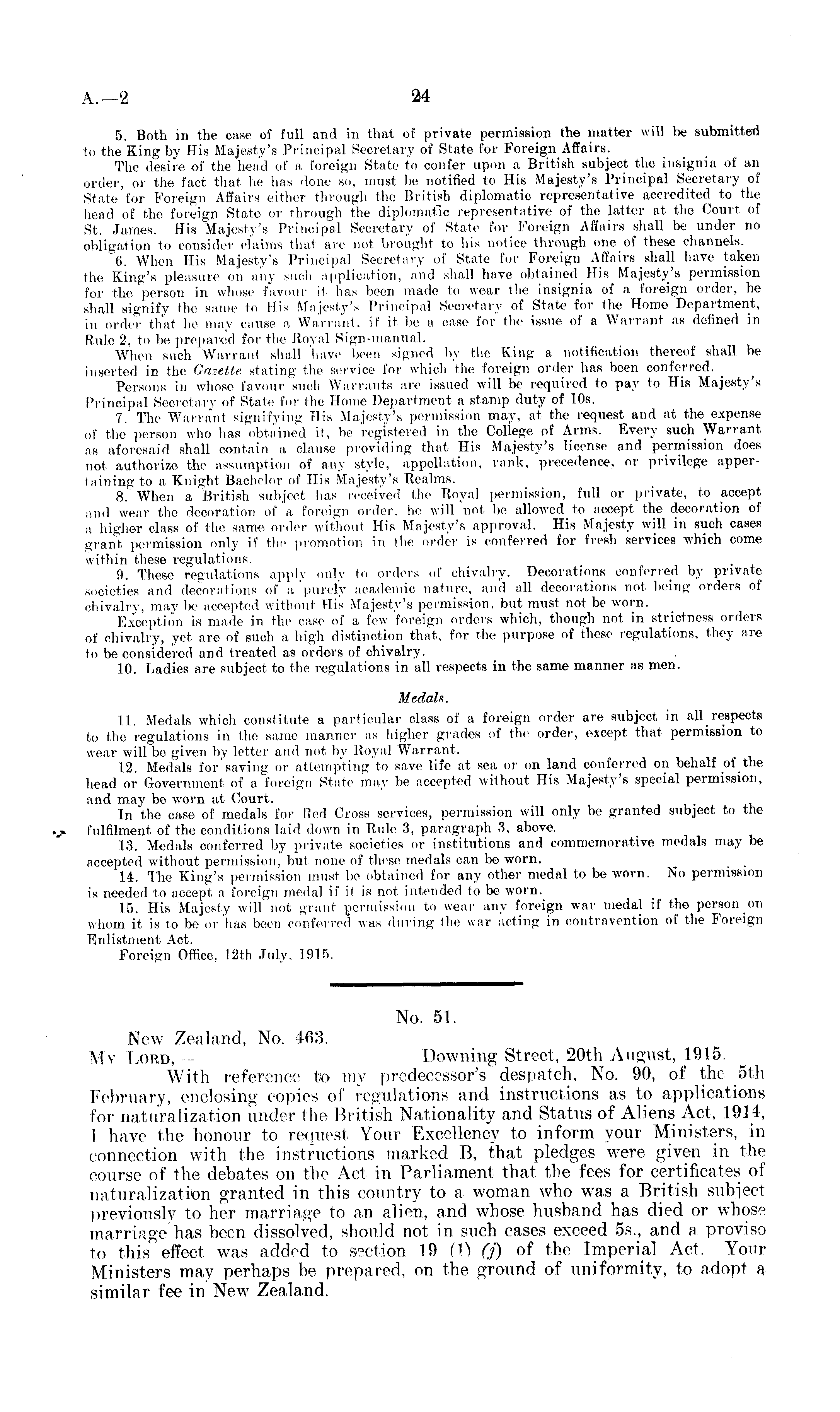 5. Both in the case of full and in that of private permission the matter will be submitted to the King by His Majesty's Principal Secretary of State for Foreign Affairs. The desire of the head of a foreign State to confer upon a British subject tho insignia of an order, or the fact that he has done so, must be notified to His Majesty's Principal Secretary of State for Foreign Affairs either through the British diplomatic representative accredited to the head of the foreign State or through the diplomatic representative of the latter at the Court of St. James. His Majesty's Principal Secretary of State for Foreign Affairs shall be under no obligation to consider claims that are not brought to his notice through one of these channels. "6. When His Majesty's Principal Secretary of State for Foreign Affairs shall have taken the King's pleasure on any such application, and shall have obtained His Majesty's permission for the person in whose favour it, has been made to wear the insignia of a foreign order, he shall signify the same to His Majesty's Principal Secretary of State for the Home Department, in order that he may cause a Warrant, if it, be a case for the issue of a Warrant as defined in Rule 2, to be prepared for the Royal Sign-manual. When such Warrant shall have been signed by the King a notification thereof shall be inserted in the Gazette, stating the service for which the foreign order has been conferred. _ Persons in whose favour such Warrants are issued will be required to pay to His Majesty's Principal Secretary of State for the Home Department a stamp duty of 10s. 7. The Warrant signifying His Majesty's permission may, at the request and at the expense of the person who has obtained it, be registered in the College of Arms. Every such Warrant as aforesaid shall contain a clause providing that His Majesty's license and permission does not authorize the assumption of any style, appellation, rank, precedence, or privilege appertaining to a Knight Bachelor of His Majesty's Realms. 8. When a British subject has received the Royal permission, full or private, to accept and wear the decoration of a foreign order, he will not be allowed to accept the decoration of a higher class of the same order without His Majesty's approval. His Majesty will in such cases grant permission only if the promotion in the order is conferred for fresh services which come within these regulations. 9. These regulations apply only to orders of chivalry. Decorations conferred by private societies and decorations of a purely academic nature, and all decorations not being orders of chivalry, may be accepted without Hi's Majesty's permission, but must, not be worn. Exception is made in the case of a few foreign orders which, though not in strictness orders of chivalry, yet are of such a high distinction that, for the purpose of these regulations, they are to be considered and treated as orders of chivalry. 10. Ladies are subject to the regulations in all respects in the same manner as men. Medals. 11. Medals which constitute a particular class of a foreign order are subject in all respects to the regulations in the same manner as higher grades of the order, except that permission to wear will be given by letter and not by Royal Warrant. 12. Medals for saving or attempting to save life at sea or on land conferred on behalf of the head or Government of a foreign State may be accepted without. His Majesty's special permission, and may be worn at Court. In the case of medals for Red Cross services, permission will only be granted subject to the ..> fulfilment of the conditions laid down in Rule 3, paragraph 3, above. 13. Medals conferred by private societies or institutions and commemorative medals may be accepted without permission, but none of these medals can be worn. 14. Ihe King's permission must be obtained for any other medal to be worn. No permission is needed to accept a foreign medal if it is not intended to be worn. 15. His Majesty will not grant permission to wear any foreign war medal if the person on whom it is to be or'has been conferred was during the war acting in contravention of the Foreign Enlistment Act. Foreign Office, 12th July, 1915.