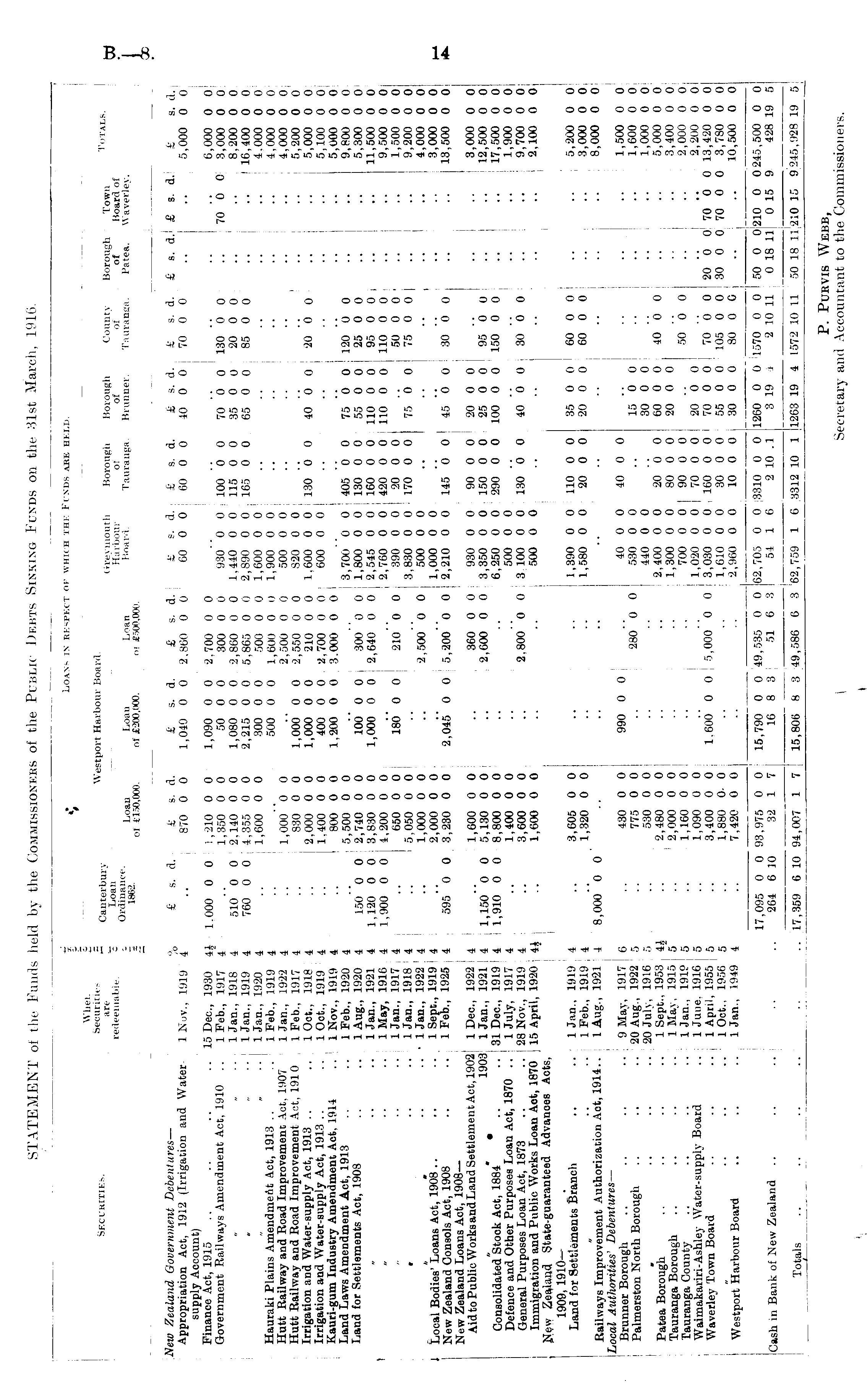 7 -£ .» LOANS IN RKSPECT OF WHICH THE FlTNDS ABE HELD. • * When 1 | Sfpi-ritifs Securities 0 n.»t— •— Westport Harbour Board. Sf.clkities. are m Canteibuij .Grevmoutli Borough Borough County redeemable. c Loan Harbour of of of 2 iS5> ne6 ' Loan Loan Loan Board. Tauranga. Brunner. Tauranga. 1Hbi! - of £150,000. of £200.000. of £500,000. Borough Town Totals. of Board of Patea. Waverley. J__ J I I L_ ! !_ I : | I II I I I New Zealand Government Debentures — % £ s. d. £ s. d. £ s. d. £ s. d. £ s. d. £ s. d. £ s. d. £ s. d. Appropriation Act, 1912 (Irrigation and Water- 1 Nov., 1919 4 .. 870 0 0 1,040 0 0 2,860 0 0 60 0 0 60 0 0 40 0 0 70 0 0 supply Account) Finance Act, 1915 .. .. .. .. 15 Dec, 1930 4J 1.000 0 0 1,210 0 0 : 1,090 0 0 2,700 0 0 Government Railways Amendment Act, 1910 .. 1 Feb., 1917 4 .. 1,350 0 0 50 0 0 300 0 0 930 0 0 100 0 0 70 0 0 130 0 0 .... Uan., 1918 4 510 0 0 2,140 0 0 1,080 0 0 2,860 0 0 1,440 0 0 115 0 0 35 0 0 20 0 0 .. Uan., 1919 j 4 760 0 0 4,355 0 0 2,215 0 0 5,865 0 0 2,890 0 0 165 0 0 65 0 0 85 0 0 . Uan., 1920 4 .. 1,600 0 0 300 0 0 500 0 0 1,600 0 0 Hauraki Plains Amendment Act, 1913 .. . 1 Feb., 1919 4 .. .. 500 0 0 1,600 0 0 1,900 0 0 Hutt Railway and Road Improvement Act, 1907 1 Jan., 1922 4 .. 1,000 0 0 .. 2,500 0 0 500 0 0 Hutt Railway and Road Improvement Act, 1910 1 Feb., 1917 1 .. 830 0 0 1,000 0 0 2,550 0 0 820 0 0 Irrigation and Water-supply Act, 1913 .. .. 1 Oct., 1918; 4 2,000 0 0 1,000 0 0 210 0 0 1,600 0 0 130 0 0 40 0 0 20 0 0 Irrigation and Water-supply Act, 1913 .. .. 1 Oot., 1919 4 .. 1,400 0 0 400 0 0 2,700 0 0 j 600 0 0 Kauri-gum Industry Amendment Act, 1914 .. 1 Nov., 1919 i .. 800 0 0 1.200 0 0 3.000 0 0 Land Laws Amendment Act, 1913 .. .. 1 Feb., 1920 4 .. 5,500 0 0 .. .. 3,700 0 0 405 0 0 75 0 0 120 0 0 Land for Settlements Act, 1908 .. .. 1 Aug., 1920 4 150 0 0 2,740 0 0 100 0 0 300 0 0 1,800 0 0 i 130 0 0 55 0 0 25 0 0 Uan., 1921 4 1.120 0 0 3,830 0 0 ! 1,000 0 0 2,640 0 0 2,545 0 0 160 0 0 110 0 0 95 0 0 .... 1 May, 1916 4 1,900 0 0 4,200 0 0 .. .. 2,760 0 0 | 420 0 0 110 0 0 110 0 0 .... I Uan., 1917 1 4 .. 650 0 0 j 180 0 0 210 0 0 390 0 0 | 20 0 0 .. 50 0 0 , .... Uan., 1918 ! 4 .. 5,050 0 0 .. .. 3,830 0 0 1 170 0 0 75 0 0 75 0 0 • • ' Uan., 1922! 4 .. 1,000 0 0 .. 2,500 0 0 500 0 0 ; Local Bodies' Loans Act, 1908 .. -• --I 1 Sept., 1919 U .. 2,000 0 0 .. .. 1,000 0 0i New Zealand Consols Act, 1908 -. .. 1 Feb., 1925 j 4 595 0 0 3,230 0 0 2,045 0 0 5,200 0 0 2,210 0 0 145 0 0 45 0 0 30 0 0 New Zealand Loans Act, 1908— Aid to Public Works and Land Settlement Act, 1902 1 Dee., 1922 4 .. 1,600 0 0 .. 360 0 0 930 0 0 I 90 0 0 20 0 0 1903 Uan., 1921! 4 1,150 0 0 5,130 0 0 .. 2,600 0 0 3,350 0 0 150 0 0 25 0 0 95 0 0 Consolidated Stook Act, 1884 .. ..31 Dec., 1919 4 1,910 0 0 8,800 0 0 .. .. 6,250 0 0 290 0 0 100 0 0 150 0 0 Defence and Other Purposes Loan Act, 1870 .. ! 1 July, 1917 4 .. 1,400 0 0 .. .. 500 0 0 General Purposes Loan Act, 1873 .. .. 28 Nov., 1919 4 .. 3,600 0 0 .. 2.800 0 0 3 100 0 0 130 0 0 40 0 0 30 0 0 Immigration and Public Works Loan Act, 1870 . 15 April, 1920 4£ .. 1,600 0 0 .. .. 500 0 0 New Zealand State-guaranteed Advances Acts, 1909,1910Land for Settlements Branch .. •■ Uan., 1919 J 4 .. 3,605 0 0 .. .. 1,390 0 0 110 0 0 35 0 0 60 0 0 .. 1 Feb., 1919 4 .. 1,320 0 0 .. .. 1,580 0 0 | 20 0 0 20 0 0 60 0 0 Railways Improvement Authorization Act, 1914.. lAug., 1921 4 8,000 0 0 Local Authorities' Debentures — Brunner Borough .. .. • • • • 9 Mav, 1917 6 .. 430 0 0 990 0 0 .. 40 0 0 40 0 0 Palmerston North Borough 20 Aug., 1922 5 .. 775 0 0 .. 280 0 0 530 0 0 .. 15 0 0 20 Julv, 1916 5 .. 530 0 0 .. .. 440 0 0 .. 30 0 0 Patea Borough 1 Sept., 1953 4£ .. 2,480 0 0 .. .. 2,400 0 0 20 0 0 60 0 0 40 0 0 Tauranga Borough .. .. .. .. 1 Mav, 1915 5 .. '2,000 0 0 .. .. 1,300 0 0 80 0 0 20 0 0 Tauranga County .. .. .. .. Uan'., 1919 5 .. 1,160 0 0 .. .. 700 0 0 | 90 0 0 .. 50 0 0 Waimakariri-Ashley Water-supplv Board .. Uune. 1916 5 .. 1,090 0 0 .. .. 1,020 0 0 | 70 0 0 20 0 0 Waverlev Town Board .. .. .. 1 April, 1955 5 .. 3,400 0 0 1.600 0 0 5,000 0 0 3,030 0 0 , 160 0 0 70 0 0 70 0 0 .. lOot., 1956 5 .. 1,880 0-0 .. .. 1,610 0 0 30 0 0 55 0 0 105 0 0 Westport Harbour Board Uan., 1949 4 .. 7,420 0 0 .. 2,960 0 0 10 0 0 30 0 0 80 0 0 17,095 0 0 93,975 0 0 15,790 0 0 49,535 0 0 62,705 0 0 3310 0 0 1260 0 0 1570 0 0 Cash in Bank of New Zealand .. .. .. .. .. j 264 6 10 32 1 7 16 8 3 51 6 8 54 1 6 2 10.1 3 19 4 21011 £ s. d. £ s. d. £ a. d. 5,000 0 0 6,000 0 0 70 0 0 3,000 0 0 8,200 0 0 16,400 0 Oj 4,000 0 0 ; 4,000 0 0 4,000 0 0 5,200 0 0 5,000 0 0 5,100 0 0 5,000 0 0 9,800 0 0 5,300 0 0 11,500 0 0 9,500 0 0 1,500 0 0 9,200 0 0 4,000 0 0 3,000 0 0 13,500 0 0 3,000 0 0 12,500 0 0 17,500 0 0 1,900 0 0 9,700 0 0 2,100 0 0 5,200 0 0 3,000 0 0 8,000 0 0 1,500 0 0 1,600 0 0 1,000 0 0 5,000 0 0 3,400 0 0 2,000 0 0 .. 2,200 0 0 20 0 0 70 0 0 13,420 0 0 30 0 0 70 0 0 3,780 0 0 10,500 0 0 50 0 0210 0 0245,500 0 0 0 18 11 0 15 9. 428 19 5 ! I 1260 0 0 1570 0 0 3 19 i 2 10 11 50 0 0210 0 0245,500 0 0 0 18 11 0 15 9 428 19 5 Totals .. .. .. .J .. .. 17,359 6 10 94,007 1 7 15,806 8 3 49,586 6 3 62,759 1 6 3312 10 1 1263 19 4 1572 10 11 15,806 8 3 49,586 6 3 162,759 1 6 8312 10 1 11263 19 4 1572 10 11 50 18 11|310 15 9245,928 19 5| 50 18 11|310 15 9245,928 19 5 P. Puevib Webb, Secretary and Accountant to the Commissioners.