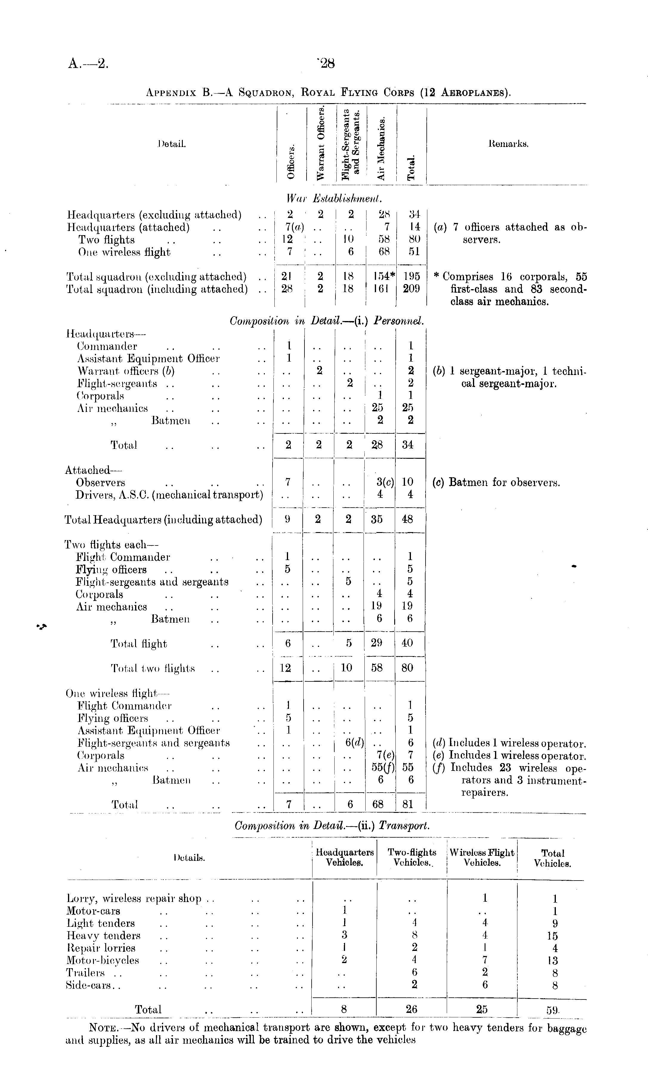 P I cc • I 1 § ° i PSlet!Ui - e a 41 o * |S_* ca o J o to 1; -t I & Remarks. I4W E.slablisfiinci, '('All. Headquarters (excluding attached) .. ' 2 2 2 Headquarters (attached) .. .. j 7(a) Two flights 12 .. 10 One wireless flight .. .. 7 j .. 6 28 .'11 7 14 58 80 68 51 (a) 7 officers attached as observers. Total squadron (excluding attached) .. 21 2 IS Total squadron (including attached) ..28 2 IS 154* 195 181 209 * Comprises 16 corporals, 55 first-class and 83 secondclass air mechanics. Composition in Detail. —(i.) ion in ) Personnel. I [eadquarters — Commander .. .. .. I Assistant Equipment Officer .. 1 Warrant officers (b) .. .... 2 .. Flieht-serceants .. .. 2 (!orporals .. .. Air mechanics .. .. i „ Batmen .. I 1 L 1 2 2 1 I 25 25 2 2 (b) 1 sergeant-major, 1 technical sergeant-major. Total .. .. ..2 2 2 ll 2 28 34 Attached — Observers .. . . . . 7 Drivers, A.S.C. (mechanical transport) 7 3(c) 10 4 4 (c) Batmen for observers. 10 4 . Total Headquarters (in eluding attached) ( .) 2 2 i 9 35 48 48 Two flights each— Flight Commander .. .. 1 Flying officers .. .. .. 5 Flight-sergeants and sergeants 5 Corporals . . . . Air mechanics . . .. 1 1 5 I 5 5 4 19 (i 4 I!) „ Batmen . . 6 Total flight . . . . 6 . . 5 . 6 29 41) Total two flights .. .. 12 .. 10 ( One wireless flight— Flight Commander .. .. 1 Flying officers . . . . . . 5 Assistant Equipment Officer '.. 1 Flight-sergeants and sergeants 6(d) Corporals . . . . Air mechanics .. .. I 12 I 5 1 58 80 1 5 I 6 7 55 6 '7(e) 55(/) 6 (il) Includes I wireless operator. (e) Includes 1 wireless operator, (/) Includes 23 wireless operators and 3 instrumentrepairers. ,, Batmen .. .. __._ J 7 6 I 7 68 81 Composition in Detail. —(ii.) ition i\ Detail. —(ii.) Tn '/nspori ., , .. Headquarters Dettuk Vehicles. Headquarters Vehicles. Two-fiig, Vehicle I its Wireless Plight Vehielos. Total Vehicles. IS.. Lorry, wireless repair shop Motor-cars .. . . . . . . I Light tenders . . . . . . . . I Heavy tenders .. . . . . .. 8 Repair lorries .. .. .. .. I Motor-bicycles .. .. .. .. 2 Trailers Side-cars.. I I 3 I 2 4 8 2 1 1 4 4 I 7 2 6 J 1 9 15 4 13 8 8 6 2 Total .. 8 Note. —No drivers of mechanical transport are shown, and supplies, as all air mechanics will be trained to drive the 26 25 heavy tende: 59 •s for baggage ixcept for twc vehicles