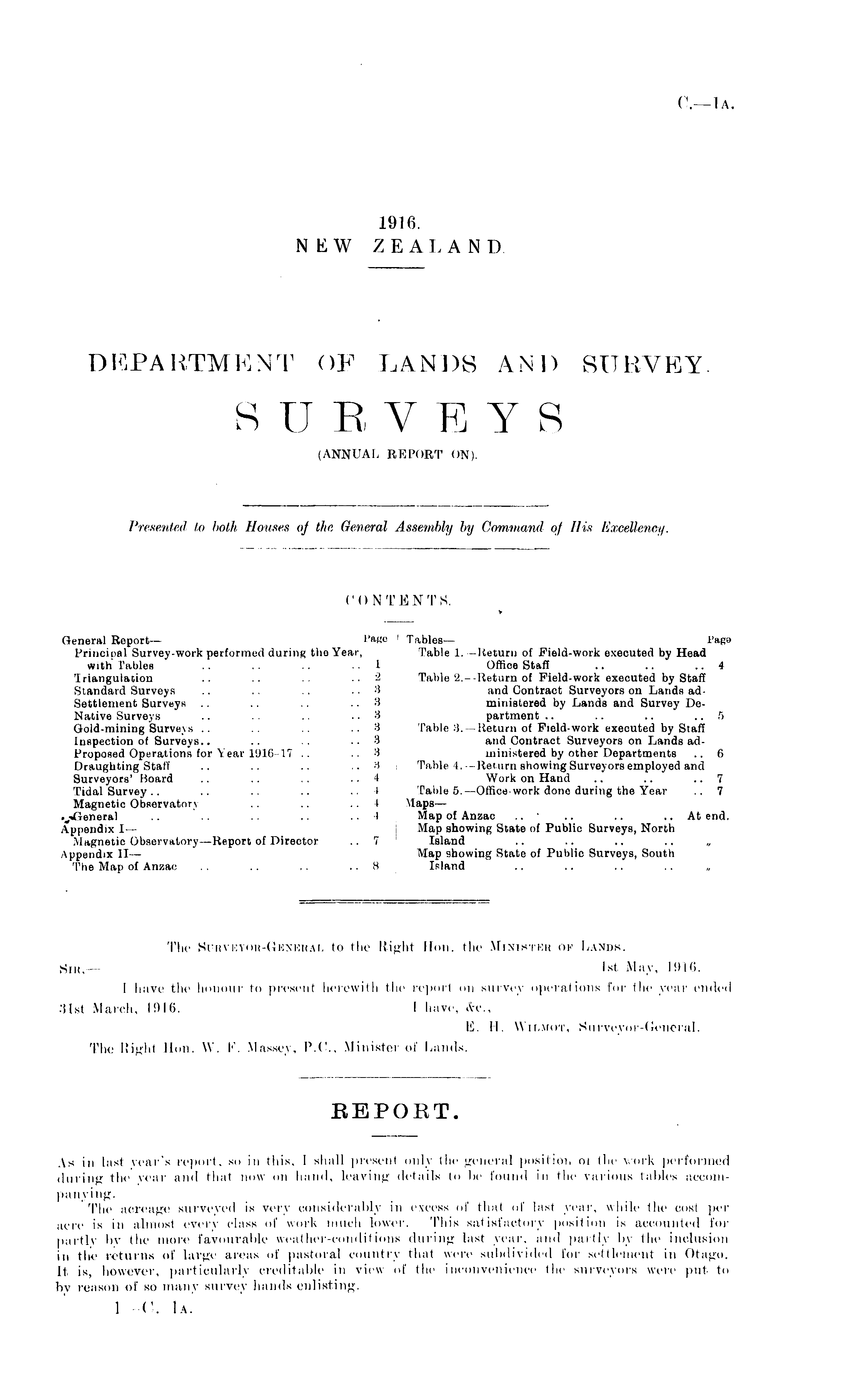 The Burveyor-Gbhrral to the Right Hon. the Mihibthb of Lands. Sir,— Ist May, 1916. I havr the honour to present herewith the repoii on survey operations for the year ended .'Slst March, 1916. I have, &0., E. H. W'n.MOT, Surveyor-General. The Bight Hon. W. !•'. Massey, P.C., Minister ol' I.amis.