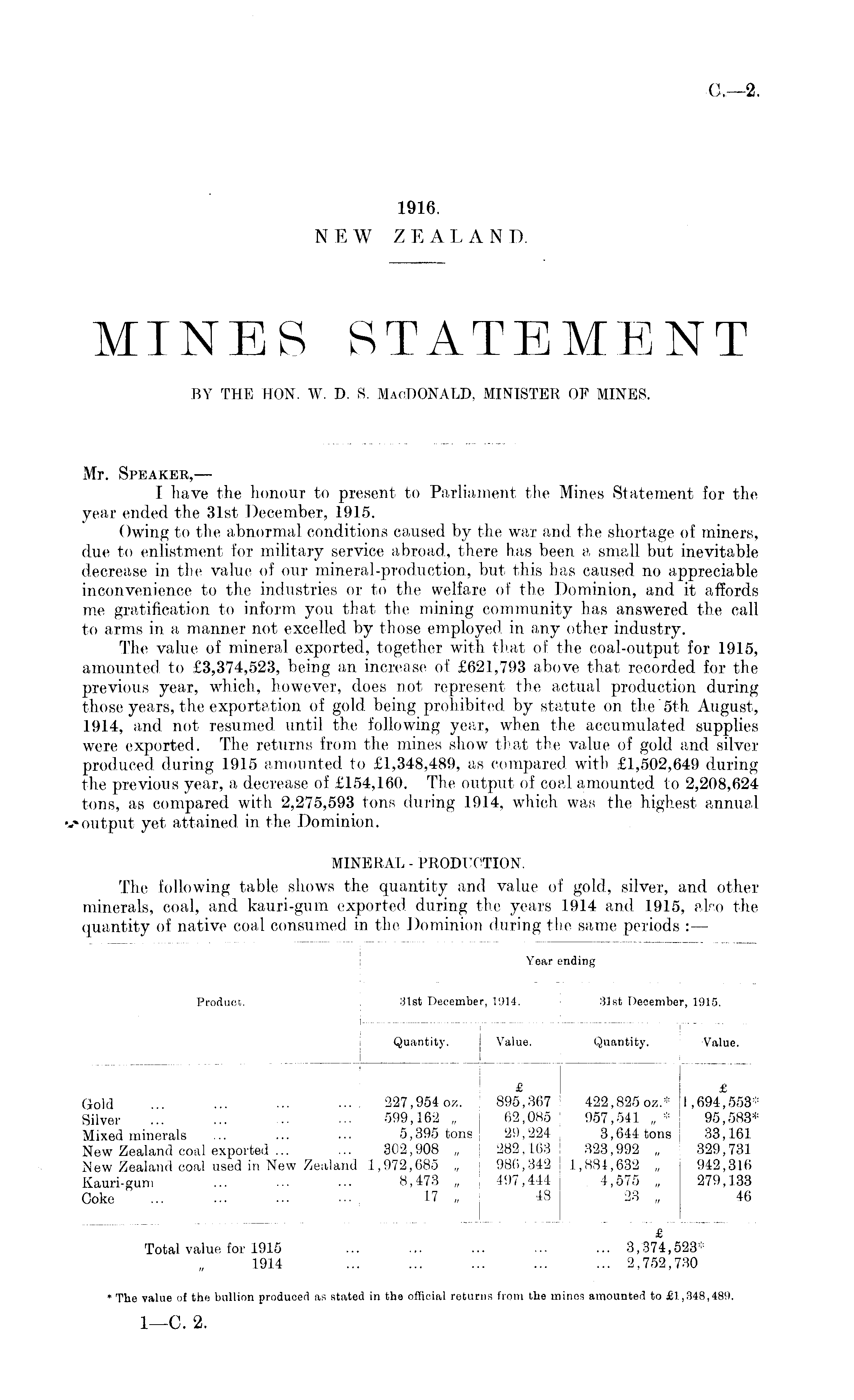 Mr. Speaker,— I have the honour to present to Parliament the Mines Statement for the year ended the 31st December, 1915. Owing to the abnormal conditions caused by the war and the shortage of miners, due to enlistment for military service abroad, there has been a small but inevitable decrease in the value of our mineral-production, but this has caused no appreciable inconvenience to the industries or to the welfare of the Dominion, and it affords me gratification to inform you that the mining community has answered the call to arms in a manner not excelled by those employed in any other industry. The value of mineral exported, together with that of the coal-output for 1915, amounted to £3,374,523, being an increase of £621,793 above that recorded for the previous year, which, however, does not represent the actual production during those years, the exportation of gold being prohibited by statute on the' sth. August, 1914, and not resumed until the following year, when the accumulated supplies were exported. The returns from the mines show that the value of gold and silver produced during 1915 amounted to £1,348,489, as compared with £1,502,649 during the previous year, a decrease of £154,160. The output of coal amounted to 2,208,624 tons, as compared with 2,275,593 tons during 1914, which was the highest annual output yet attained in the Dominion. MINERAL - PRODUCTION. The following table shows the quantity and value of gold, silver, and other minerals, coal, and kauri-gum exported during the years 1.914 and 1915, also the quantity of native coal consumed in the Dominion during the same periods :—