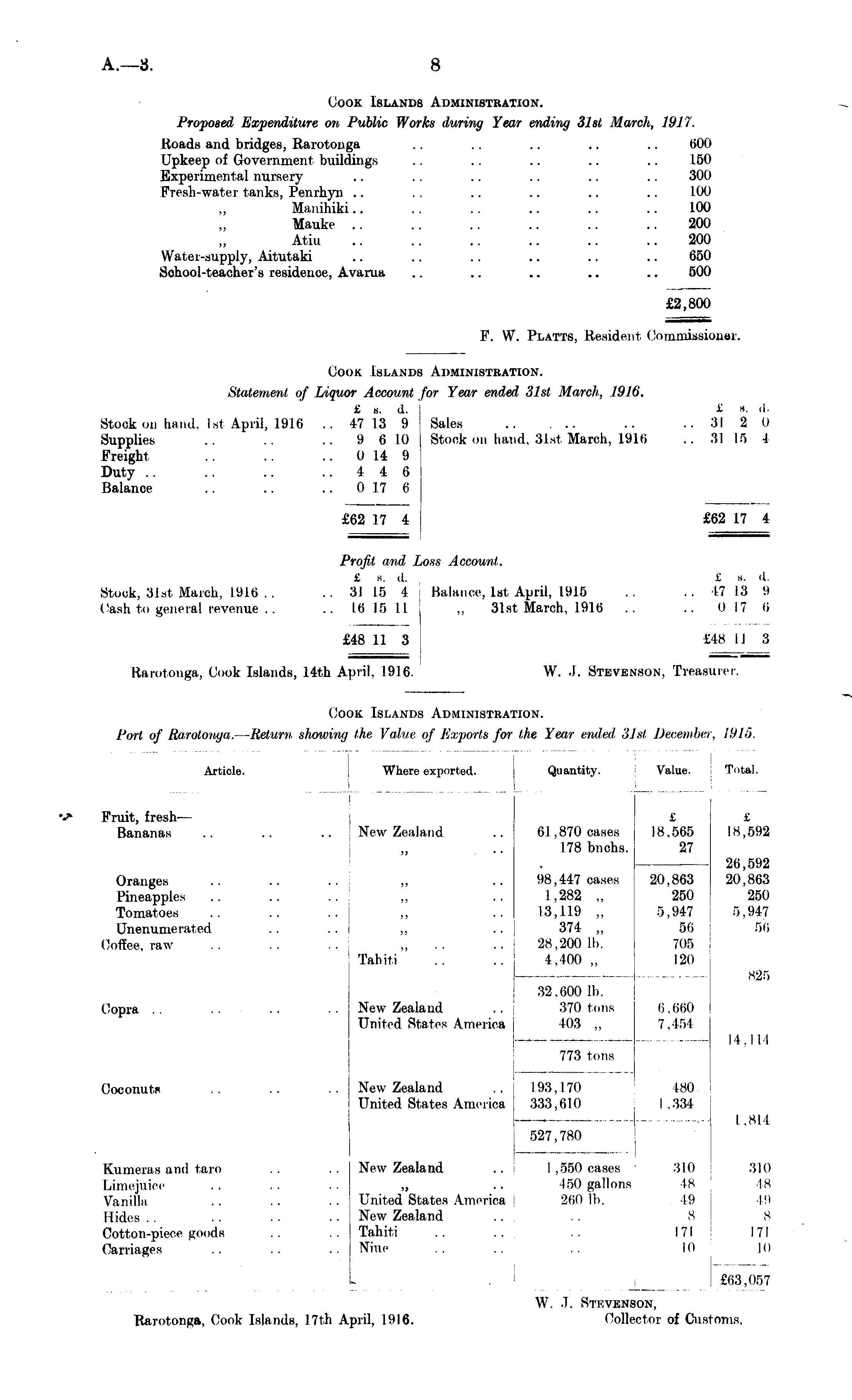Cook Islands Administration. Proposed Expenditure on Public Works during Year ending 31st March, 1917. Roads and bridges, Rarotonga .. .. .. .. .. 600 Upkeep of Government buildings .. .. .. .. .. L5O Experimental nursery .. . . .. .. .. .. 300 Fresh-water tanks, Penrhyn .. . . .. .. .. .. 100 Manihiki.. .. .. .. .. .. 100 Mauke .. .. .. .. .. .. 200 Atiu .. .. .. .. .. .. 200 Water-supply, Aitutaki .. .. .. .. .. .. 650 Sohool-teacher's residence, Avarua .. .. .. .. .. 500 £2,800 F. W. Platts, Resident Commissioner. Cook Islands Administration. Statement of Liquor Account for Year ended 3lsl March, 1916. £ s. d. | £ s. d. Stock on hand. Ist April, 1916 .. 47 13 9 I Sales .. .. 31 2 0 Supplies .. .. .. 9 610 j Stock on hand. 31s1 March, 1916 .. 31 15 4 Freight .. .. .. 014 9 Duty .. .. .. ..446 Balance .. .. .. 0 17 6 £62 17 4 £62 17 4 Profit and Loss Account. t s. d. £ s. d. Stock, 3Jst March, 1916 .. .. 3115 4 Balance, lsl April, 1915 .. .. 47 13 9 Cash to general revenue .. .. 16 15 II „ 31st March. 1916 .. .. 017 6 £48 11 3 £48 11 3 Rarotonga, Cook Islands, 14th April, 1916. W. .J. Stevenson, Treasurer.