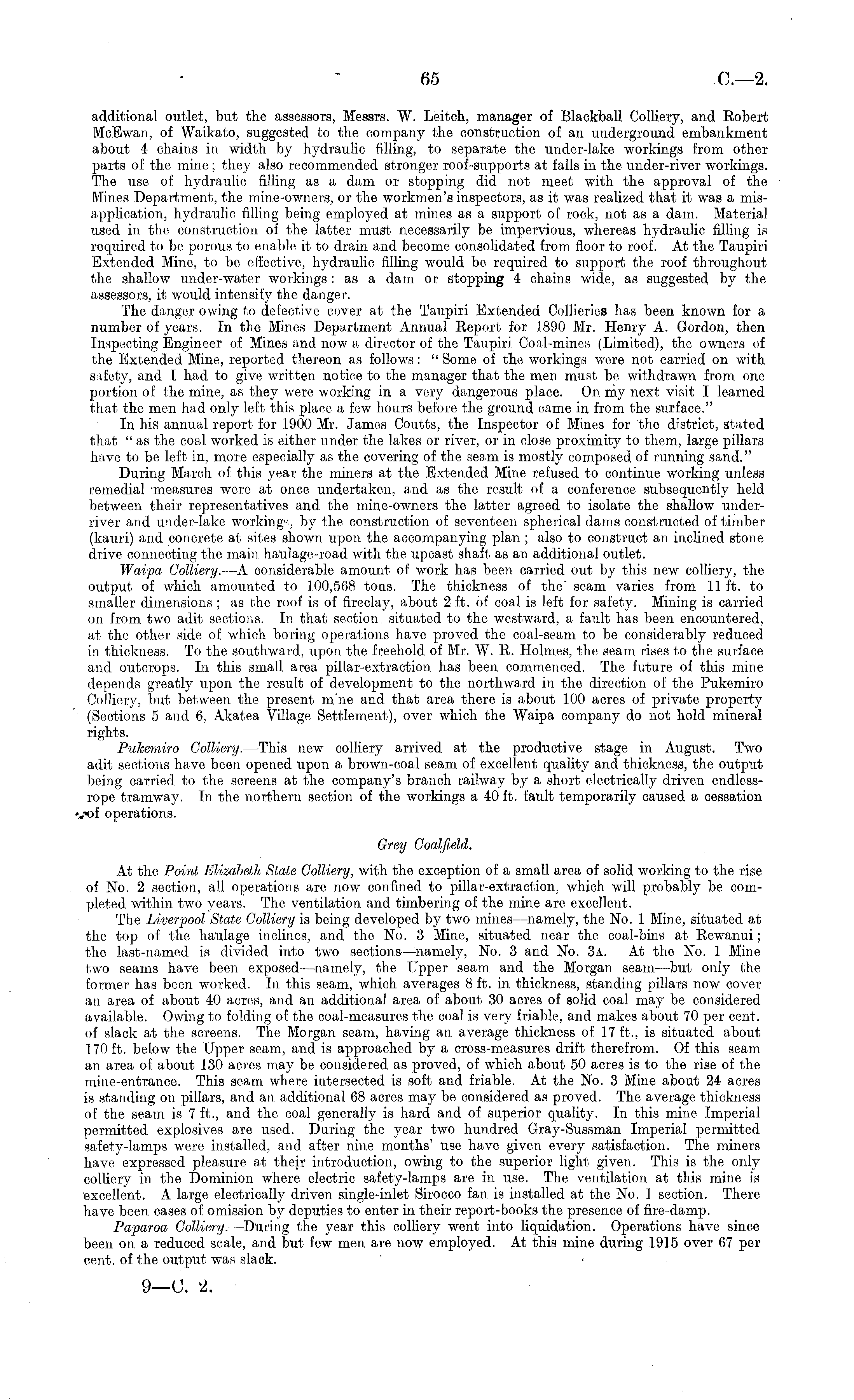 additional outlet, but the assessors, Messrs. W. Leitch, manager of Blackball Colliery, and Robert MeEwan, of Waikato, suggested to the company the construction of an underground embankment about 4 chains in width by hydraulic filling, to separate the under-lake workings from other parts of the mine; they also recommended stronger roof-supports at falls in the under-river workings. The use of hydraulic filling as a dam or stopping did not meet with the approval of the Mines Department, the mine-owners, or the workmen's inspectors, as it was realized that it was a misapplication, hydraulic filling being employed at mines as a support of rock, not as a dam. Material used in the construction of the latter must necessarily be impervious, whereas hydraulic filling is required to be porous to enable it to drain and become consolidated from floor to roof. At the Taupiri Extended Mine, to be effective, hydraulic filling would be required to support the roof throughout the shallow under-water workings : as a dam or stopping 4 chains wide, as suggested by the assessors, it would intensify the danger. The danger owing to defective cover at the Taupiri Extended Collieries has been known for a number of years. In the Mines Department Annual Report for 1890 Mr. Henry A. Gordon, then Inspecting Engineer of Mines and now a director of the Taupiri Coal-mines (Limited), the owners of the Extended Mine, reported thereon as follows: " Some of the workings were not carried on with safety, and I had to give written notice to the manager that the men must be withdrawn from one portion of the mine, as they were working in a very dangerous place. On my next visit I learned that the men had only left this place a few hours before the ground came in from the surface." In his annual report for 1900 Mr. James Coutts, the Inspector of Mines for the district, stated that " as the coal worked is either under the lakes or river, or in close proximity to them, large pillars have to be left in, more especially as the covering of the seam is mostly composed of running sand." During March of this year the miners at the Extended Mine refused to continue working unless remedial 'measures were at once undertaken, and as the result of a conference subsequently held between their representatives and the mine-owners the latter agreed to isolate the shallow underriver and under-lake workings, the construction of seventeen spherical dams constructed of timber (kauri) and concrete at sites shown upon the accompanying plan ; also to construct an inclined stone drive connecting the main haulage-road with the upcast shaft, as an additional outlet. Waipa Colliery. —A considerable amount of work has been carried out by this new colliery, the output of which amounted to 100,568 tons. The thickness of the" seam varies from 11 ft. to smaller dimensions ;as the roof is of fireclay, about 2 ft. of coal is left for safety. Mining is carried on from two adit sections. In that section situated to the westward, a fault has been encountered, at the other side of which boring operations have proved the coal-seam to be considerably reduced in thickness. To the southward, upon the freehold of Mr. W. R. Holmes, the seam rises to the surface, and outcrops. In this small area pillar-extraction has been commenced. The future of this mine depends greatly upon the result of development to the northward in the direction of the Pukemiro Colliery, but between the present m'ne and that area there is about 100 acres of private property (Sections 5 and 6, Akatea Village Settlement), over which the Waipa company do not hold mineral rights. Pukemiro Colliery. —This new colliery arrived at the productive stage in August. Two adit, sections have been opened upon a brown-coal seam of excellent quality and thickness, the output being carried to the screens at the company's branoh railway by a short electrically driven endlessrope tramway. In the northern section of the workings a4O ft. fault temporarily caused a cessation vof operations. Grey Coalfield. At the Point Elizabeth State Colliery, with the exception of a small area of solid working to the rise of No. 2 section, all operations are now confined to pillar-extraction, which will probably be completed within two years. Tho ventilation and timbering of the mine are excellent. The Liverpool State Colliery is being developed by two mines—namely, the No. 1 Mine, situated at the top of the haulage inclines, and the No. 3 Mine, situated near the coal-bins at Rewanui; the last-named is divided into two sections —namely, No. 3 and No. 3a. At the No. 1 Mine two seams have been exposed —namely, the Upper seam and the Morgan, seam—but only the former has been worked. In this seam, which averages 8 ft. in thickness, standing pillars now cover an area of about 40 acres, and an additional area of about 30 acres of solid coal may be considered available. Owing to folding of the coal-measures the coal is very friable, and makes about 70 per cent. of slack at the screens. The Morgan seam, having an average thickness of 17 ft., is situated about 170 ft. below the Upper seam, and is approached by a cross-measures drift therefrom. Of this seam an area of about f3O acres may be considered as proved, of which about 50 acres is to the rise of the mine-entrance. This seam where intersected is soft and friable. At the No. 3 Mine about 24 acres is standing on pillars, and an additional 68 acres may be considered as proved. The average thickness of the seam is 7 ft., and the coal generally is hard and of superior quality. In this mine Imperial permitted explosives are used. During the year two hundred Gray-Sussman Imperial permitted safety-lamps were installed, and after nine months' use have given every satisfaction. The miners have expressed pleasure at their introduction, owing to the superior light given. This is the only colliery in the Dominion where electric safety-lamps are in use. The ventilation at this mine is excel
