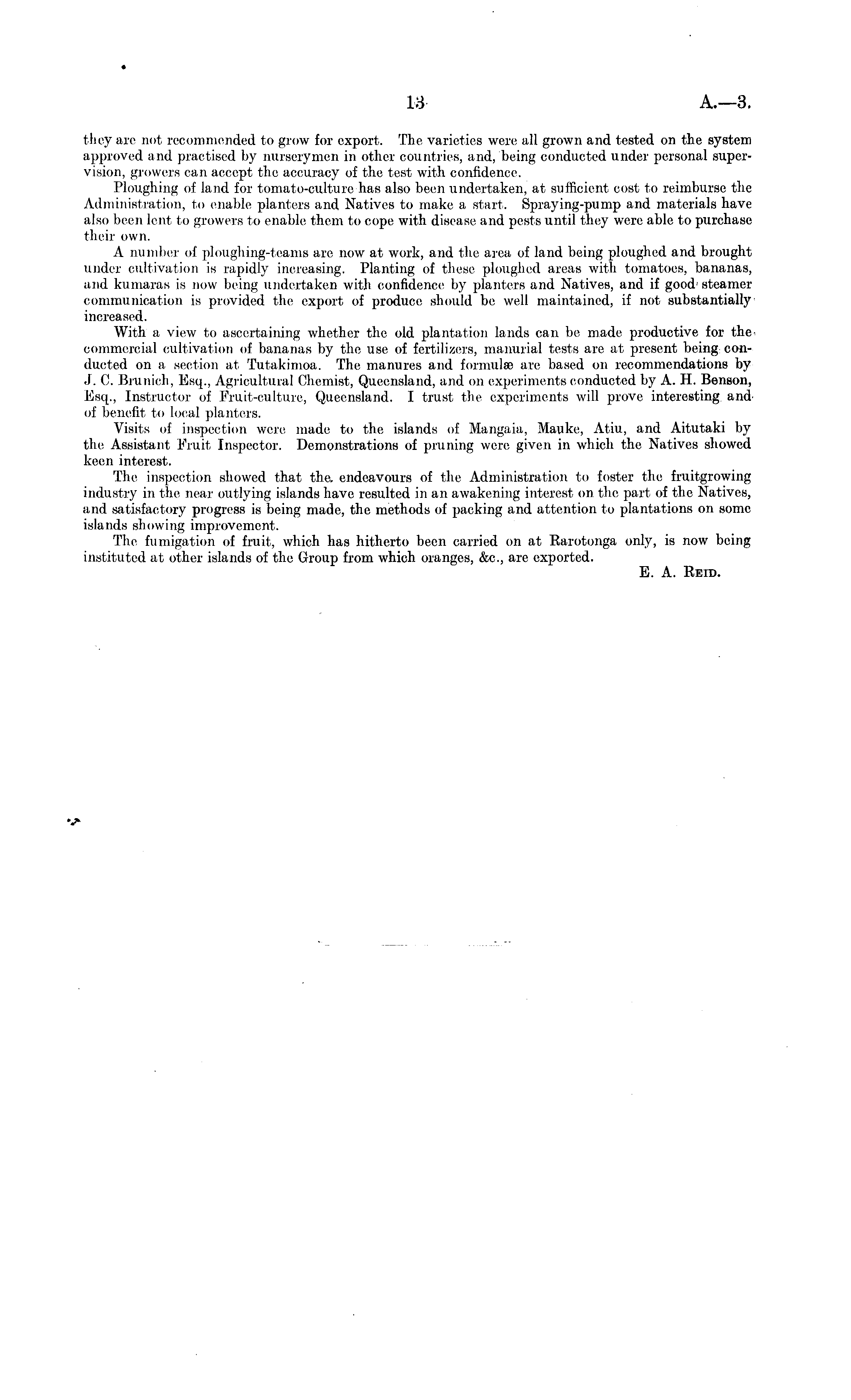 they are not recommended to grow for export. The varieties were all grown and tested on the system approved and practised by nurserymen in other countries, and, being conducted under personal supervision, growers can accept the accuracy of the test with confidence. Ploughing of land for tomato-culture has also been undertaken, at sufficient cost to reimburse the Administration, to enable planters and Natives to make a start. Spraying-pump and materials have also been lent to growers to enable them to cope with disease and pests until they were able to purchase their own. A number of ploughing-teams are now at work, and the area of land being ploughed and brought under cultivation is rapidly increasing. Planting of these ploughed areas with tomatoes, bananas, and kumaras is now being undertaken with confidence by planters and Natives, and if good steamer communication is provided the export of produce should be well maintained, if not substantially increased. With a view to ascertaining whether the, old plantation lands can be made productive for the commercial cultivation of bananas by the use of fertilizers, manurial tests are at present being conducted on a section at Tutakinioa. The manures and formulae are based on recommendations by .J. C. Brunich, Esq., Agricultural Chemist, Queensland, and on experiments conducted by A. H. Benson, Esq., Instructor of Fruit-culture, Queensland. I trust the experiments will prove interesting and of benefit to local planters. Visits of inspection were made to the islands of Mangaia, Mauke, Atiu, and Aitutaki by the Assistant Fruit Inspector. Demonstrations of pruning were given in which the Natives showed keen interest. The inspection showed that the. endeavours of the Administration to foster the fruitgrowing industry in the near outlying islands have resulted in an awakening interest on. the part of the Natives, and satisfactory progress is being made, the methods of packing and attention to plantations on some islands showing improvement. The fumigation of fruit, which has hitherto been carried on at Rarotonga only, is now being instituted at other islands of the Croup from which oranges, &c, are exported. E. A. Reid.