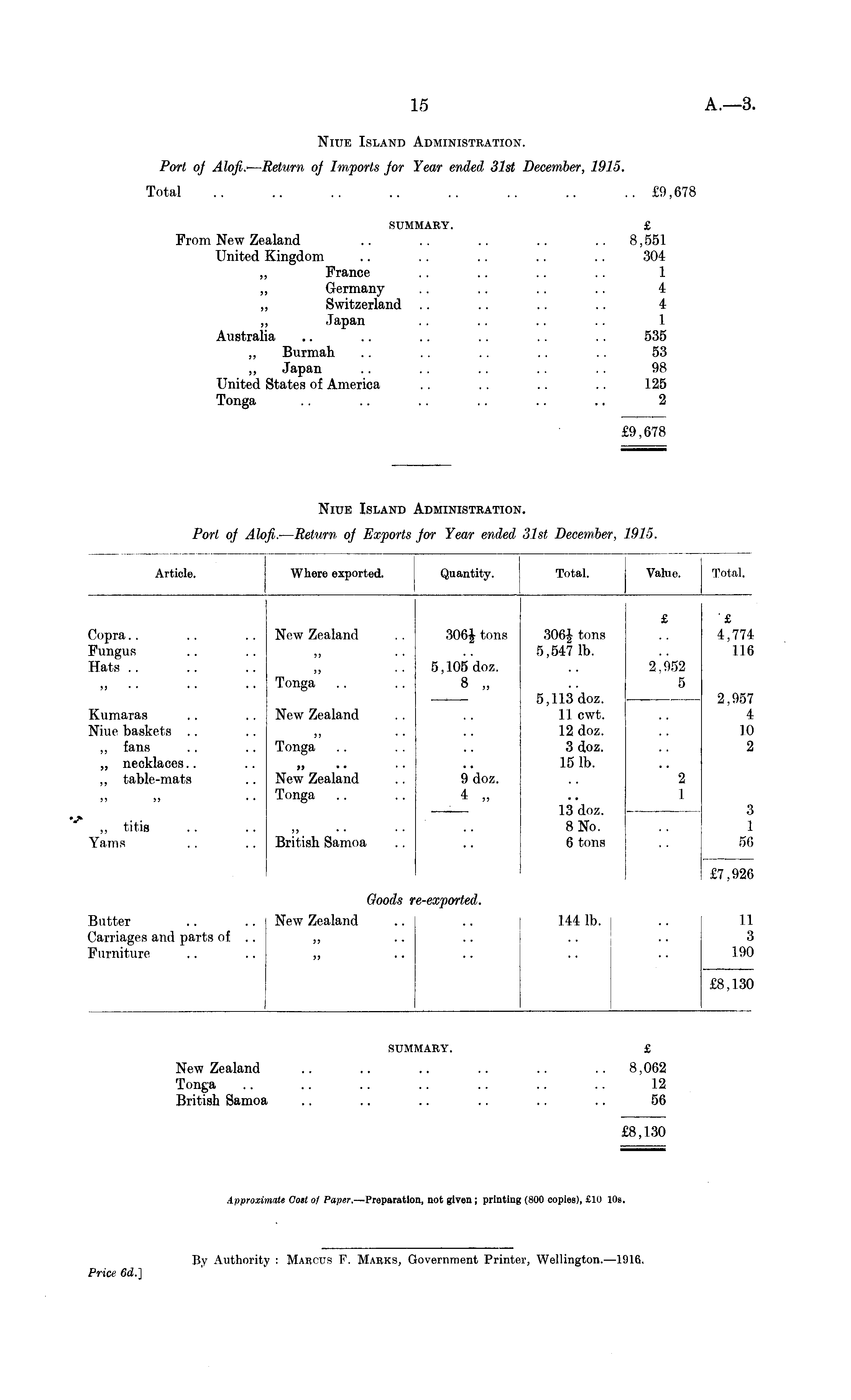 Niue Island Administration. Port of Alofi. — Return of Imports for Year ended 31st December, 1915. Total .. .. .. .. .. .. .. .. £9,678 SUMMARY. £ From New Zealand .. .. .. .. .. 8,551 United Kingdom .. .. .. .. .. 304 ~ France .. .. .. .. 1 ~ Germany .. .. . . .. 4 „ Switzerland .. .. .. .. 4 ~ Japan .. .. .. .. 1 Australia .. .. .. .. .. .. 535 ~ Burmah .. .. .. .. .. 53 ~ Japan .. .. .. .. .. 98 United States of America .. .. .. .. 125 Tonga .. .. .. .. .. .. 2 £9,678