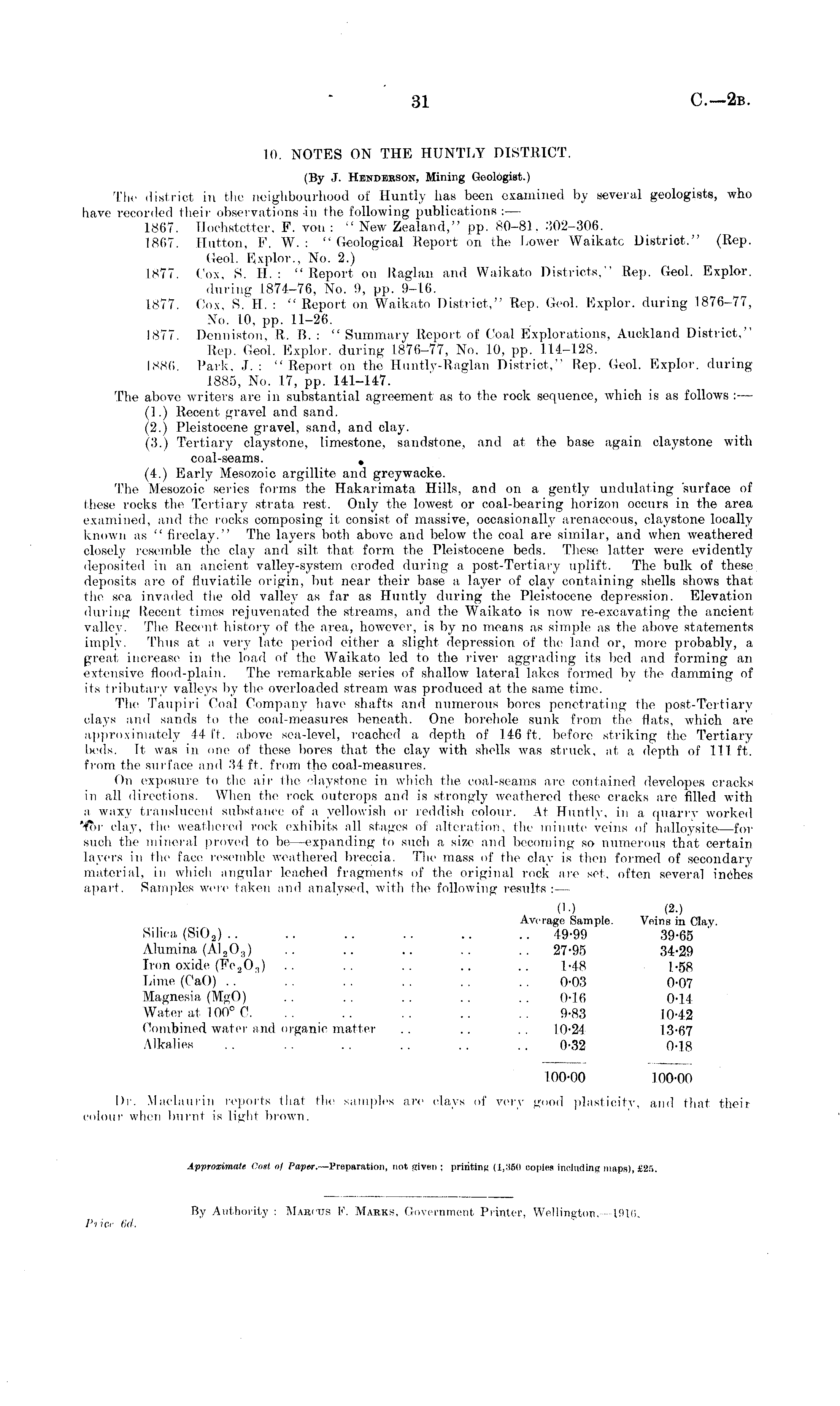 10. NOTES ON THE HUNTLY DISTRICT. (By J. Hbndbbson, Mining Goologiat.) The district in the neighbourhood of Huntly has been examined by several geologists, who have recorded their observations -in the following publications : — 1867. Hochstetter, F. yon : " New Zealand," pp. 80-81. 302-306. 1867. Hutton, F. W. : " Geological Report on the Lower Waikatc District." (Rep. Geol. Explor., No. 2.) 1877. Cox, S. H. : "Report on Raglan and Waikato Districts," Rep. Geol. Explor. during 1874-76, No. 9, pp. 9-16. 1877. Cox, S. H. : "Report on Waikato District," Rep. Geol. Explor. during 1876-77, No. 10, pp. 11-26. 1877. Denniston, R. B. : " Summary Report of Coal Explorations, Auckland District," Rep. Geol. Explor. during 1876-77, No. 1.0, pp. 114-128. 1886. Bark, J. : "Report on the Huntly-Raglan District," Rep. Geol. Explor. during 1885, No. 17, pp. 141-147. The above writers are in substantial agreement as to the rock sequence, which is as follows : — (1.) Recent gravel and sand. (2.) Pleistocene gravel, sand, and clay. (3.) Tertiary claystone, limestone, sandstone, and at the base again claystone with coal-seams. . (4.) Early Mesozoic argillite and greywacke. The Mesozoic series forms the Hakarimata Hills, and on a gently undulating surface of these rocks the Tertiary strata rest. Only the lowest or coal-bearing horizon occurs in the area examined, and the rocks composing it consist of massive, occasionally arenaceous, claystone locally known as " fireclay." The layers both above and below the coal are similar, and when weathered closely resemble the clay and silt that form the Pleistocene beds. These latter were evidently deposited in an ancient valley-system eroded during a post-Tertiary uplift. The bulk of these deposits are of fluviatile origin, but near their base a layer of clay containing shells shows that the sea invaded the old valley as far as Huntly during the Pleistocene depression. Elevation during Recent times rejuvenated the streams, and the Waikato is now re-excavating the ancient valley. The Recent history of the area, however, is by no means as simple as the above statements imply. Thus at a very late period either a slight depression of the land or, more probably, a great increase in the load of the Waikato led to the river aggrading its bed and forming an extensive flood-plain. The remarkable series of shallow lateral lakes formed by the damming of its tributary valleys by the overloaded stream was produced at the same time. The Taupiri Coal Company have shafts and numerous bores penetrating the post-Tertiary clays and sands to the coal-measures beneath. One borehole sunk from the flats, which are approximately 44 ft. above sea-level, reached a depth of 146 ft. before striking the Tertiary beds. It was in one of these bores that the clay with shells was struck, at a depth of 111. ft. from the surface and 34 ft. from the coal-measures. On exposure to the air the claystone in which the coal-seams are contained developes cracks in all directions. When the rock outcrops and is strongly weathered these cracks are filled with a waxy translucent substance of a yellowish or reddish colour. At, Huntly, in a quarry worked "for clay, the weathered rock exhibits all stages of alteration, the minute veins of halloysite—for such the mineral proved to be —expanding to such a size and becoming so numerous that certain layers in the face resemble weathered breccia. The mass of the clay is then formed of secondary material, in which angular leached fragments of the original rock, are set, often several inches apart. Samples were taken and analysed, with the following results :— (1.) (2.) Average Sample. Veins in Clay. Silica (Sio 2 ) .. .. .. .. .. .. 49-99 39-65 Alumina (A 1 2 0 3) .. .. .. .. .. 27-95 34-2,9 Iron oxide (Fe 2 o,) .. .. .. .. .. 1-48 1-58 Lime (CaO) . . . . .. . . .. . . 0-03 0-07 Magnesia (MgO) . . . . . . .. . . 0-16 0-14 Water at 100° C. .. .. .. .. .. 9-83 10-42 Combined water and organic matter .. .. .. 10-24 13-67 Alkalies .. . . .. . . . . .. 0-32 o*lB 100-00 100-00 Dr. Maclaurin reports that the samples are clays of very good plasticity, and that their colour when burnt is light brown.