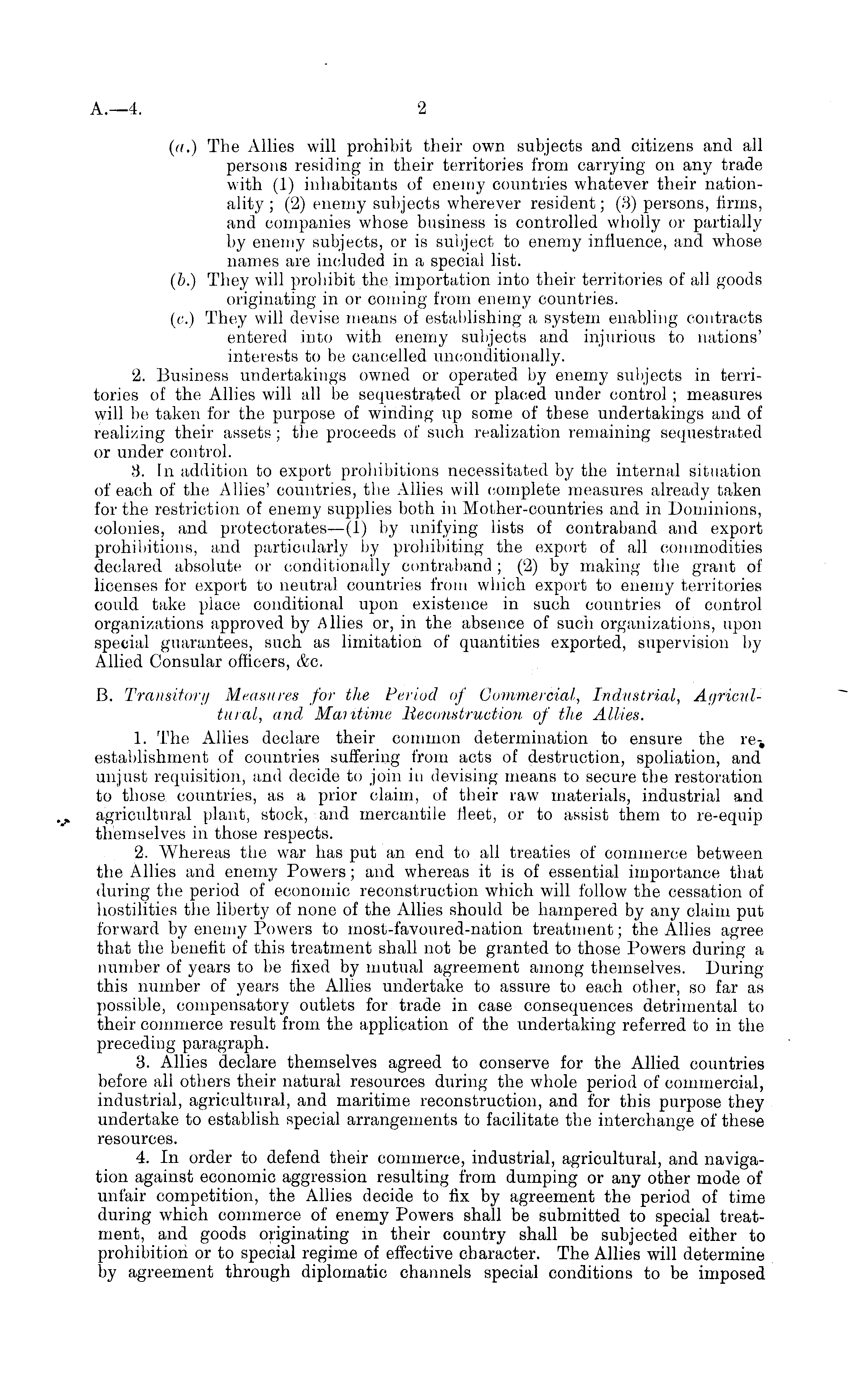 (a.) The Allies will prohibit their own subjects and citizens and all persons residing in their territories from carrying on any trade with (1) inhabitants of enemy countries whatever their nationality ; (2) enemy subjects wherever resident; (8) persons, firms, and companies whose business is controlled wholly or partially by enemy subjects, or is subject to enemy influence, and whose names are included in a special list. (&.) They will prohibit the importation into their territories of all goods originating in or coming from enemy countries. (c.) They will devise means of establishing a system enabling contracts entered into with enemy subjects and injurious to nations' interests to be cancelled unconditionally, 2. Business undertakings owned or operated by enemy subjects in territories of the Allies will all be sequestrated or placed under control; measures will be taken for the purpose of winding up some of these undertakings and of realizing their assets ; the proceeds of such realization remaining sequestrated or under control. 8. In addition to export prohibitions necessitated by the internal situation of each of the Allies' countries, the Allies will complete measures already taken for the restriction of enemy supplies both in Mother-countries and in Dominions, colonies, and protectorates—(l) by unifying lists of contraband and export prohibitions, and particularly by prohibiting the export of all commodities declared absolute or conditionally contraband ; (2) by making the grant of licenses for export to neutral countries from which export to enemy territories could take place conditional upon existence in such countries of control organizations approved by Allies or, in the absence of such organizations, upon special guarantees, such as limitation of quantities exported, supervision by Allied Consular officers, &c. B. Transitory Measures for the Period of Commercial, Industrial, Agricultural, and, Maiitime liecomtruction of the Allies. 1. The Allies declare their common determination to ensure the re-. establishment of countries suffering from acts of destruction, spoliation, and unjust requisition, and decide to join in devising means to secure the restoration to those countries, as a prior claim, of their raw materials, industrial and agricultural plant, stock, and mercantile fleet, or to assist them to re-equip themselves in those respects. 2. Whereas the war has put an end to all treaties of commerce between the Allies and enemy Powers; and whereas it is of essential importance that during the period of economic reconstruction which will follow the cessation of hostilities the liberty of none of the Allies should be hampered by any claim put forward by enemy Powers to most-favoured-nation treatment; the Allies agree that the benefit of this treatment shall not be granted to those Powers during a number of years to be fixed by mutual agreement among themselves. During this number of years the Allies undertake to assure to each other, so far as possible, compensatory outlets for trade in case consequences detrimental to their commerce result from the application of the undertaking referred to in the preceding paragraph. 3. Allies declare themselves agreed to conserve for the Allied countries before all others their natural resources during the whole period of commercial, industrial, agricultural, and maritime reconstruction, and for this purpose they undertake to establish special arrangements to facilitate the interchange of these resources. 4. In order to defend their commerce, industrial, agricultural, and navigation against economic aggression resulting from dumping or any other mode of unfair competition, the Allies decide to fix by agreement the period of time during which commerce of enemy Powers shall be submitted to special treatment, and goods originating in their country shall be subjected either to prohibition or to special regime of effective character. The Allies will determine by agreement through diplomatic channels special conditions to be imposed