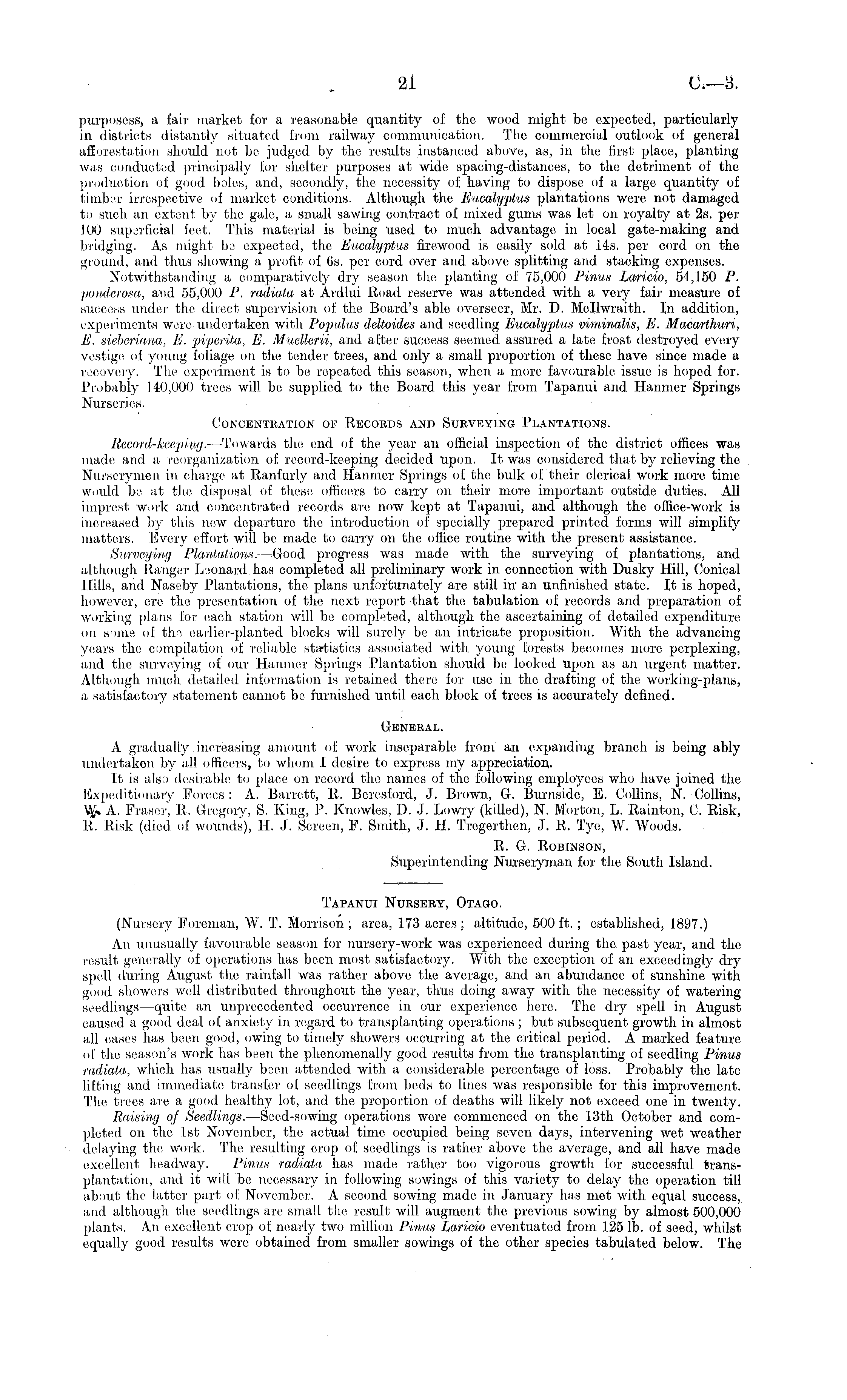 purposess, a fair market for a reasonable quantity of the wood might be expected, particularly in districts distantly situated from railway communication. The commercial outlook of general afforestation should not be judged by the results instanced above, as, in the first place, planting was conducted principally for shelter purposes at wide spacing-distances, to the detriment of the production of good boles, and, secondly, the necessity of having to dispose of a large quantity of timber irrespective of market conditions. Although the Eucalyptus plantations were not damaged to such an extent by the gale, a small sawing contract of mixed gums was let on royalty at 2s. per 100 superficial feet. This material is being used to much advantage in local gate-making and bridging. As might be expected, the Eucalyptus firewood is easily sold at 14s. per cord on the ground, and thus showing a profit of 6s. per cord over and above splitting and stacking expenses. Notwithstanding a comparatively dry season the planting of 75,000 Pinus Laricio, 54,150 P. ponderosa, and 55,000 P. radiata at Ardlui Road reserve was attended with a very fair measure of success under the direct supervision of the Board's able overseer, Mr. D. Mcllwraith. In addition, experiments were undertaken with Populus deltoides and seedling Eucalyptus viminalis, E. Macarthuri, E. sieberiana, E. piperita, E. Muellerii, and after success seemed assured a late frost destroyed every vestige of young foliage on the tender trees, and only a small proportion of these have since made a recovery. The experiment is to be repeated this season, when a more favourable issue is hoped for. Probably 140,000 trees will be supplied to the Board this year from Tapanui and Hanmer Springs Nurseries. Concentration of Records and Surveying Plantations. Record-keep ing. —Towards the end of the year an official inspection of the district offices was made and a reorganization of record-keeping decided Upon. It was considered that by relieving the Nurserymen in charge at Ranfurly and Hanmer Springs of the bulk of their clerical work more time would be at the disposal of these officers to carry on their more important outside duties. All imprest work and concentrated records are now kept at Tapanui, and although the office-work is increased by this new departure the introduction of specially prepared printed forms will simplify matters. Every effort will be made to carry on the office routine with the present assistance. Surveying Plantations. —Good progress was made with the surveying of plantations, and although Ranger Leonard has completed all preliminary work in connection with Dusky Hill, Conical Hills, and Naseby Plantations, the plans unfortunately are still in an unfinished state. It is hoped, however, ere the presentation of the next report that the tabulation of records and preparation of working plans for each station will be completed, although the ascertaining of detailed expenditure on some of the earlier-planted blocks will surely be an intricate proposition. With the advancing years the compilation of reliable statistics associated with young forests becomes more perplexing, and tho surveying of our Hanmer Springs Plantation should bo looked upon as an urgent matter. Although much detailed information is retained there for use in the drafting of the, working-plans, a satisfactory statement cannot be furnished until each block of trees is accurately defined. General. A gradually increasing amount of work inseparable from an expanding branch is being ably undertaken by all officers, to whom I desire to express my appreciation. It is also desirable to place on record tho names of the following employees who have joined the Expeditionary Forces: A. Barrett, 11. Bcresford, J. Brown, G. Burnside, E. Collins, N. Collins, W> A. Fraser, R. Gregory, S. King, P. Knowles, D. J. Lowry (killed), N. Morton, L. Rainton, C. Risk, R. Risk (died of wounds), H. J. Screen, F. Smith, J. H. Trcgerthen, J. R. Tye, W. Woods. R. G. Robinson, Superintending Nurseryman for the South Island. Tapanui Nursery, Otago. (Nursery Foreman, W. T. Morrison ; area, 173 acres ; altitude, 500 ft.; established, 1897.) An unusually favourable season for nursery-work was experienced during the past year, and the: result generally of operations has been most satisfactory. With the exception of an exceedingly dry spell during August the rainfall was rather above the average, and an abundance of sunshine with good showers well distributed throughout the year, thus doing away with the necessity of watering seedlings —quite an unprecedented occurrence in our experience here. The dry spell in August caused a good deal of anxiety in regard to transplanting operations ; but subsequent growth, in almost all cases has been good, owing to timely showers occurring at the critical period. A marked feature of the season's work has been the phenomenally good results from the transplanting of seedling Pinus radiata, which has usually been attended with a considerable percentage of loss. Probably the late lifting and immediate transfer of seedlings from beds to lines was responsible for this improvement. The trees are a good healthy lot, and the proportion of deaths will likely not exceed one in twenty. Raising of Seedlings. —Seed-sowing operations were commenced on the 13th October and completed on the Ist November, the actual time occupied being seven days, intervening wet weather delaying the work. The resulting crop of seedlings is rather above the average, and all have made excellent headway. Pinus radiata has made rather too vigorous growth for successful transplantation, and it will be necessary in following sowings of this variety to delay the operation till about the latter part of November. A second sowing made in January has met with equal success,, and although the seedlings are small the result will augment the previous sowing by almost 500,000 plants. An excellent crop of nearly two