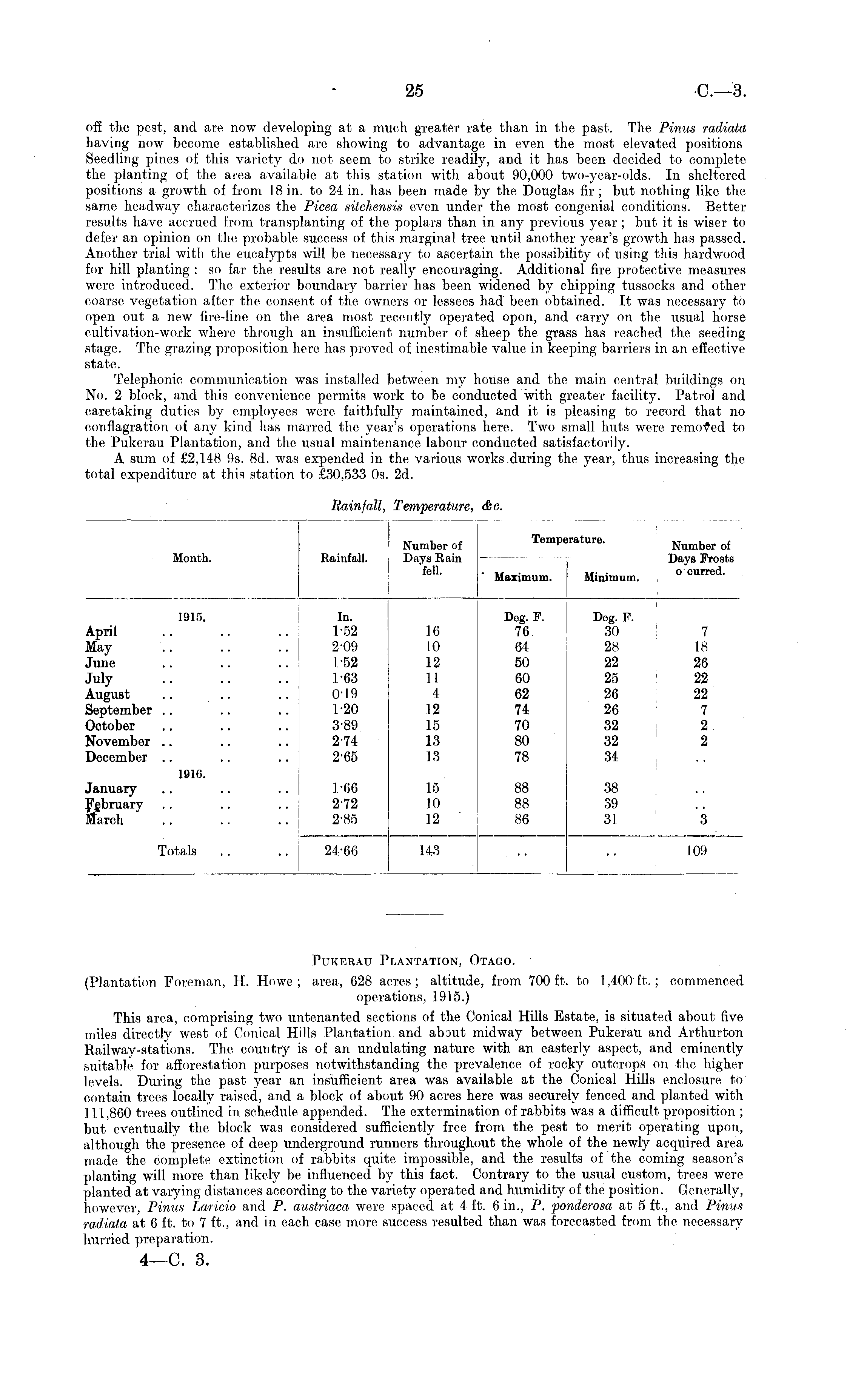 Pukerau Plantation, Otago. (Plantation Foreman, H. Howe ; area, 628 acres ; altitude, from 700 ft. to 1,400 ft. ; commenced operations, 1915.) This area, comprising two untenanted sections of the Conical Hills Estate, is situated about five miles directly west of Conical Hills Plantation, and about midway between Pukerau and Arthurton Railway-stations. The country is of an undulating nature, with an easterly aspect, and eminently suitable for afforestation purposes notwithstanding the prevalence of rocky outcrops on the higher levels. During the past year an insufficient area was available at the Conical Hills enclosure to contain trees locally raised, and a block of about 90 acres here was securely fenced and planted with 111,860 trees outlined in. schedule appended. The extermination of rabbits was a difficult proposition.; but eventually the block was considered sufficiently free from the pest to merit operating upon, although the presence of deep underground runners throughout the whole of the newly acquired area made the complete extinction of rabbits quite impossible, and the results of the coming season's planting will more than likely be influenced by this fact. Contrary to the usual custom, trees were planted at varying distances according to the variety operated and humidity of the position. Generally, however, Pinus Laricio and P. austriaca were spaced at 4 ft. 6 in., P. ponderosa at 5 ft., and Pinus radiata at 6 ft. to 7 ft., and in each case more success resulted than was forecasted from the necessary hurried preparation.