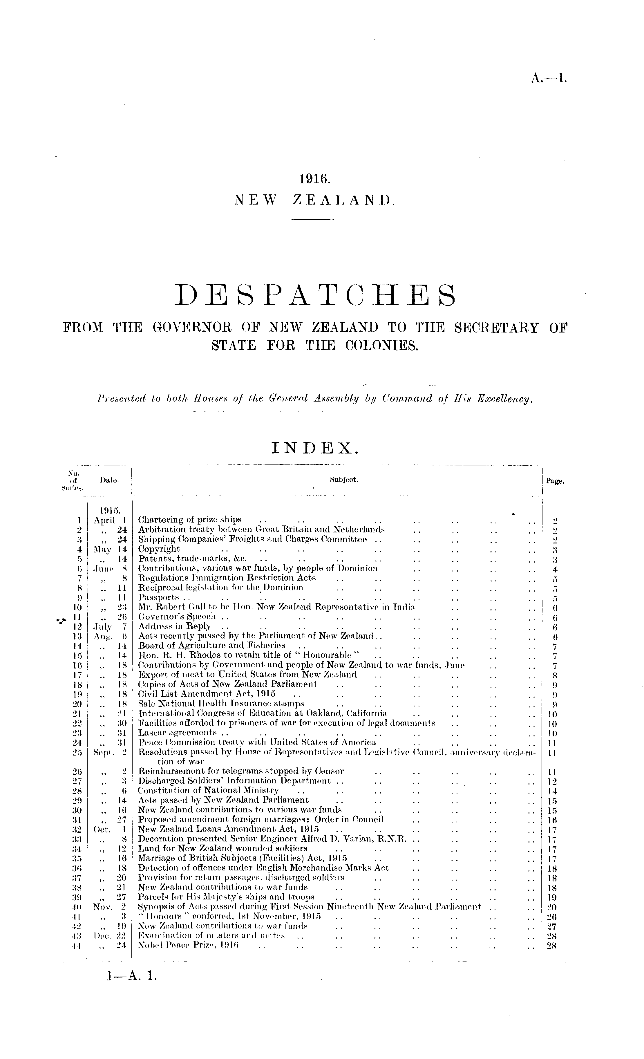 J.tJ -i-\J. NEW ZEALAND. DESPATCHES FROM THE GOVERNOR OF NEW ZEALAND TO THE SECRETARY OF STATE FOR THE COLONIES. Presented to both Houses of the General Assembly by Command of His Excellency. INDEX. No. (if Date. Subject. Page. Setios., ■ ) 1915. 1 April 1 Chartering o£ prize ships .. . . .. . . . . .. . . ■> 2 ,, 24 Arbitration treaty between Great Britain and Netherlands . . . . .. .. 2 3 ,, 24 Shipping Companies' Freights and Charges Committee . . .. .. . . .. 2 4 May 14 Copyright .. .. .. .. . . .. . . .. .. 3 5 ,, 14 Patents, trade-marks, &c. .. .. .. .. .. .. .. . . 3 6 June 8 Contributions, various war funds, by people of Dominion .. . . . . .. 4 7 ,. S Regulations Immigration Restriction Acts .. .. . . . . . . .. 5 8 ,, 11 Reciprocal legislation for the_ Dominion .. .. .. .. .. -, 9 ,, 11 Passports.. .. .. .. .. .. .. .. .. ..6 10 ,, 23 Mr. Robert Gall to be Hon. Now Zealand Representative in India . . . . . . 6 ,, 11 ,, 2(i Governor's Speech .. .. .. .. .. .. .. .. .. (i 12 July 7 Address in Reply . . . . . . .. . . . . . . .. . . 6 13 Aug. 6 Acts recently passed by the Parliament of New Zealand. . .. .. .. . . li 14 ,, 14 Board of Agriculture and Fisheries . . . . . . . . . . . . . . 7 15 ,. 14 Hon. R. H. Rhodes to retain title of " Honourable" .. .. .. .. .. 1 16 ,, 18 Contributions by Government and people of New Zealand to war funds, June .. .. 7 17 i ,, 18 Export of meat to United States from New Zealand .. .. .. .. .. S 18 i ,, 18 Copies of Aots of New Zealand Parliament .. .. .. .. .. ..9 19 j ,, 18 Civil List Amendment Act, 1915 .. .. .. .. .. .. .. !) 20 I ,, 18 Sale National Health Insurance stamps .. .. .. ., .. .. (I 21 21 International Congress of Education at Oakland, California .. .. .. ..10 22 ,, 30 Facilities afforded to prisoners of war for execution of legal documents .. .. ..10 23 ,, 31 Lascar agreements .. .. .. .. .. .. .. .. ..10 24 ,, 31 Peace Commission treaty with United States of America .. .. .. ..11 25 Sept. 2 Resolutions passed by House of Representatives and Legislative Council, anniversary deolara- 11 tion of war 26 ,, 2 Reimbursement for telegrams stopped by Censor .. .. .. .. ..II 27 ,, 3 Discharged Soldiers'Information Department .. .. .. .. .. ..12 28 ,. 6 Constitution of National Ministry .. .. .. .. .. .. ..14 2(1 ,. 14 Acts passed by New Zealand Parliament .. .. .. .. .. ..15 30 .. 16 New Zealand contributions to various war funds .. .. .. .. ..15 31 ,, 27 Proposed amendment foreign marriages i Order in CounoU .. .. .. .. 16 32 Oct. 1 New Zealand Loans Amendment Act, 1915 .. .. .. .. .. ..17 33 ,, 8 Decoration presented Senior Engineer Alfred 1). Varian, R.N.R. .. .. .. ..17 34 „ 12 Land for New Zealand wounded soldiers .. .. .. .. .. ..17 35 ,, 16 Marriage of British Subjects (Facilities) Act, 1915 .. .. .. .. ..17 36 ,, 18 Detection of offences under English Merchandise Marks Act, .. .. .. ..18 37 ,, 20 Provision for return passages, discharged soldiers .. .. .. .. ..18 38 ,, 21 Now Zealand contributions to war funds .. .. .. .. .. ..18 39 j ,, 27 Parcels for His Majesty's ships and troops .. .. .. .. .. ..19 40 ' Nov. 2 Synopsis of Aots passed during First Session Nineteenth New Zealand Parliament .. ..20 41 I ,, 3 " Honours" conferred, 1st November, 1915 .. .. .. .. .. ..26 -12 ; ,, 19 New Zealand contributions to war funds .. .. .. .. .. ..27 43 Dee. 22 Examination of masters and mates .. .. .. .. .. .. ..28 44 ., 24 Nobel Peace Prizo, 1916 .. .. .. .. .. .. .. ..28 1-A. 1.