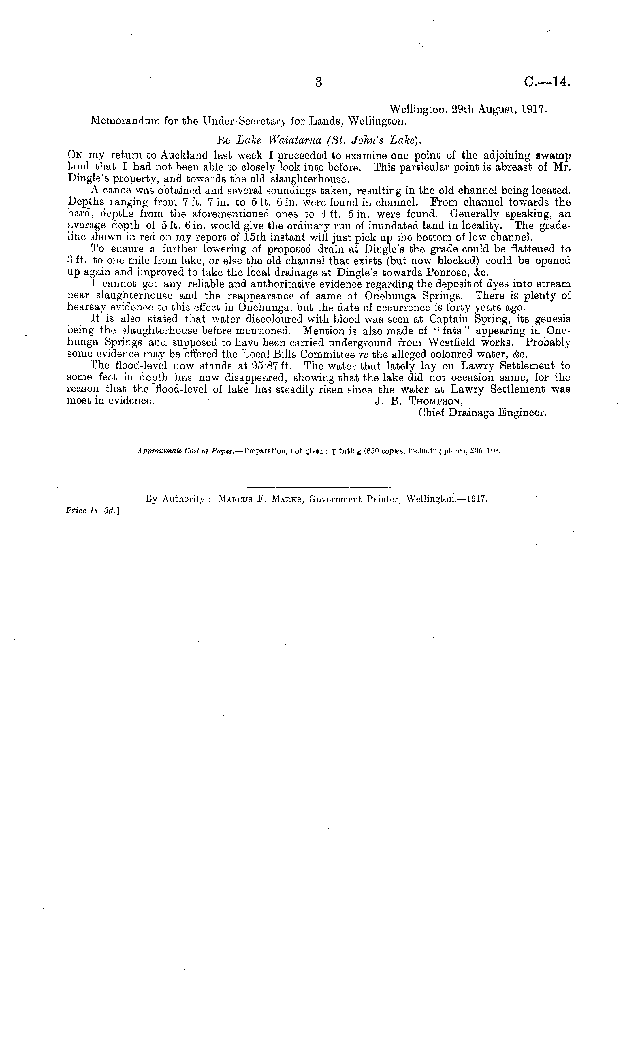 Wellington, 29th August, 1917. Memorandum for the Under-Secretary for Lands, Wellington. Re Lake Waiatarua (St. John's Lake). On my return to Auckland last week I proceeded to examine one point of the adjoining swamp land that I had not been able to closely look into before. This particular point is abreast of Mr. Dingle's property, and towards the old slaughterhouse. A canoe was obtained and several soundings taken, resulting in the old channel being located. Depths ranging from 7 ft. 7 in. to 5 ft. 6 in. were found in channel. From channel towards the hard, depths from the aforementioned ones to 4 ft. 5 in. were found. Generally speaking, an average depth of 5 ft. 6 in. would give the ordinary run of inundated land in locality. The gradeline shown in red on my report of 15th instant will just pick up the bottom of low channel. To ensure a further lowering of proposed drain at Dingle's the grade could be flattened to 3 ft. to one mile from lake, or else the old channel that exists (but now blocked) could be opened up again and improved to take the local drainage at Dingle's towards Penrose, &c. I cannot get any reliable and authoritative evidence regarding the deposit of dyes into stream near slaughterhouse and the reappearance of same at Onehunga Springs. There is plenty of hearsay evidence to this effect in Onehunga, but the date of occurrence is forty years ago. It is also stated that water discoloured with blood was seen at Captain Spring, its genesis being the slaughterhouse before mentioned. Mention is also made of "fats" appearing in Onehunga Springs and supposed to have been carried underground, from Westfield works. Probably some evidence may be offered the Local Bills Committee re the alleged coloured water, &c. The flood-level now stands at 95-87 ft. The water that lately lay on Lawry Settlement to some feet in depth has now disappeared, showing that the lake did not occasion same, for the reason that the flood-level of lake has steadily risen since the water at Lawry Settlement was most in evidence. • J. B. Thompson, Chief Drainage Engineer.