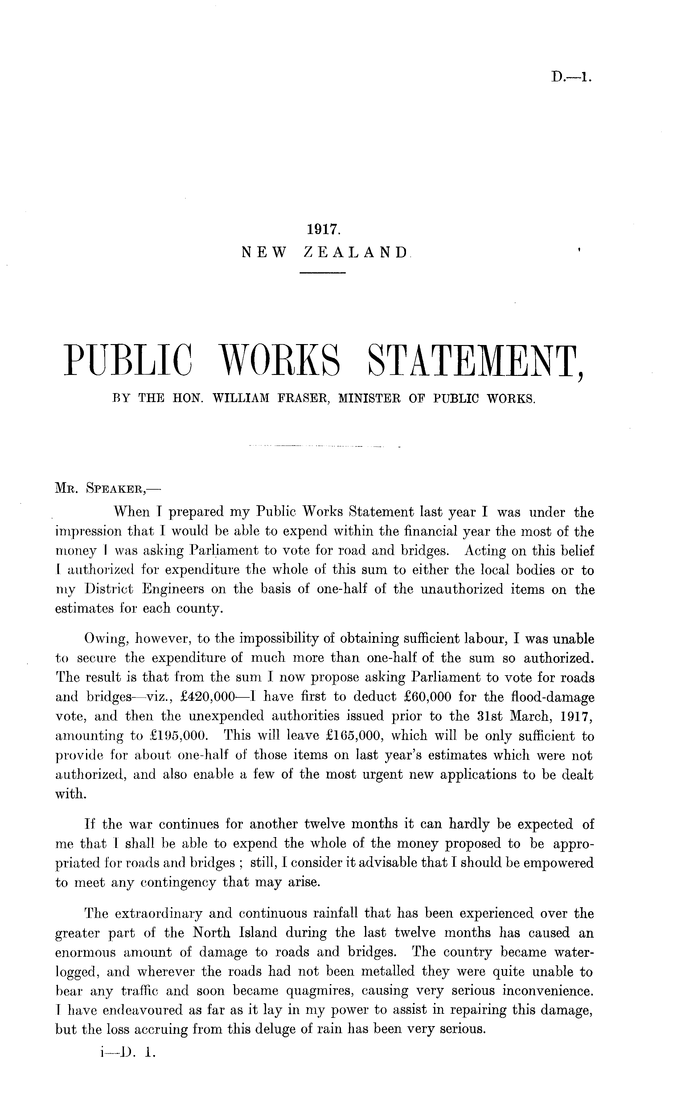 Mr. Speaker,— When I prepared my Public Works Statement last year I was under the impression that I would be able to expend within the financial year the most of the money I was asking Parliament to vote for road and bridges. Acting on this belief I authorized for expenditure the whole of this sum to either the local bodies or to my District Engineers on the basis of one-half of the unauthorized items on the estimates for each county. Owing, however, to the impossibility of obtaining sufficient labour, I was unable to secure the expenditure of much more than one-half of the sum so authorized. The result is that from the sum I now propose asking Parliament to vote for roads and bridges—viz., £420,000 —I have first to deduct £60,000 for the flood-damage vote, and then the unexpended authorities issued prior to the 31st March, 1917, amounting to £195,000. This will leave £165,000, which will be only sufficient to provide for about one-half of those items on last year's estimates which were not authorized, and also enable a few of the most urgent new applications to be dealt with. If the war continues for another twelve months it can hardly be expected of me that I shall be able to expend the whole of the money proposed to be appropriated for roads and bridges ; still, I consider it advisable that I should be empowered to meet any contingency that may arise. The extraordinary and continuous rainfall that has been experienced over the greater part of the North Island during the last twelve months has caused an enormous amount of damage to roads and bridges. The country became waterlogged, and wherever the roads had not been metalled they were quite unable to bear any traffic and soon became quagmires, causing very serious inconvenience. I have endeavoured as far as it lay in my power to assist in repairing this damage, but the loss accruing from this deluge of rain has been very serious.