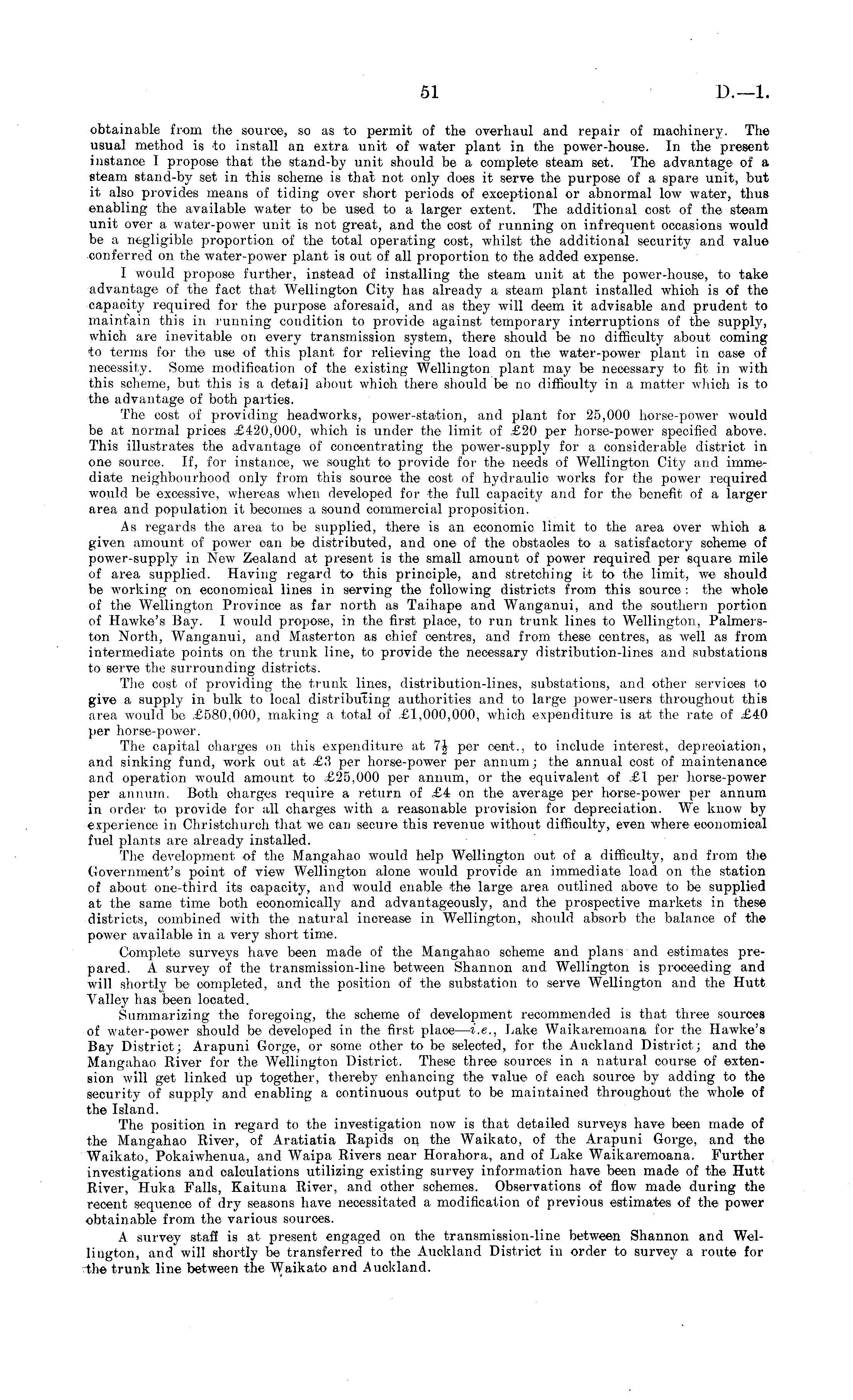 obtainable from the source, so as to permit of the overhaul and repair of machinery. The usual method is to install an extra unit of water plant in the power-house. In the present instance I propose that the stand-by unit should be a complete steam set. The advantage of a steam stand-by set in this scheme is that not only does it serve the purpose of a spare unit, but it also provides means of tiding over short periods of exceptional or abnormal low water, thus enabling the available water to be used to a larger extent. The additional cost of the steam unit over a water-power unit is not great, and the cost of running on infrequent occasions would be a negligible proportion of the total operating cost, whilst the additional security and value conferred on the water-power plant is out of all proportion to the added expense. I would propose further, instead of installing the steam unit at the power-house, to take advantage of the fact that Wellington City has already a steam plant installed which is of the capacity required for the purpose aforesaid, and as they will deem it advisable and prudent to maintain this in running condition to provide against temporary interruptions of the supply, which are inevitable on every transmission system, there should be no difficulty about coming to terms for the use of this plant for relieving the load on the water-power plant in case of necessity. Some modification of the existing Wellington plant may be necessary to fit in with this scheme, but this is a detail about which there should be no difficulty in a matter winch is to the advantage of both parties. The cost of providing headworks, power-station, and plant for 25,000 horse-power would be at normal prices £420,000, which is under the limit of £20. per horse-power specified above. This illustrates the advantage of concentrating the power-supply for a considerable district in one source. If, for instance, we sought to provide for the needs of Wellington City and immediate neighbourhood only from this source the cost of hydraulic works for the power required would be excessive, whereas when developed for the full capacity and for the benefit of a larger area and population it becomes a sound commercial proposition. As regards the area to be supplied, there is an economic limit to the area over which a given amount of power can be distributed, and one of the obstacles to a satisfactory scheme of power-supply in New Zealand at present is the small amount of power required per square mile of area supplied. Having regard to this principle, and stretching it to the limit, we should be working on economical lines in serving the following districts from this source : the whole of the Wellington Province as far north as Taihape and Wanganui, and the southern portion of Hawke's Bay. 1 would propose, in the first place, to run trunk lines to Wellington, Palmerston North, Wanganui, and Masterton as chief centres, and from these centres, as well as from intermediate points on the trunk line, to provide the necessary distribution-lines and substations to serve the surrounding districts. The cost of providing the trunk lines, distribution-lines, substations, and other services to give a supply in bulk to local distributing authorities and to large power-users throughout this area would be £580,000, making a total of £1,000,000, which expenditure is at the rate of £40 per horse-power. The capital charges on this expenditure at 7| per cent., to include interest, depreciation, and sinking fund, work out at £3 per horse-power per annum; the annual cost of maintenance and operation would amount to £25,000 per annum, or the equivalent of £1 per horse-power per annum. Both charges require a return of £4 on the average per horse-power per annum in order , to provide for all charges with a reasonable provision for depreciation. We know by experience in Christchurch that we can secure this revenue without difficulty, even where economical fuel plants are already installed. The development of the Mangahao would help Wellington out of a difficulty, and from the Government's point of view Wellington alone would provide an immediate load on the station of about one-third its capacity, and would enable the large area outlined above to be supplied at the same time both economically and advantageously, and the prospective markets in these districts, combined with the natural increase in Wellington, should absorb the balance of the power available in a very short time. Complete surveys have been made of the Mangahao scheme and plans and estimates prepared. A survey of the transmission-line between Shannon and Wellington is proceeding and will shortly be completed, and the position of the substation to serve Wellington and the Hutt Valley has been located. Summarizing the foregoing, the scheme of development recommended is that three sources of water-power should be developed in the first place— i.e., Lake Waikaremoana for the Hawke's Bay District; Arapuni Gorge, or some other to be selected, for the Auckland District; and the Mangahao Kiver for the Wellington District. These three sources in a natural course of extension will get linked up together, thereby enhancing the value of each source by adding to the security of supply and enabling a continuous output to be maintained throughout the whole of the Island. The position in regard to the investigation now is that detailed surveys have been made of the Mangahao Kiver, of Aratiatia Rapids on the Waikato, of the Arapuni Gorge, and the Waikato, Pokaiwhenua, and Waipa Rivers near Horahora, and of Lake Waikaremoana. Further investigations and calculations utilizing existing survey information have been made of the Hutt River, Huka Falls, Kaituna River, and other schemes. Observations of flow made during the recent sequence of dry seasons have necessitated a modification of previous estimates of the power obtainable from the various sources. A survey staff is at present e